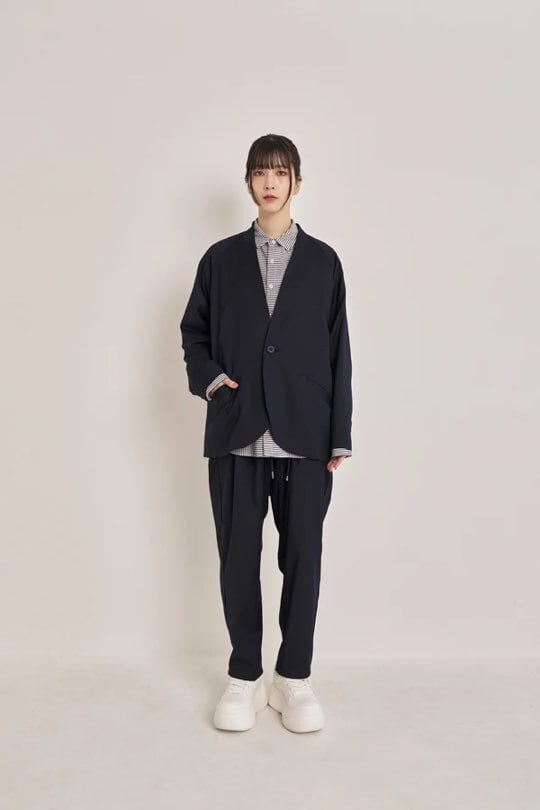 同素材のジャケットとセットアップで着用すれば、統一感のある洗練されたスタイリングが完成します。
