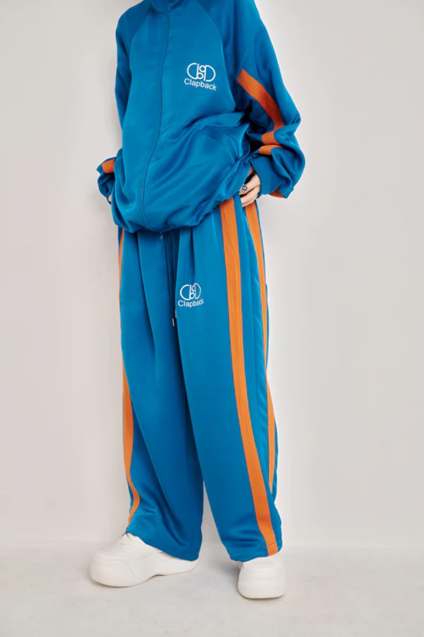 サイドのラインデザインと左ももの【Clapback】刺繍がアクセントになり、スポーティーながら洗練された印象に仕上げています。