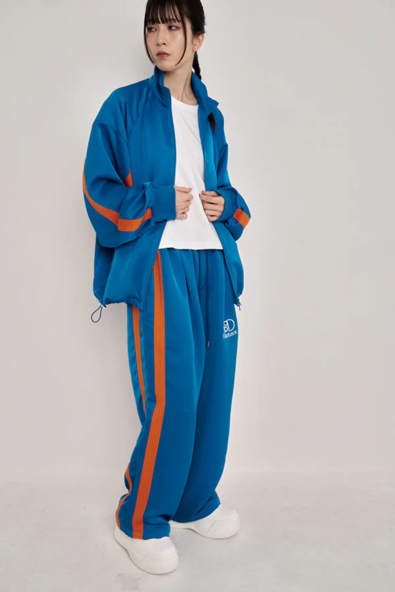 同素材のトラックジャケットとセットアップでの着用もおすすめ。