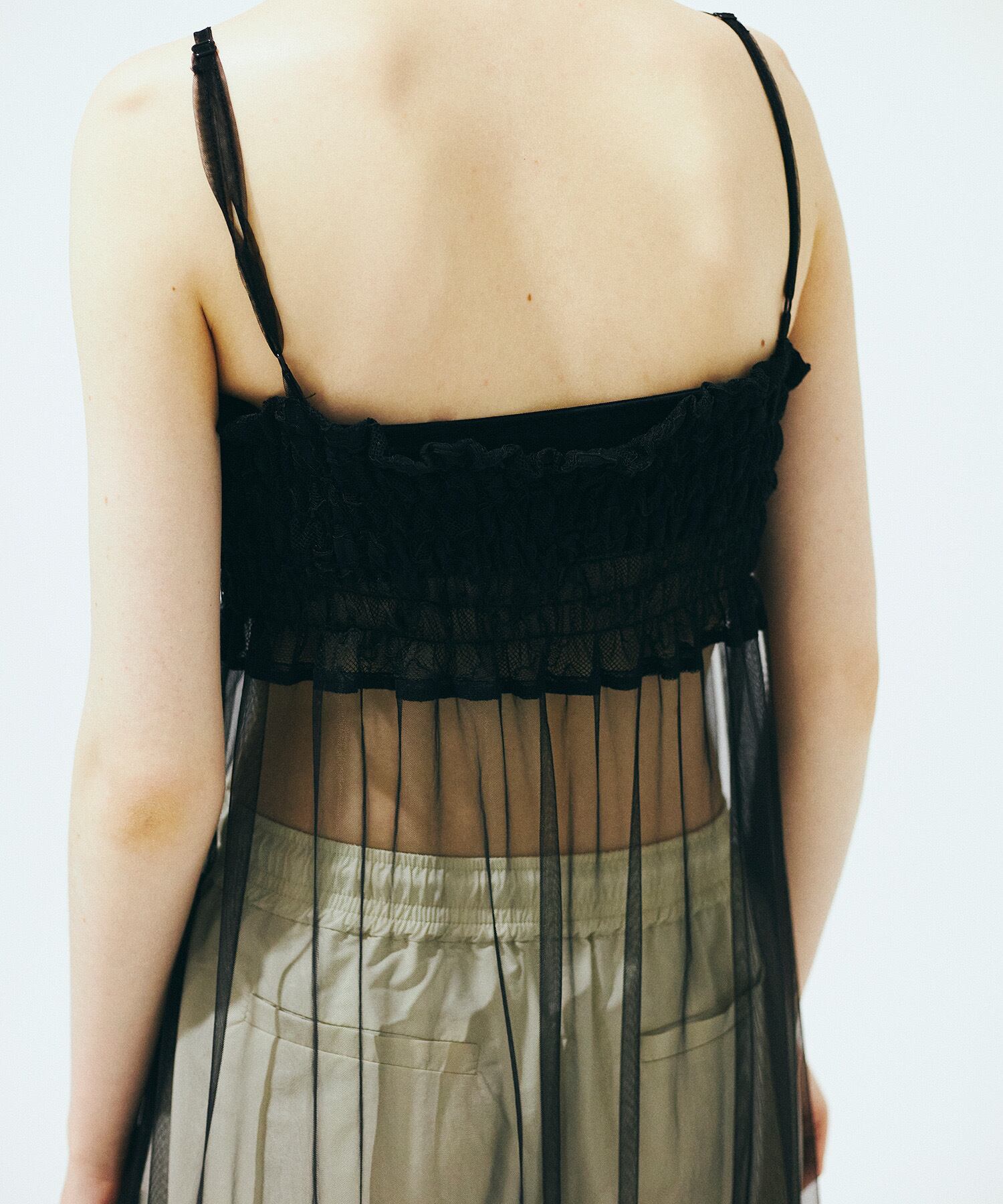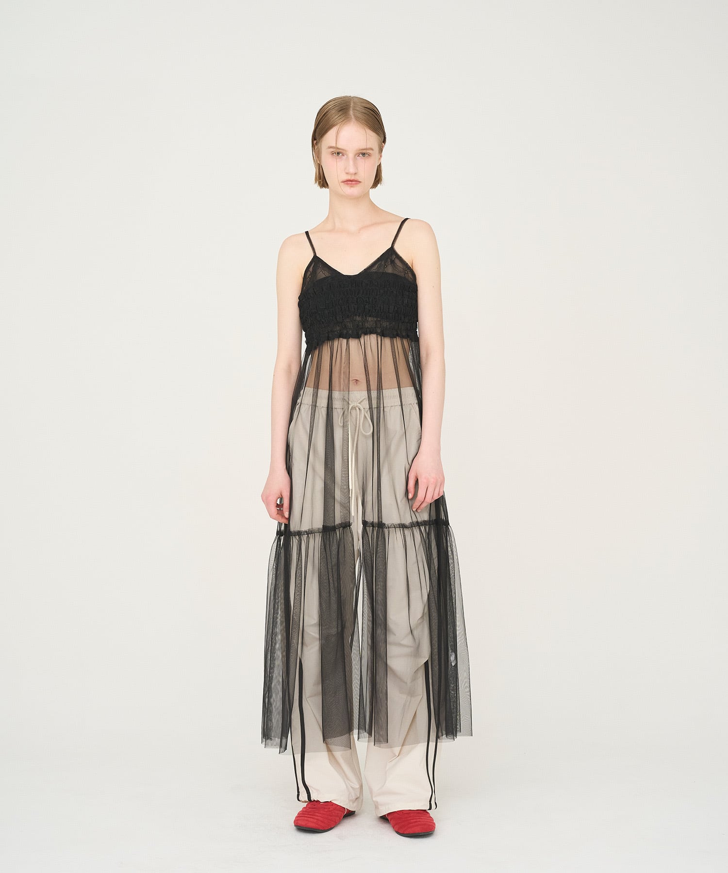 胸元はシャーリング×レースでフェミニンに仕立て、裾にかけてふわりと広がるチュールが軽やかな抜け感をプラス。