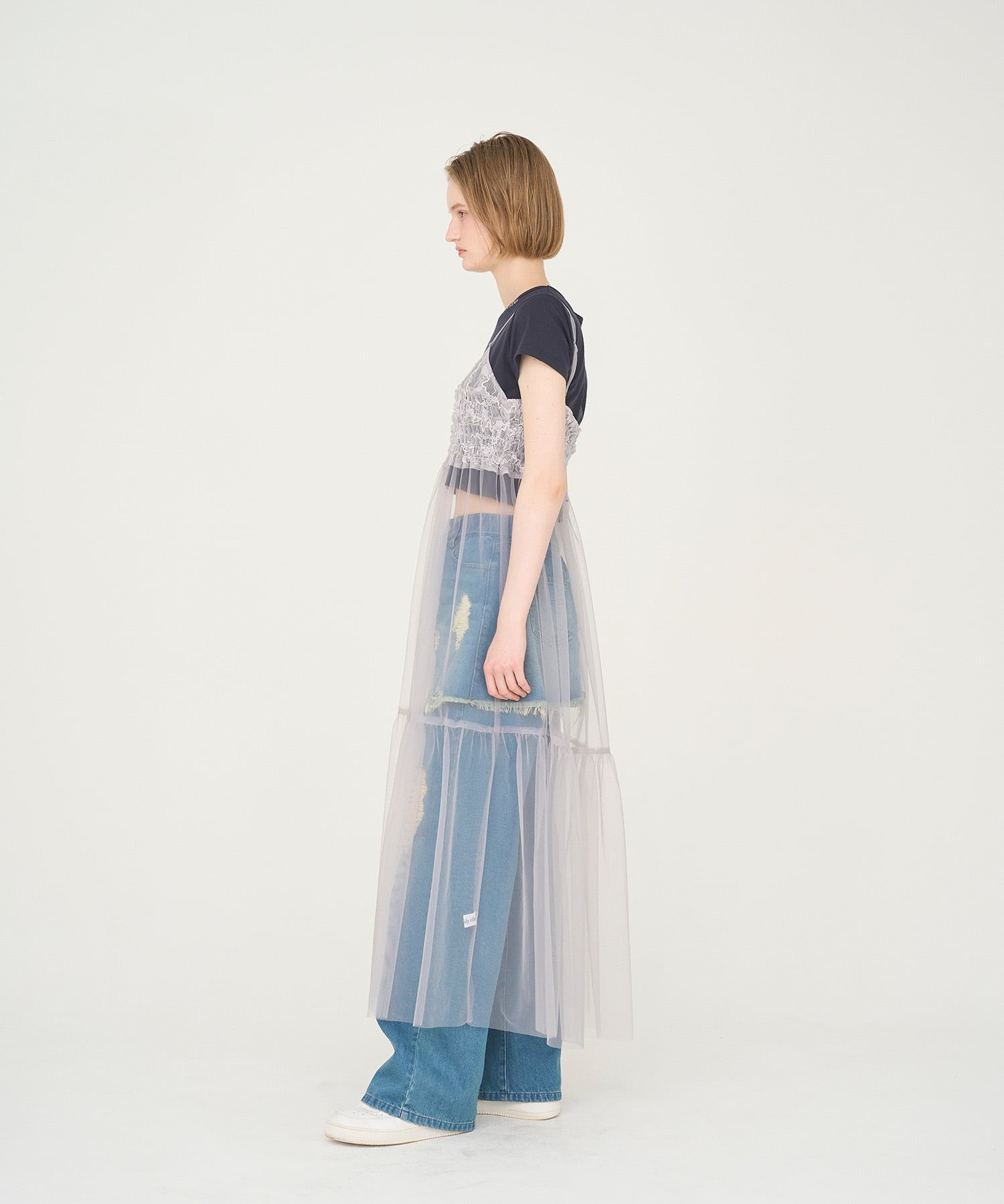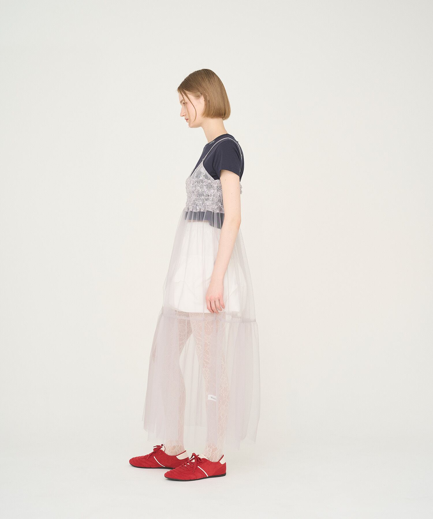 胸元はシャーリング×レースでフェミニンに仕立て、裾にかけてふわりと広がるチュールが軽やかな抜け感をプラス。