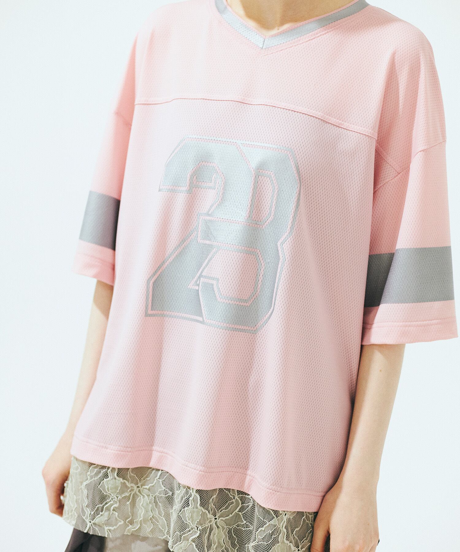 スポーティーなメッシュTシャツに、チュールレースのレイヤードディテールをプラスした「甘辛ミックス」が魅力の一枚。