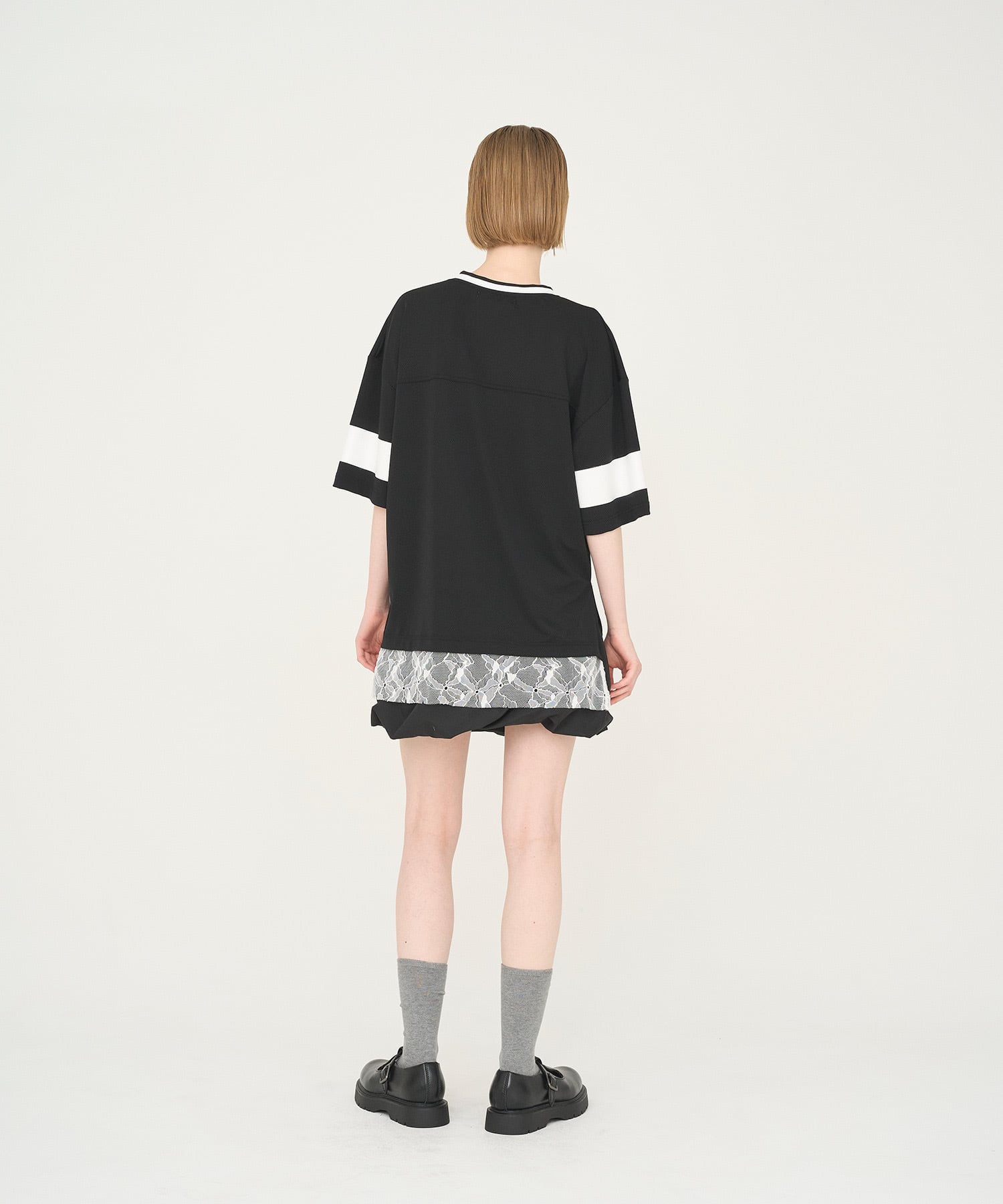 引き締まった印象のブラックに、ホワイトのナンバープリントとレースが映えるクールな一枚。