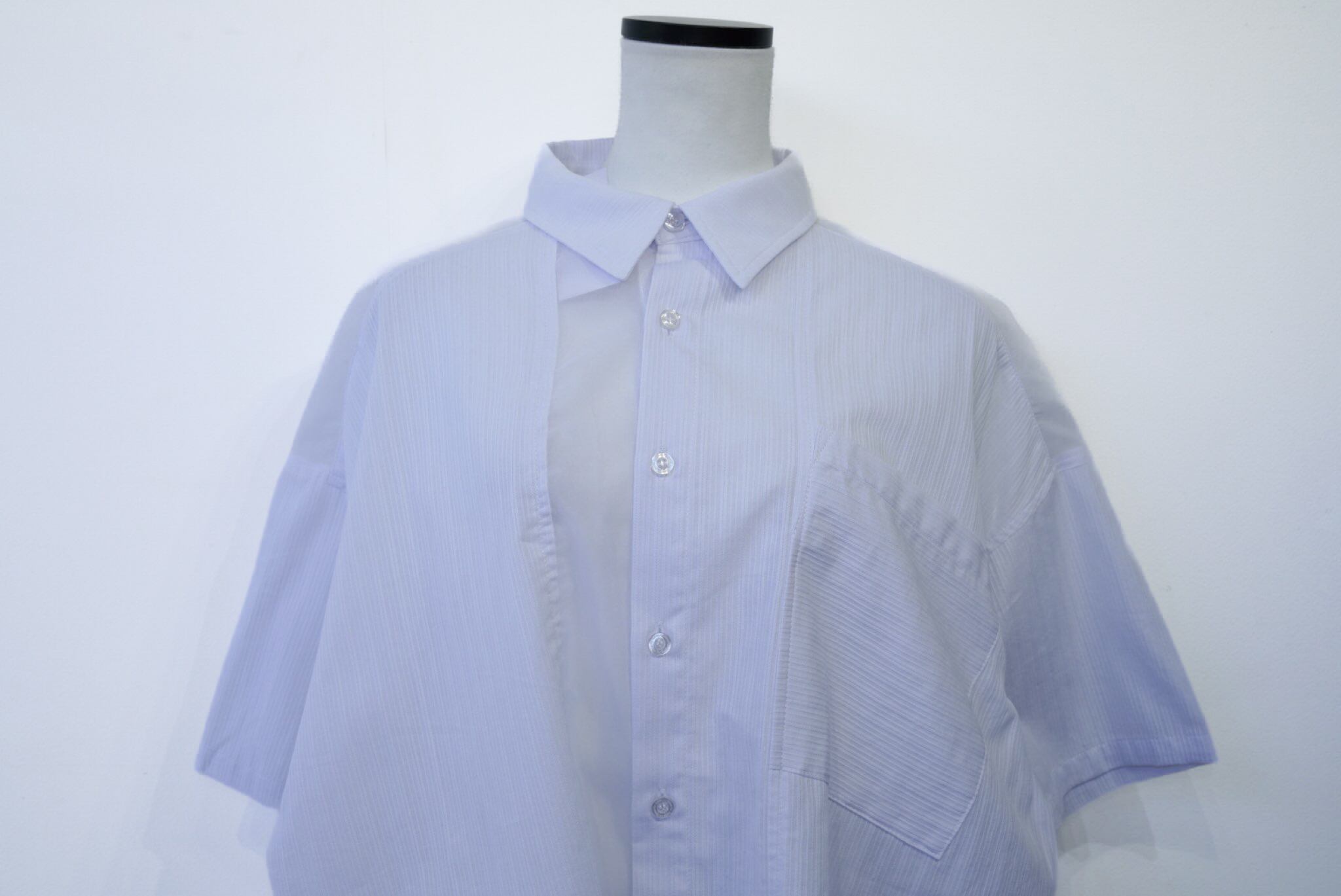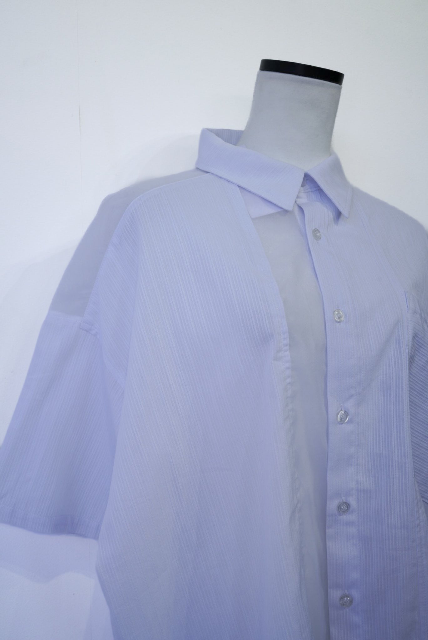 フロントとバックにほんのり透け感のある異素材を組み合わせた、モードな切り替え半袖シャツ。