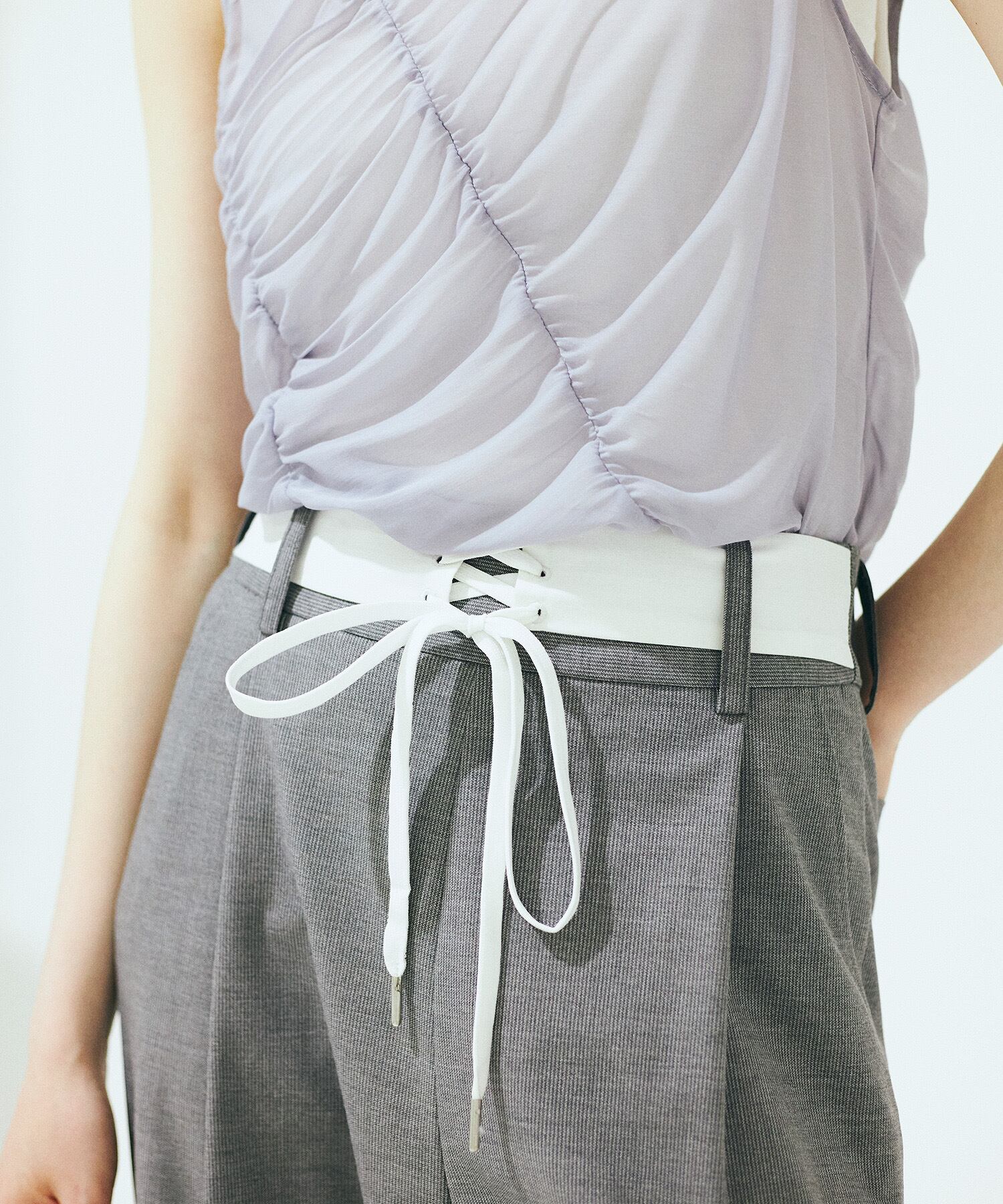 なめらかなシアー素材を斜めにたっぷりとギャザーを寄せた、レイヤードタンクトップ。