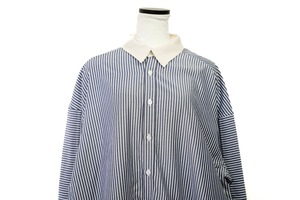 鮮やかなサックスブルーにホワイトのストライプが映える一枚。