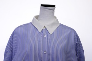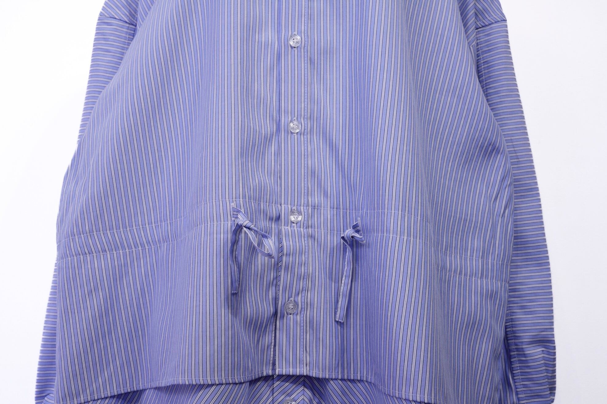 鮮やかなサックスブルーにホワイトのストライプが映える一枚。