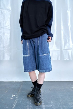 膝丈のワイドシルエットでラフに穿けつつ、スタッズディテールがエッジを効かせます。