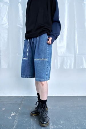 存在感あるスタッズをフロントポケットに並べた、デニム素材のハーフパンツ。