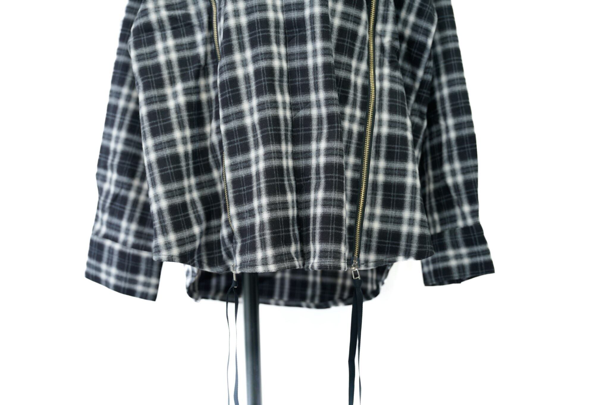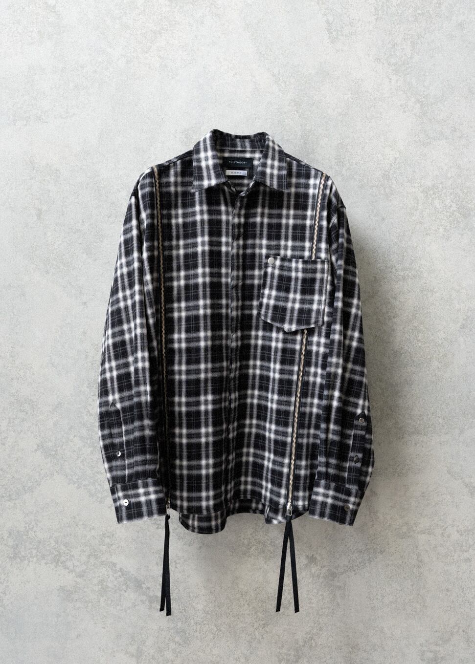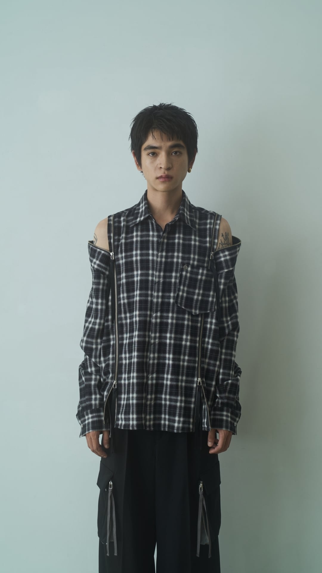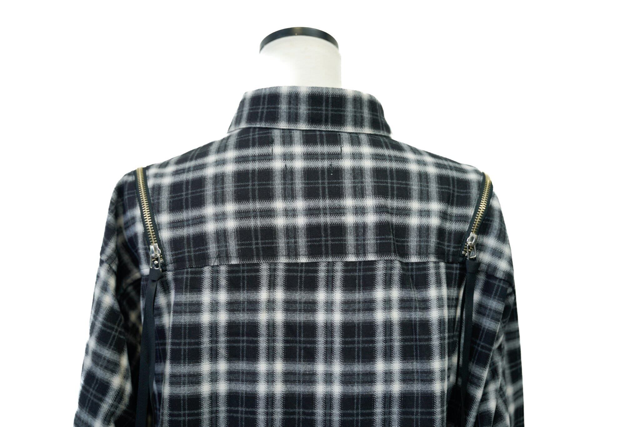 ジップのラインが印象的な、モードな雰囲気を纏ったチェックシャツ。