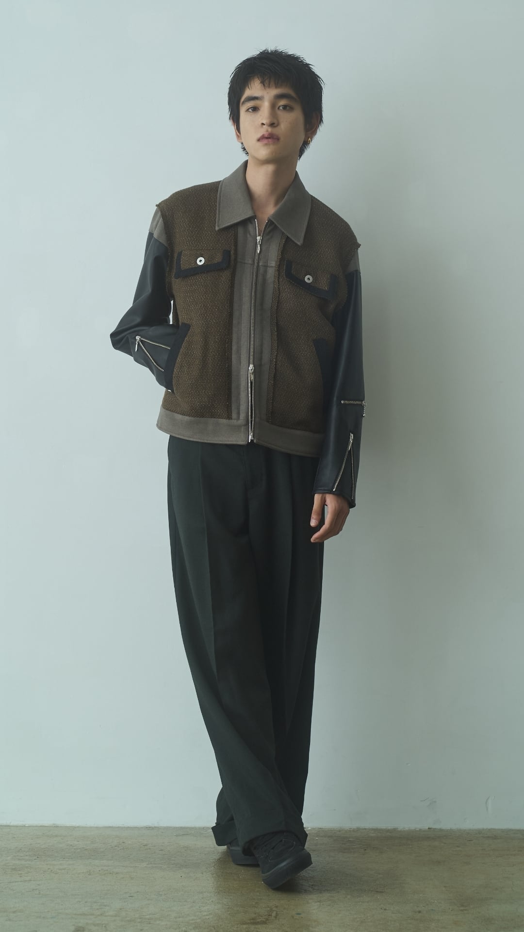 • インナーに薄手のカットソーやシャツを合わせ、ジップを部分的に開けてレイヤードを表現
