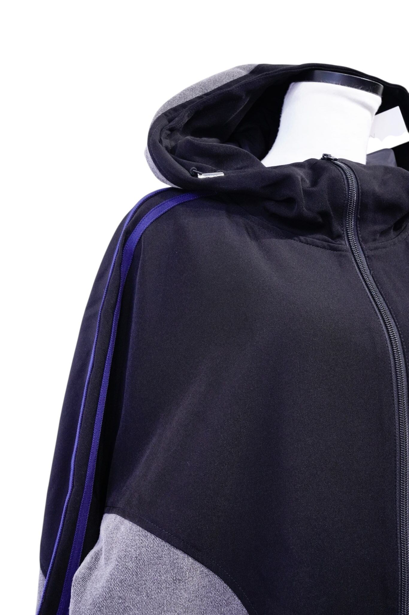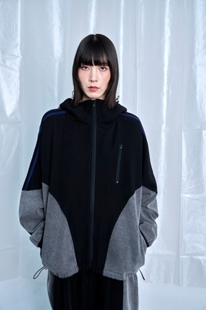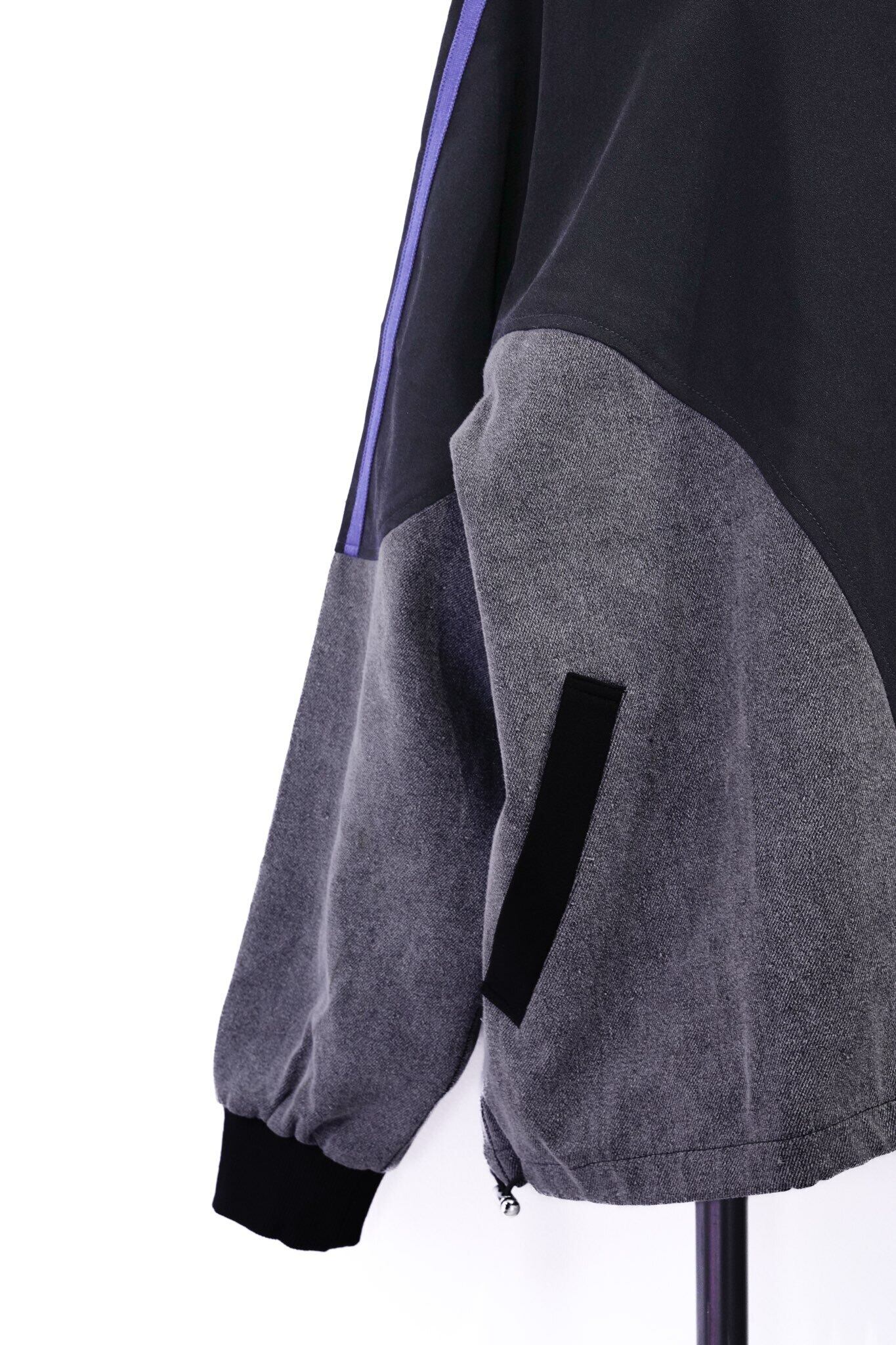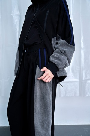 モノトーンの配色に、さりげなく効かせたパープルラインが映えるシックなブルゾン。