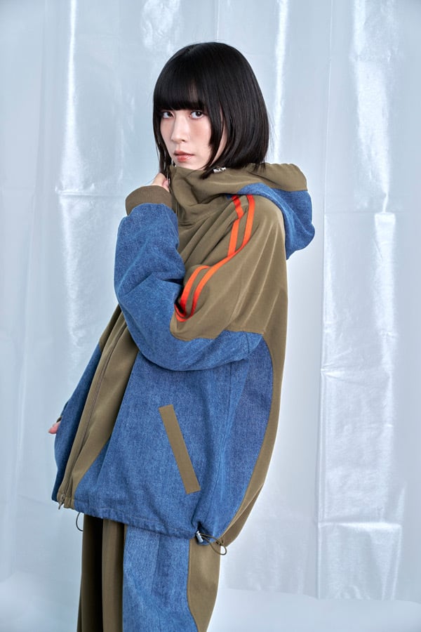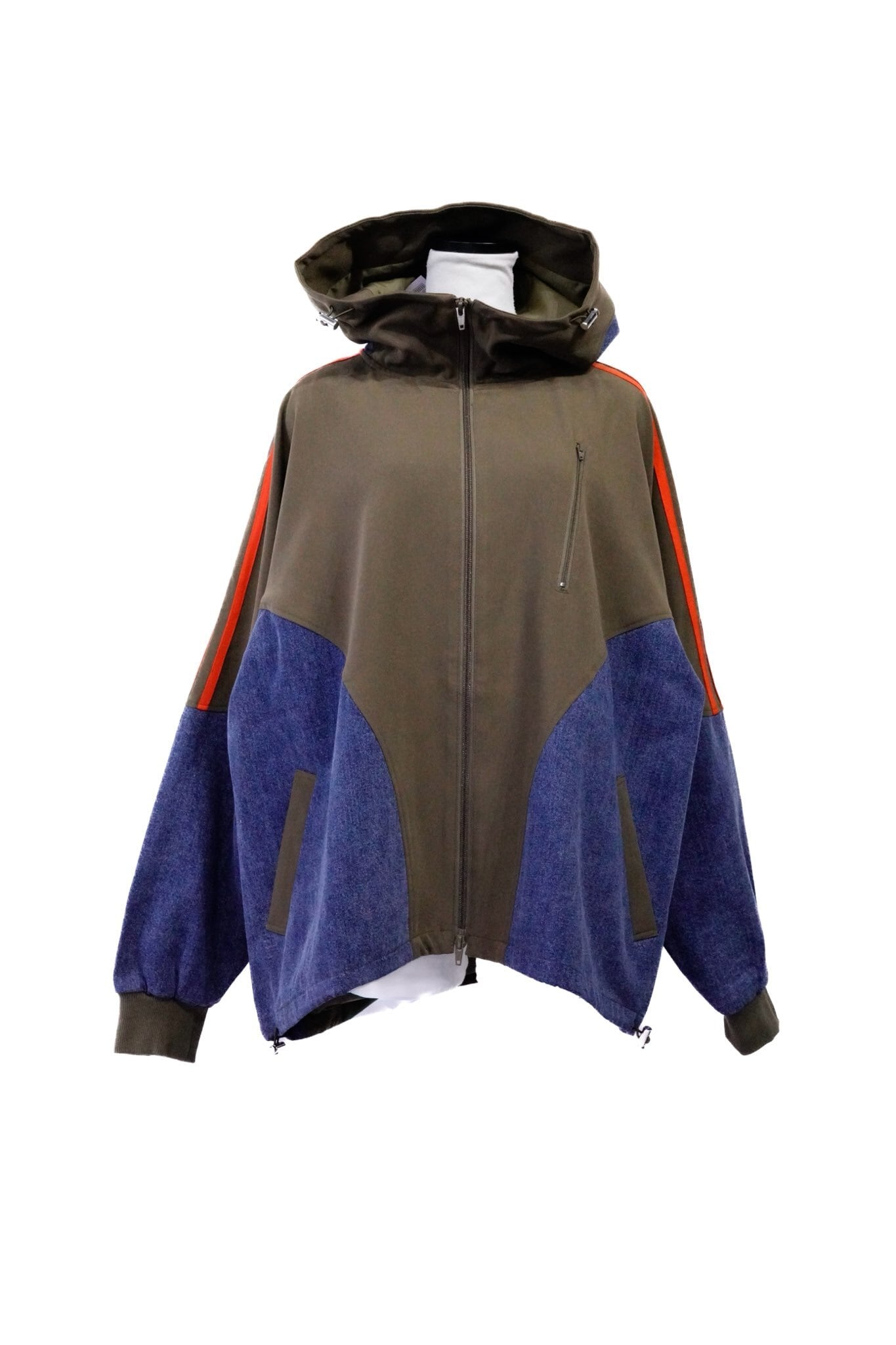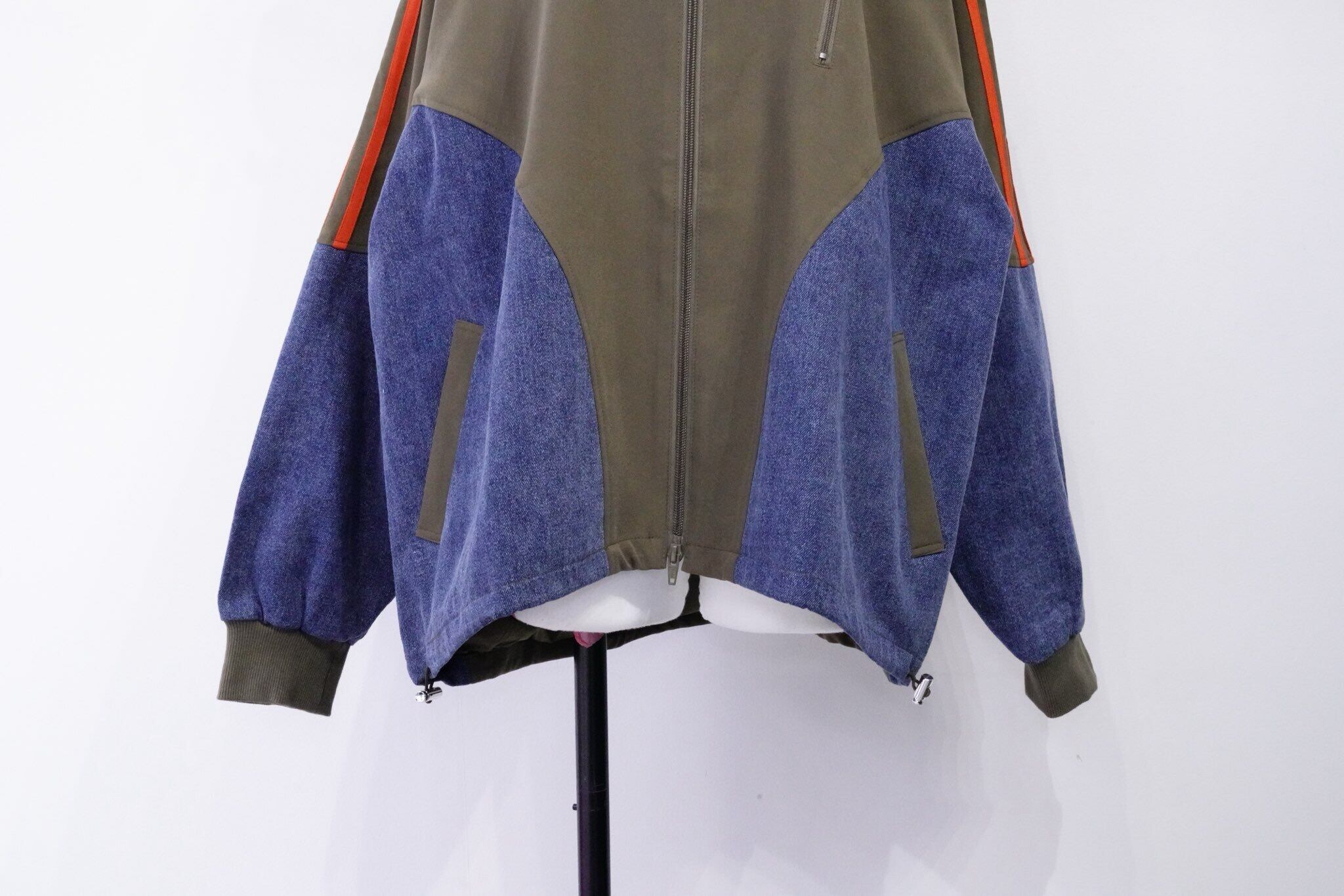 ミリタリーテイストのカーキをベースに、デニム調ブルーの切替と鮮やかなレッドのラインを走らせた存在感あるブルゾン。