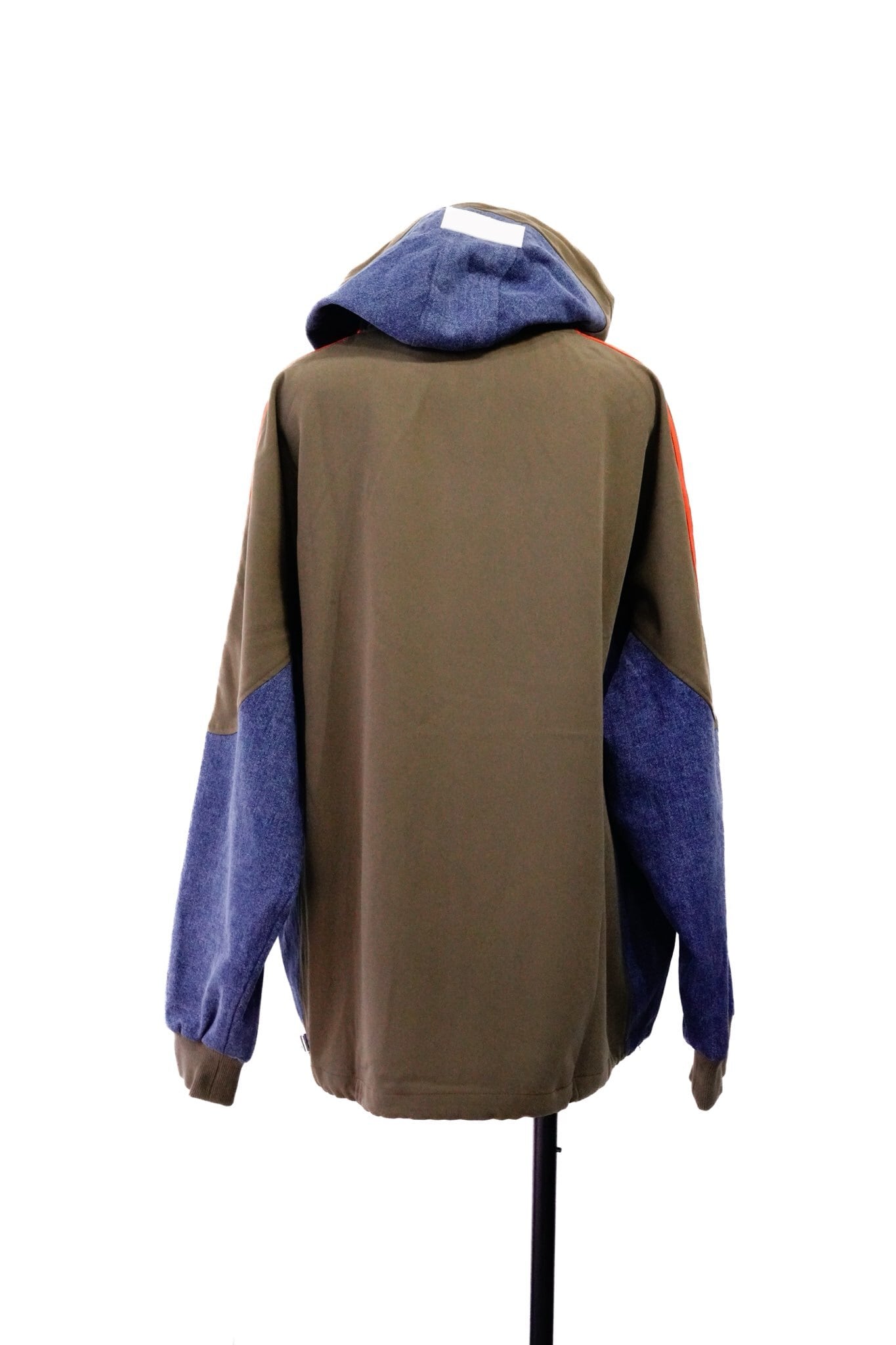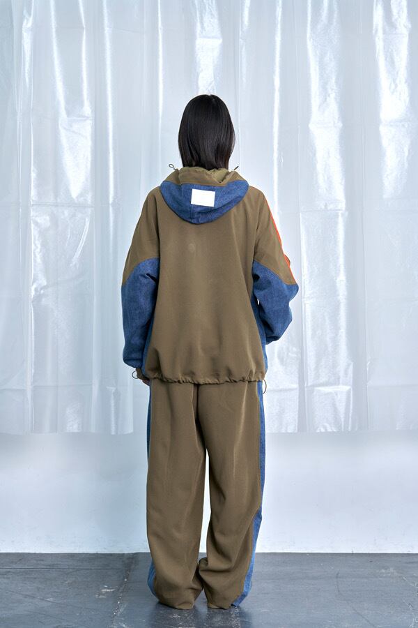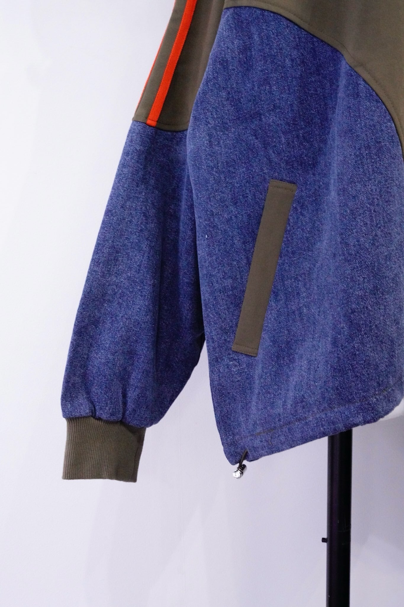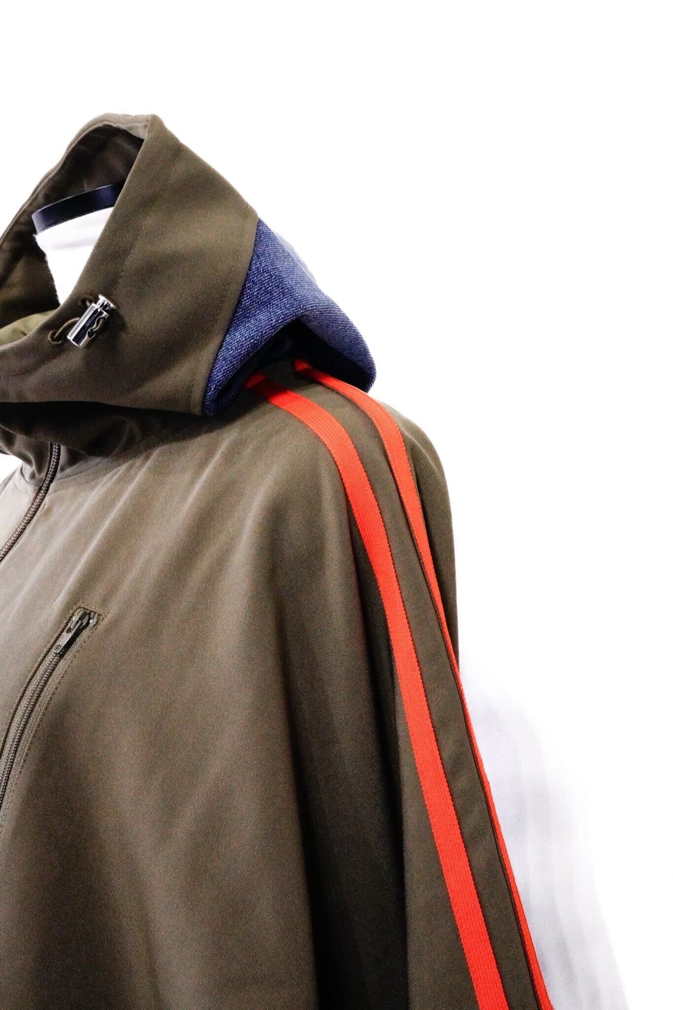 ミリタリーテイストのカーキをベースに、デニム調ブルーの切替と鮮やかなレッドのラインを走らせた存在感あるブルゾン。