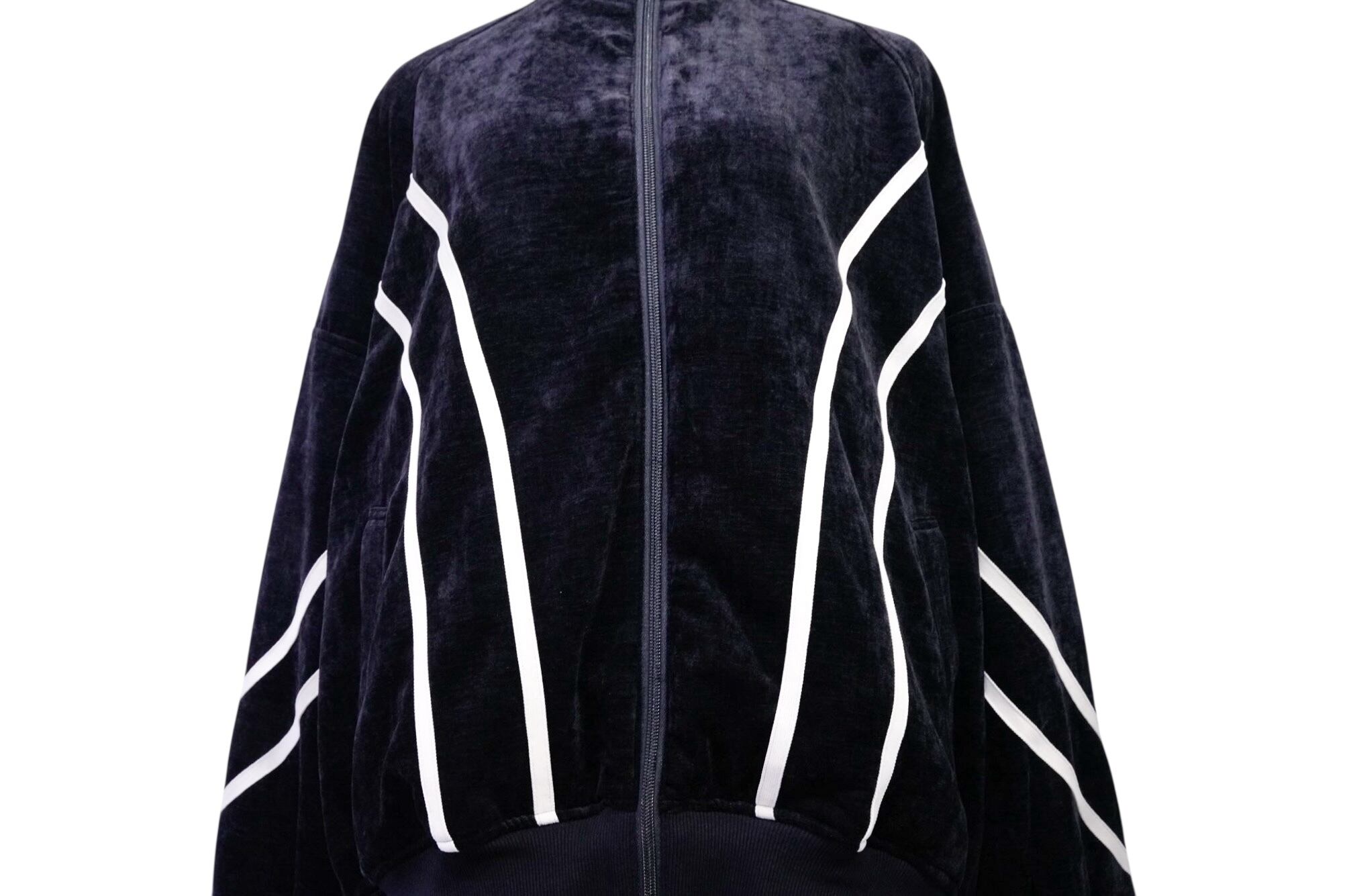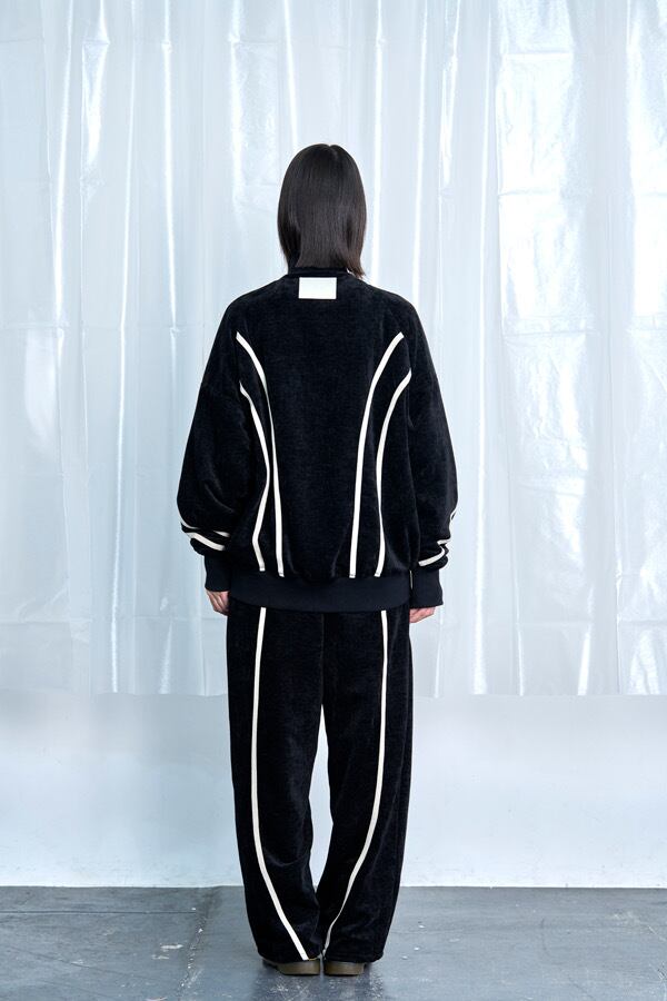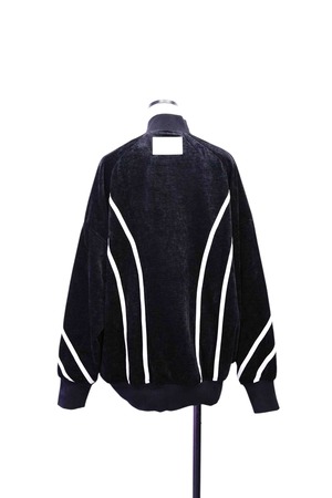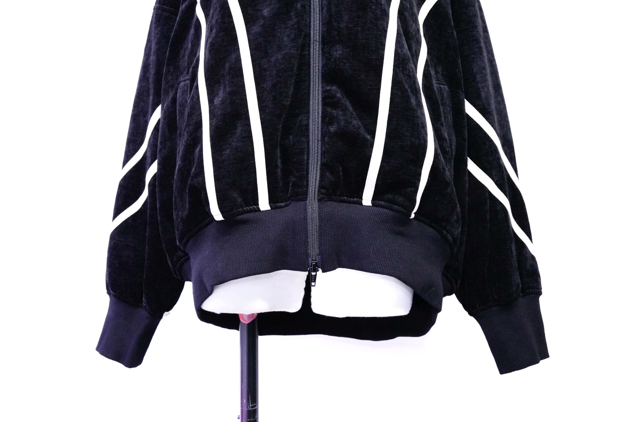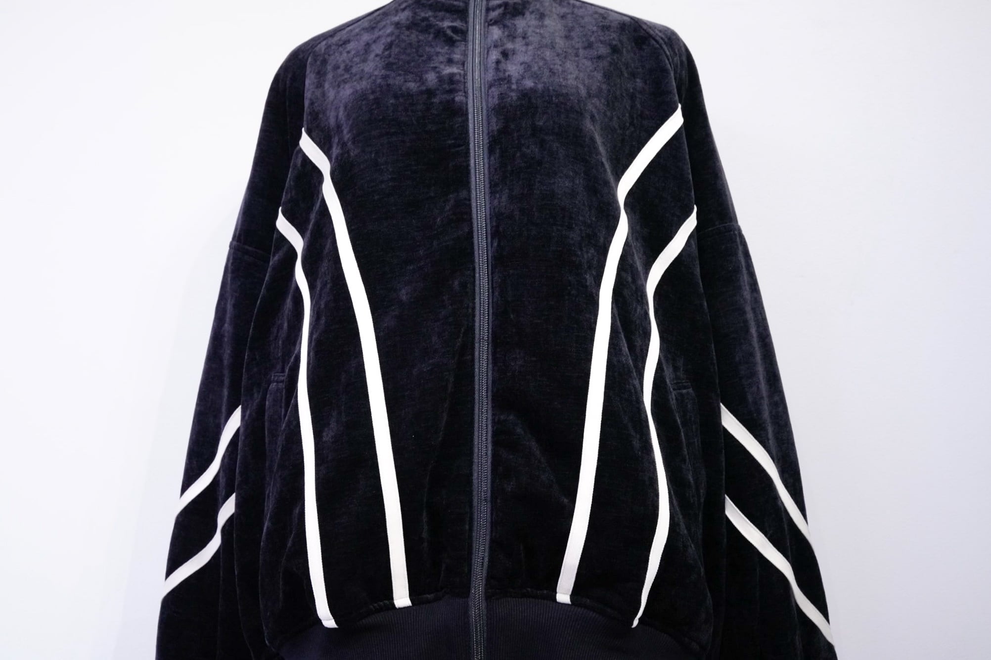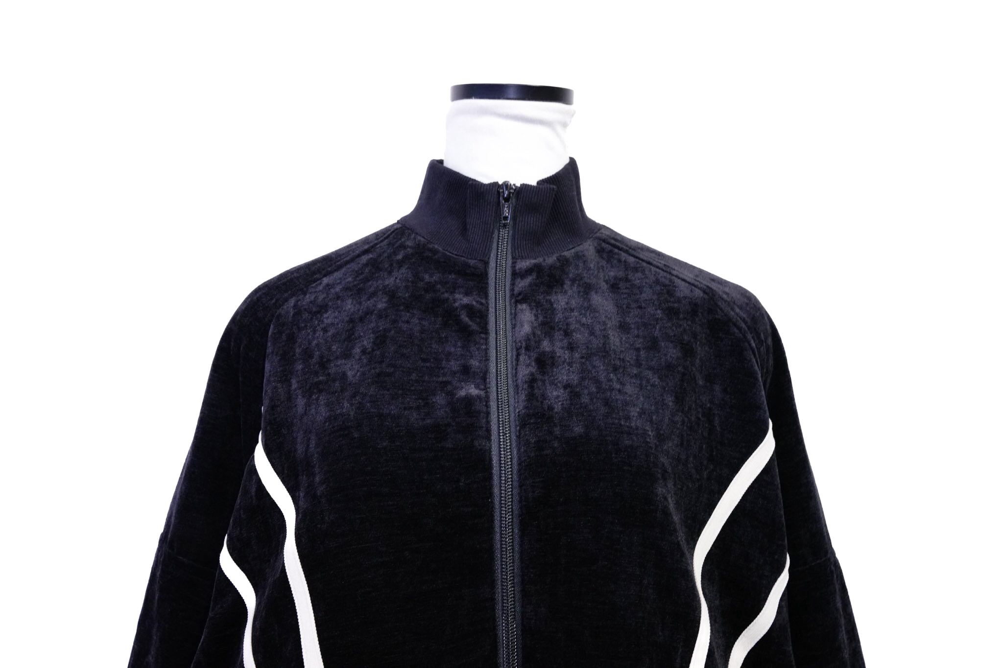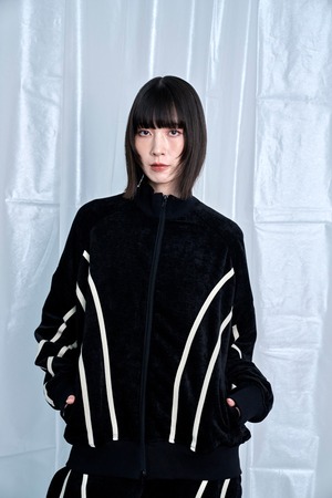 艶やかなブラックベロアにホワイトのラインを走らせた、モード感漂うトラックジャケット。