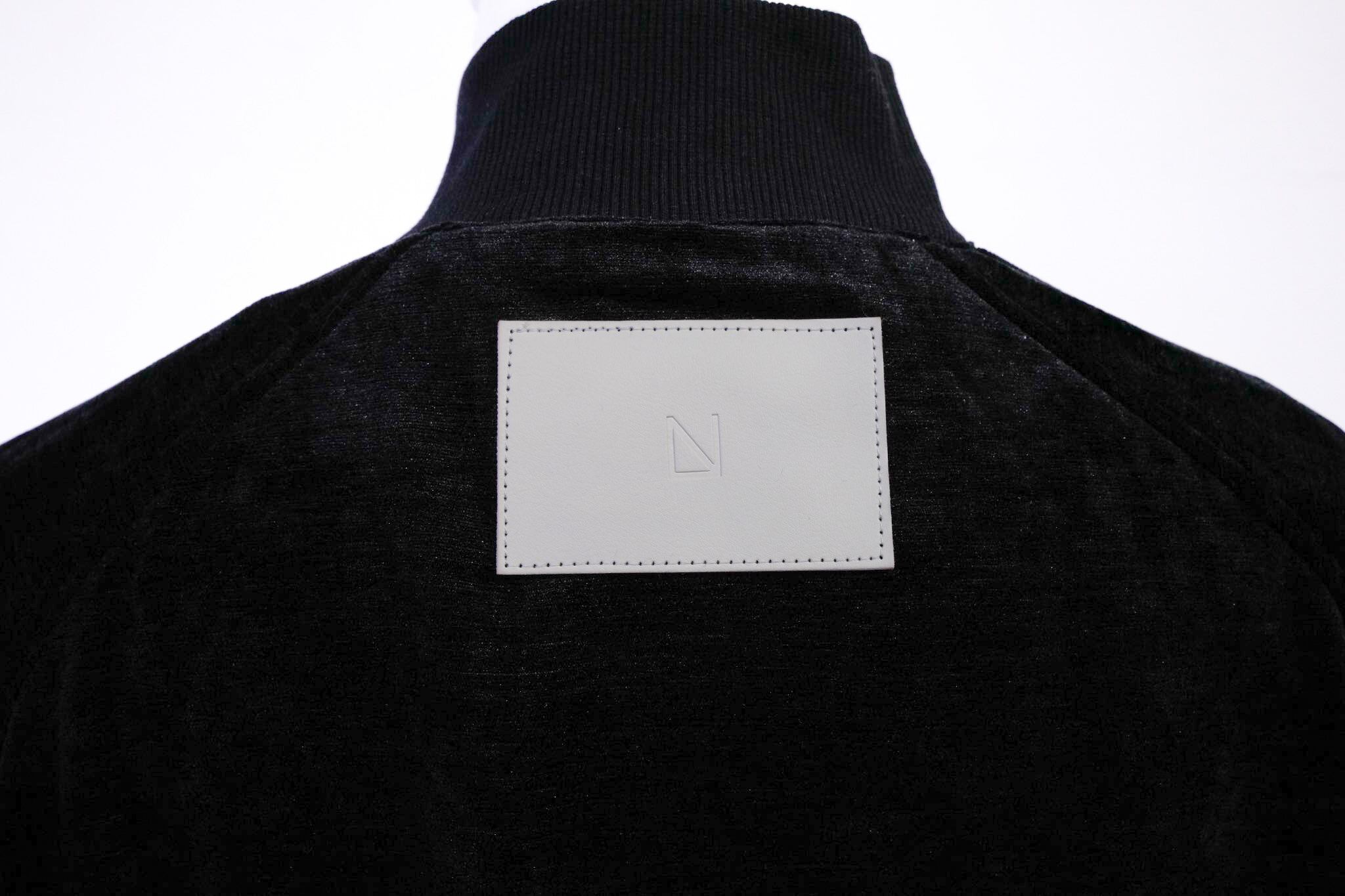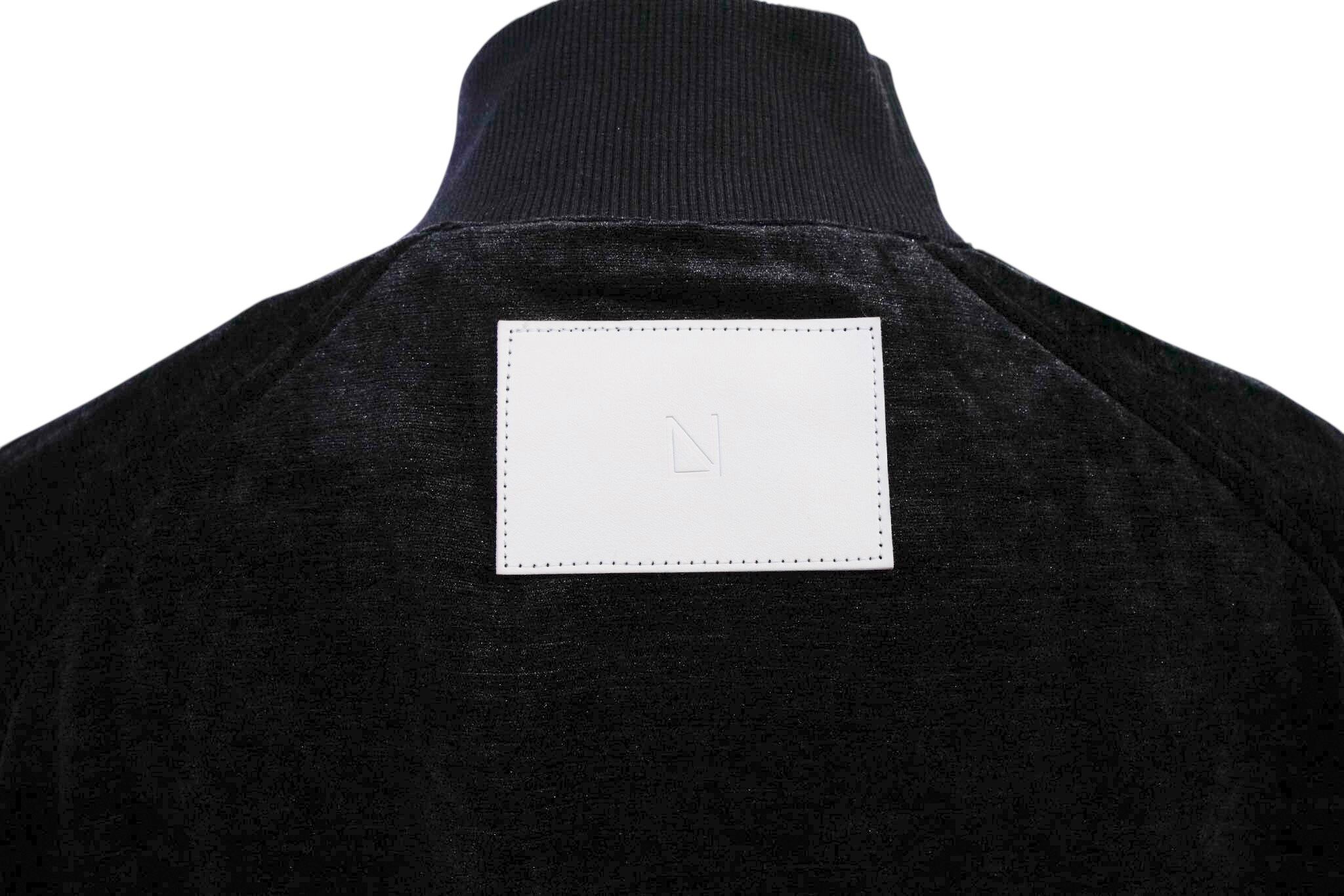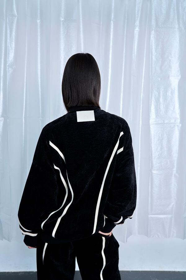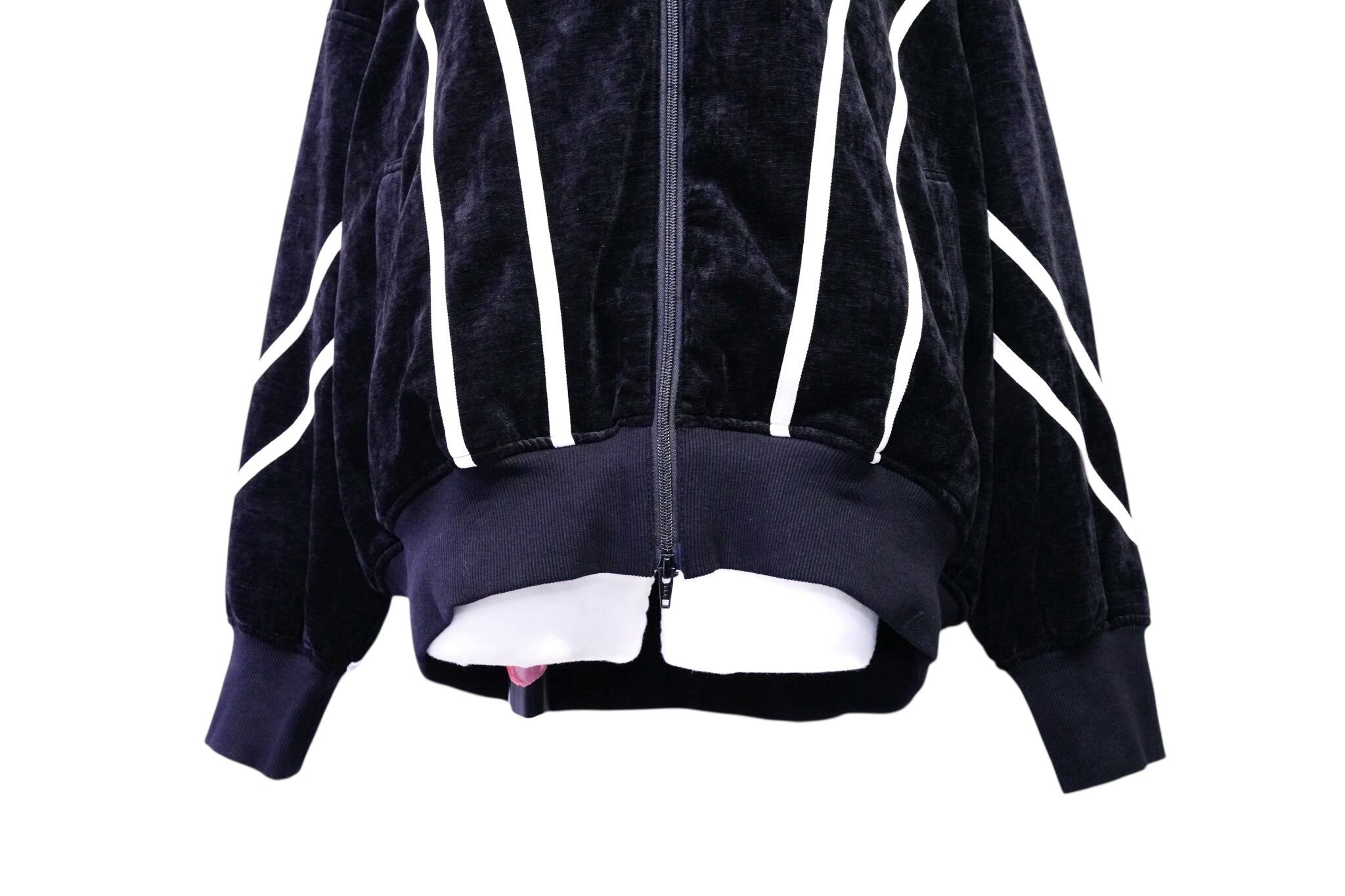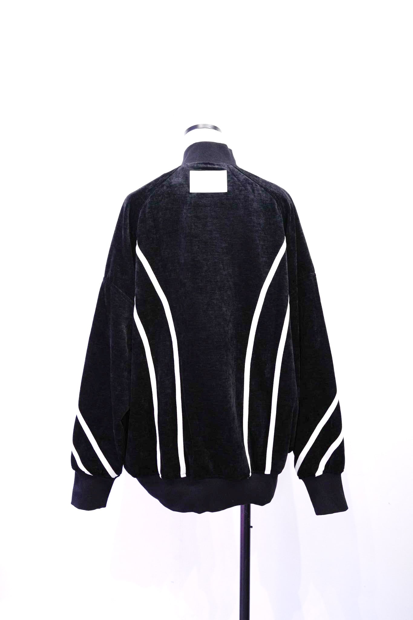 艶やかなブラックベロアにホワイトのラインを走らせた、モード感漂うトラックジャケット。
