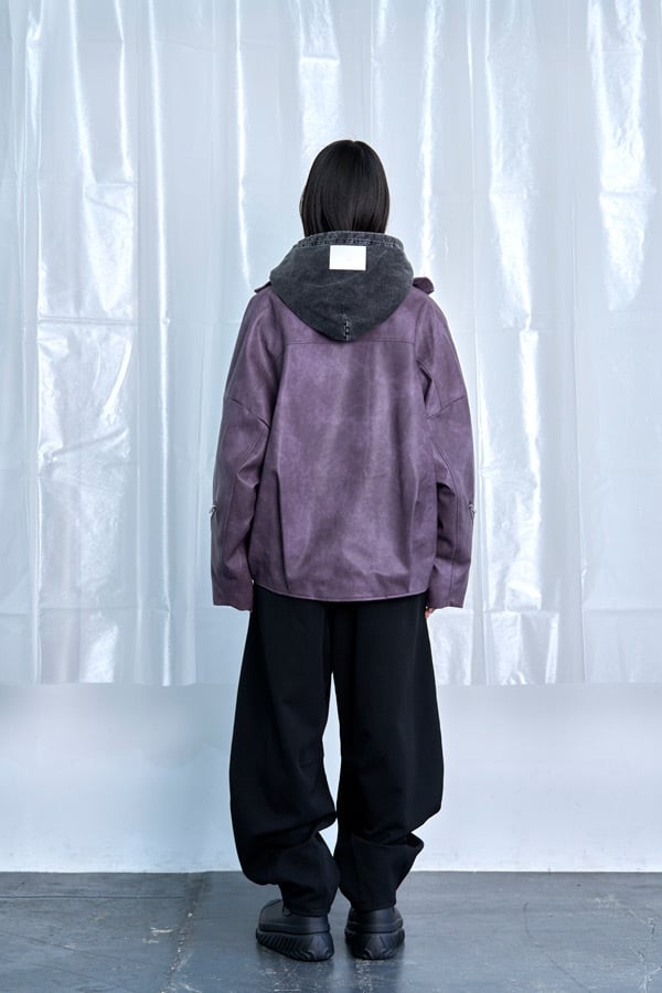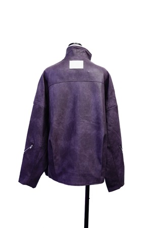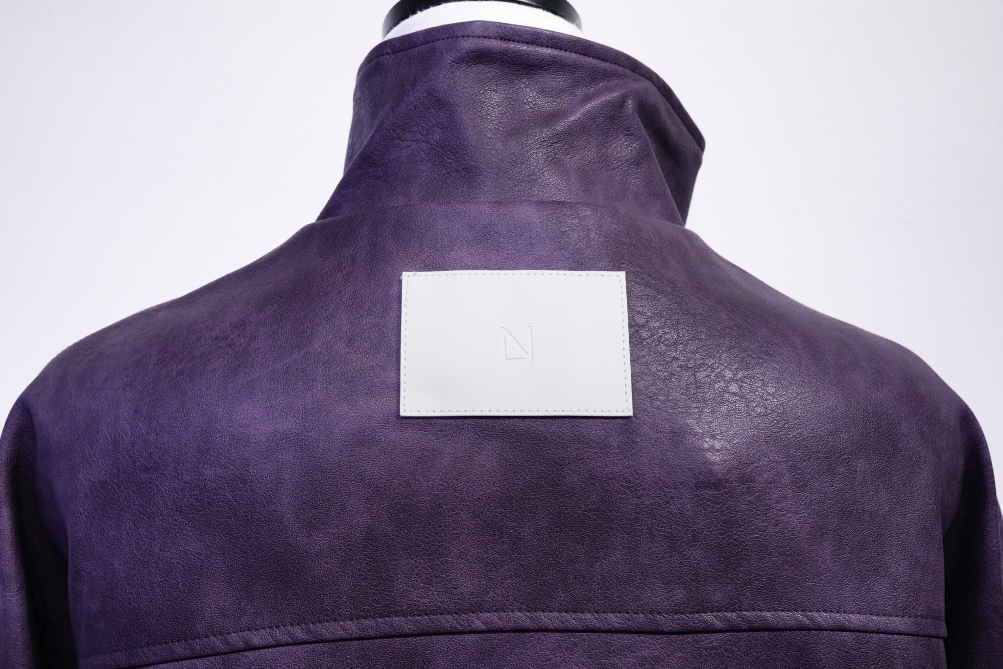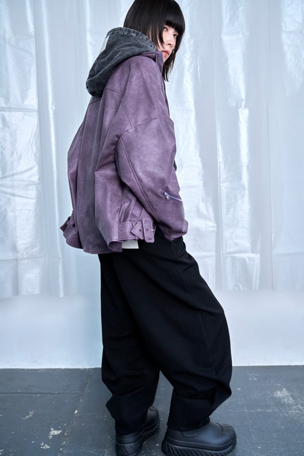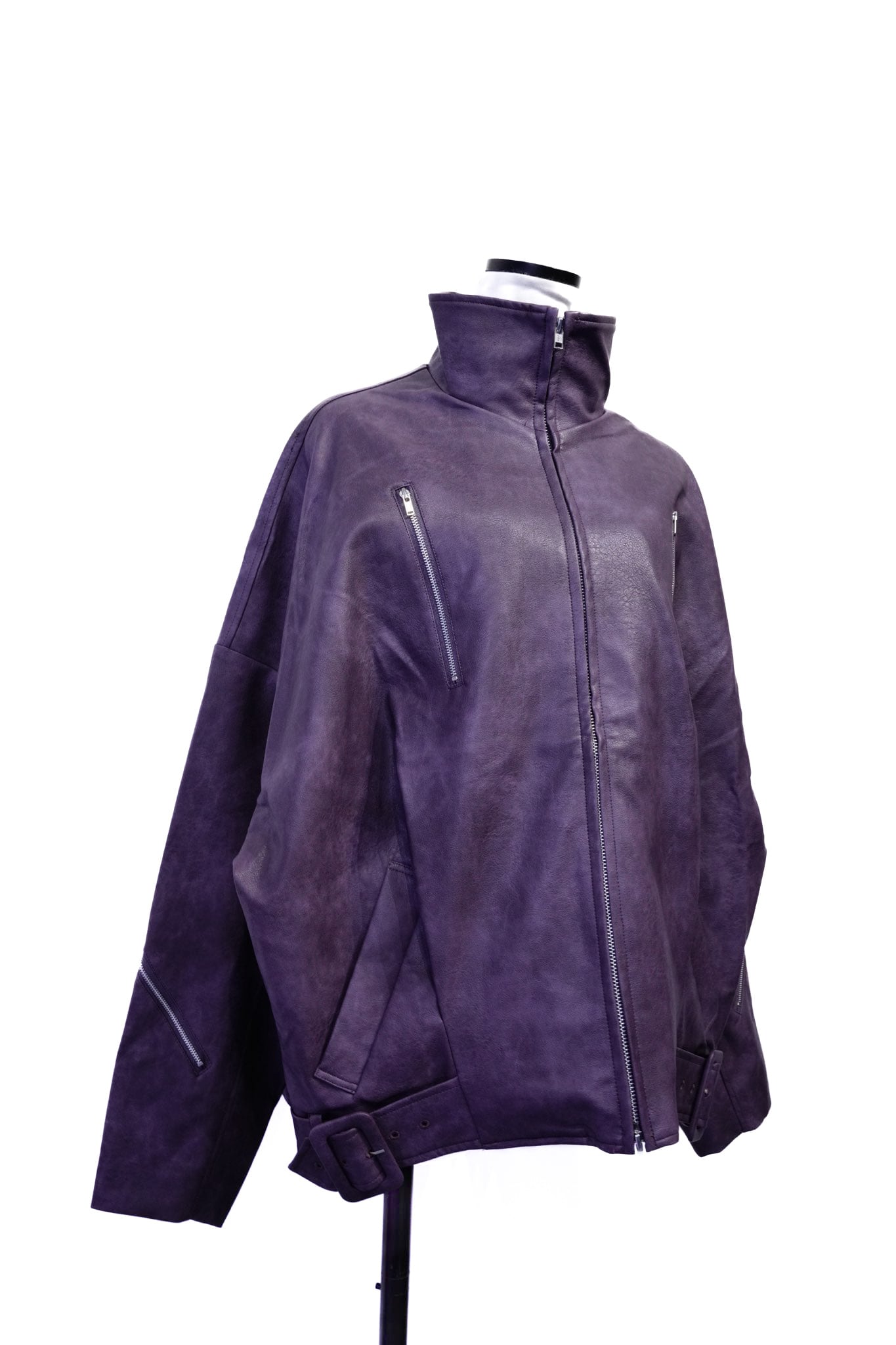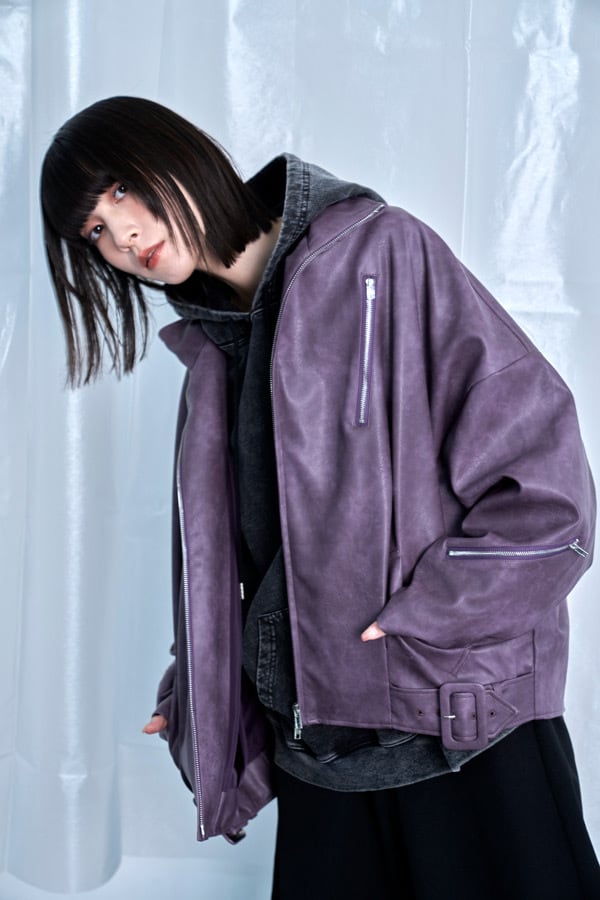 深みのあるパープルカラーが印象的な合皮ライダース。