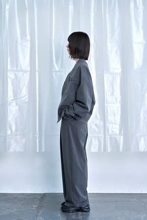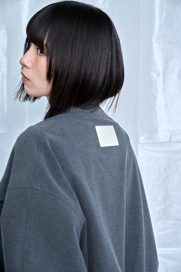 胸元の片側に配置されたフラップポケットがアクセントとなり、シンプルながら個性を引き立てます。