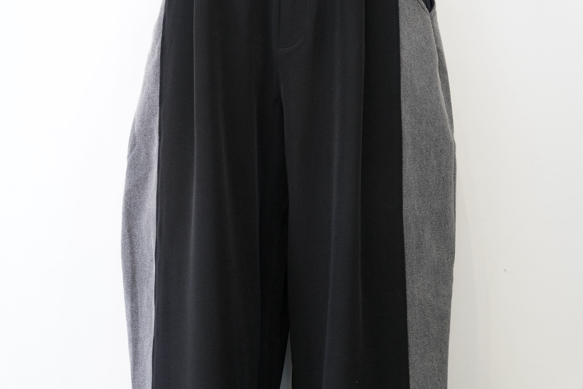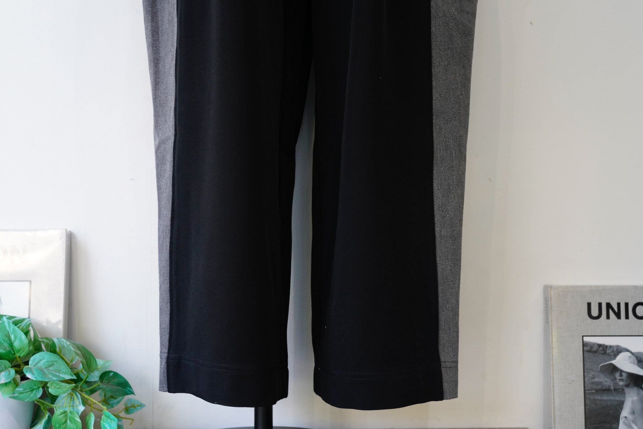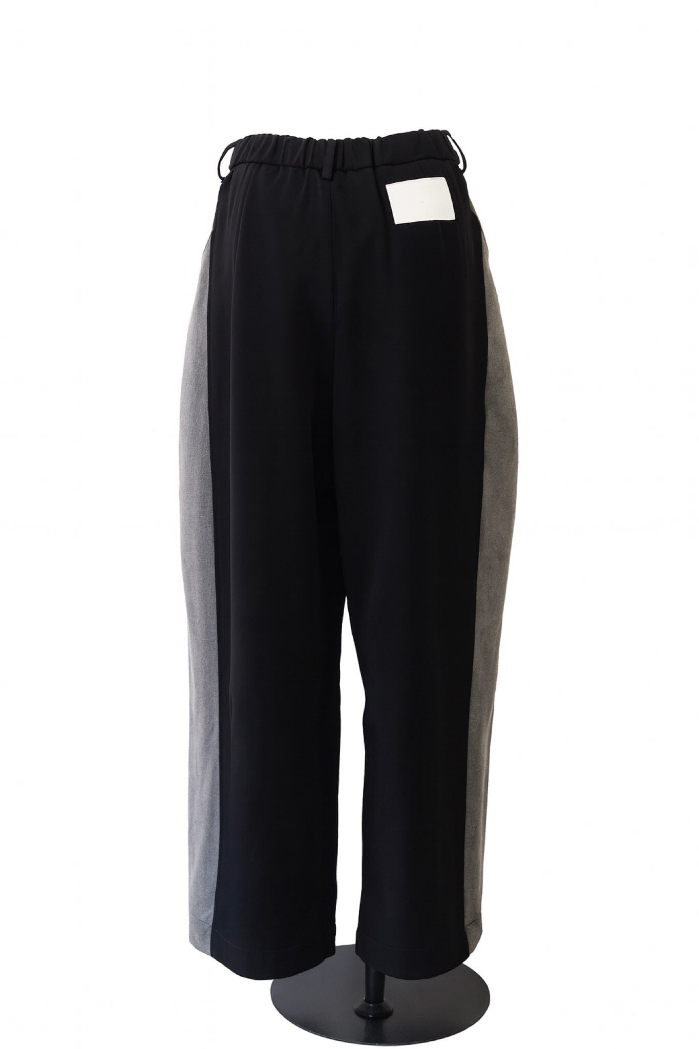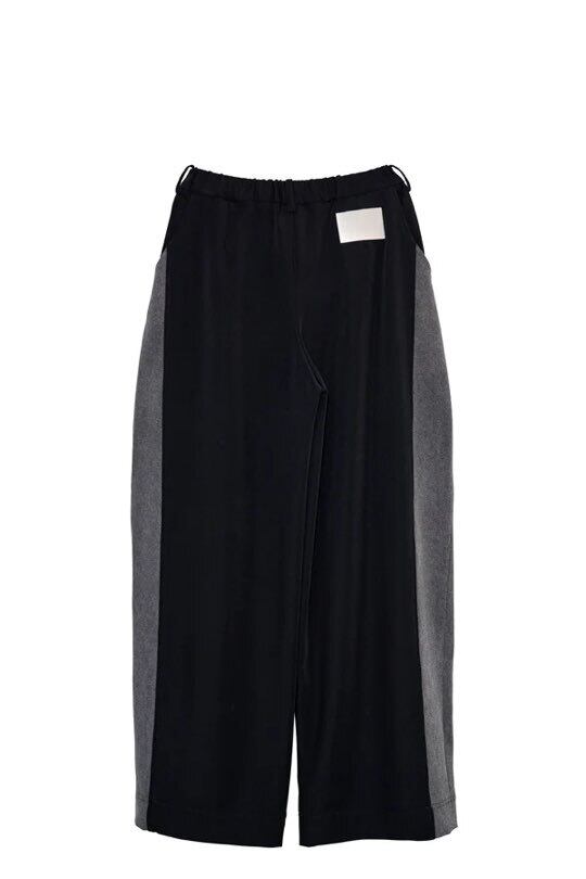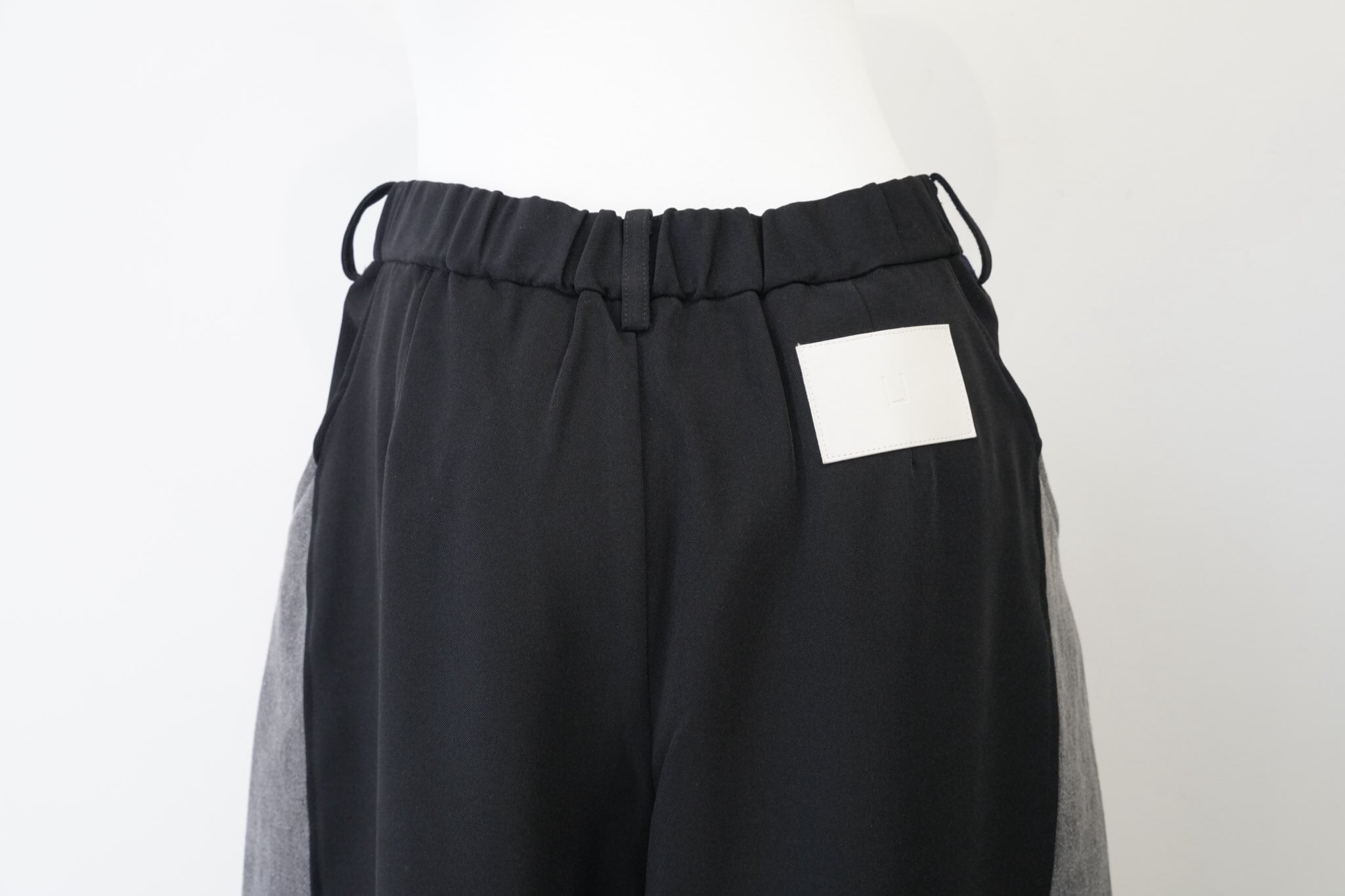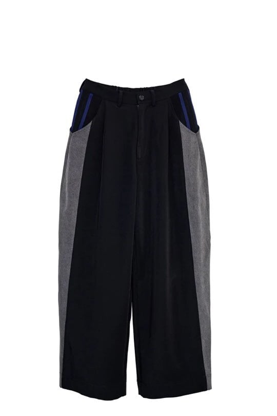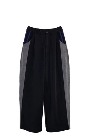 ブラックをベースに、両サイドをグレーで切り替え、ウエスト部分にはブルーのラインを効かせたシックなワイドパンツ。