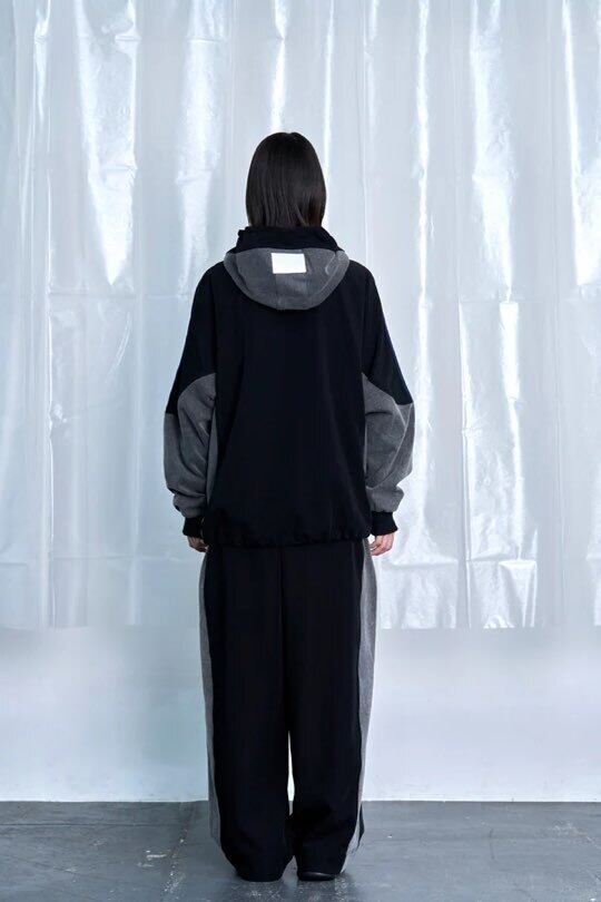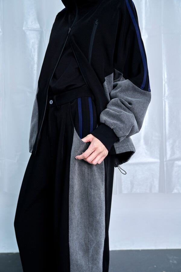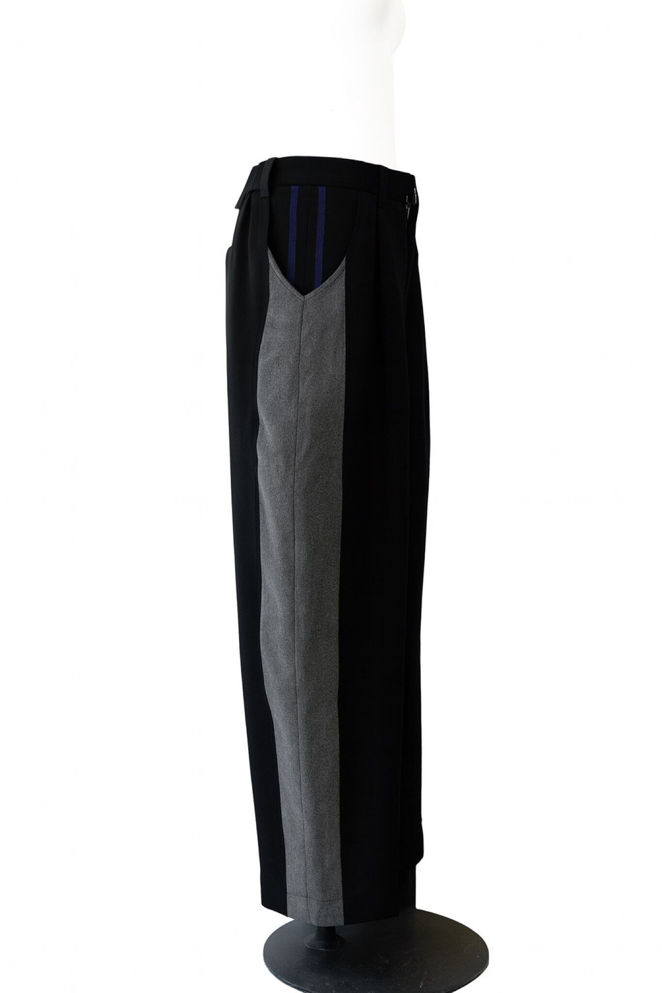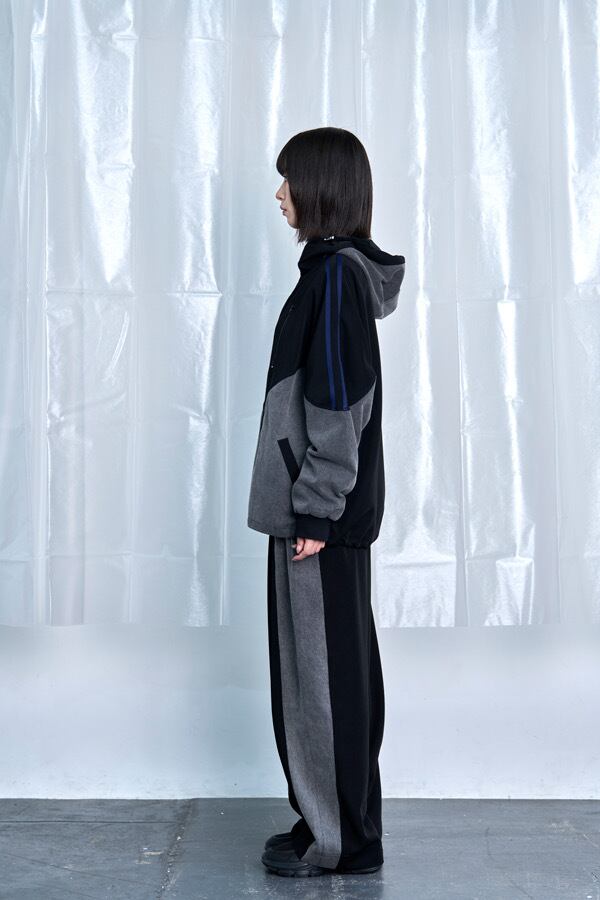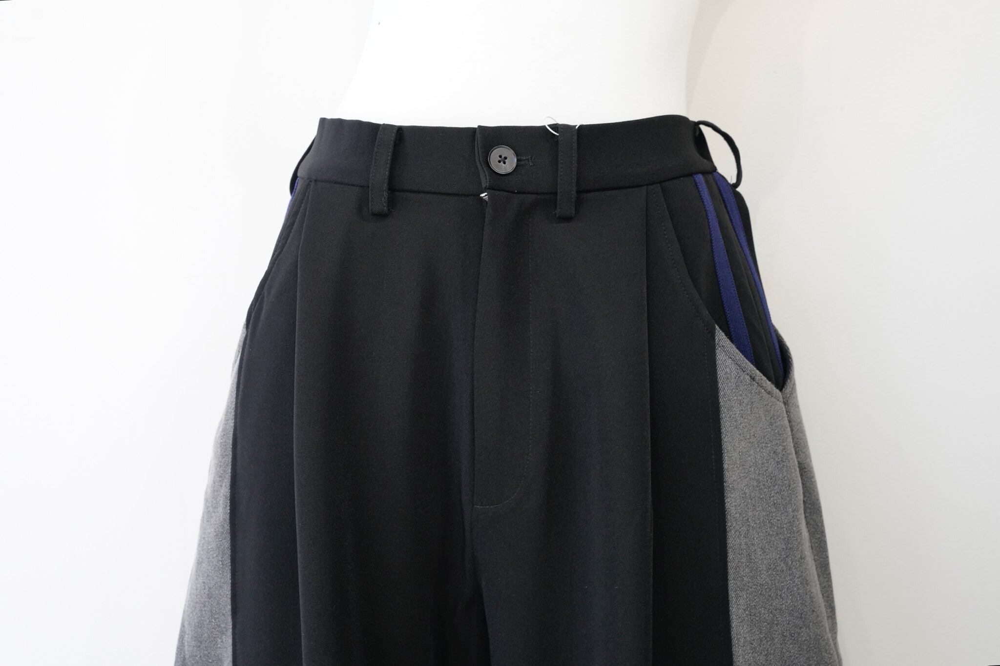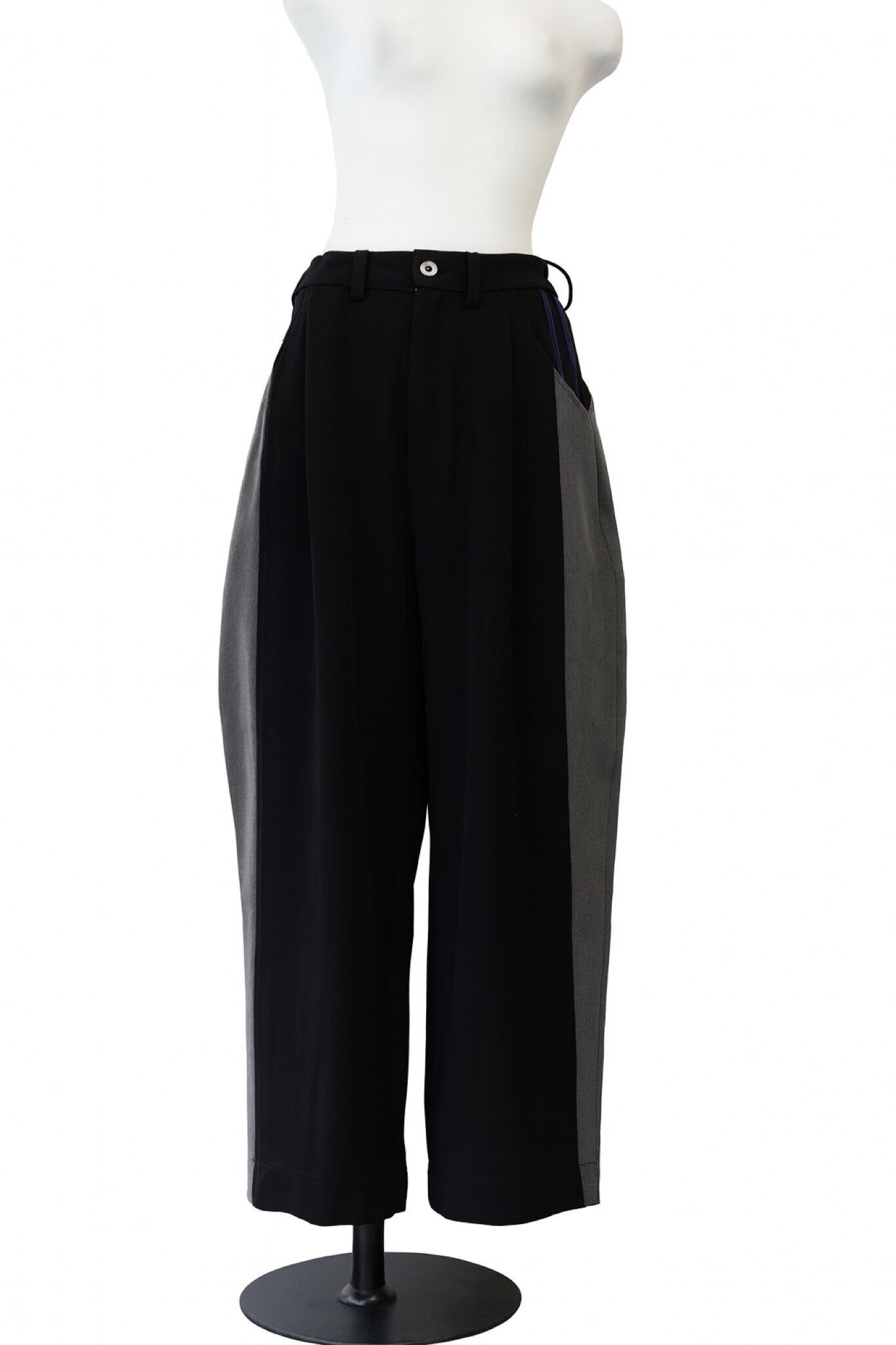ブラックをベースに、両サイドをグレーで切り替え、ウエスト部分にはブルーのラインを効かせたシックなワイドパンツ。