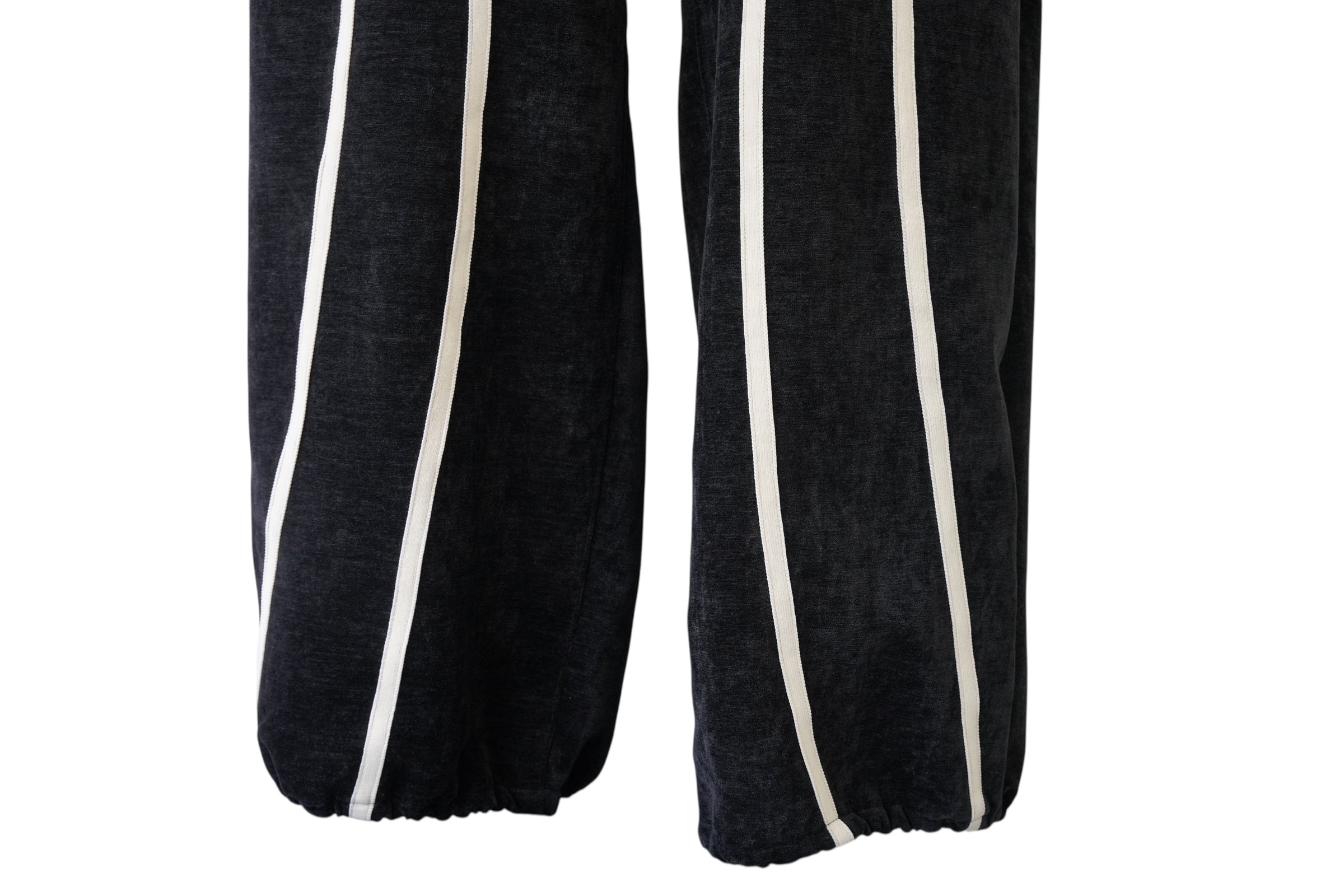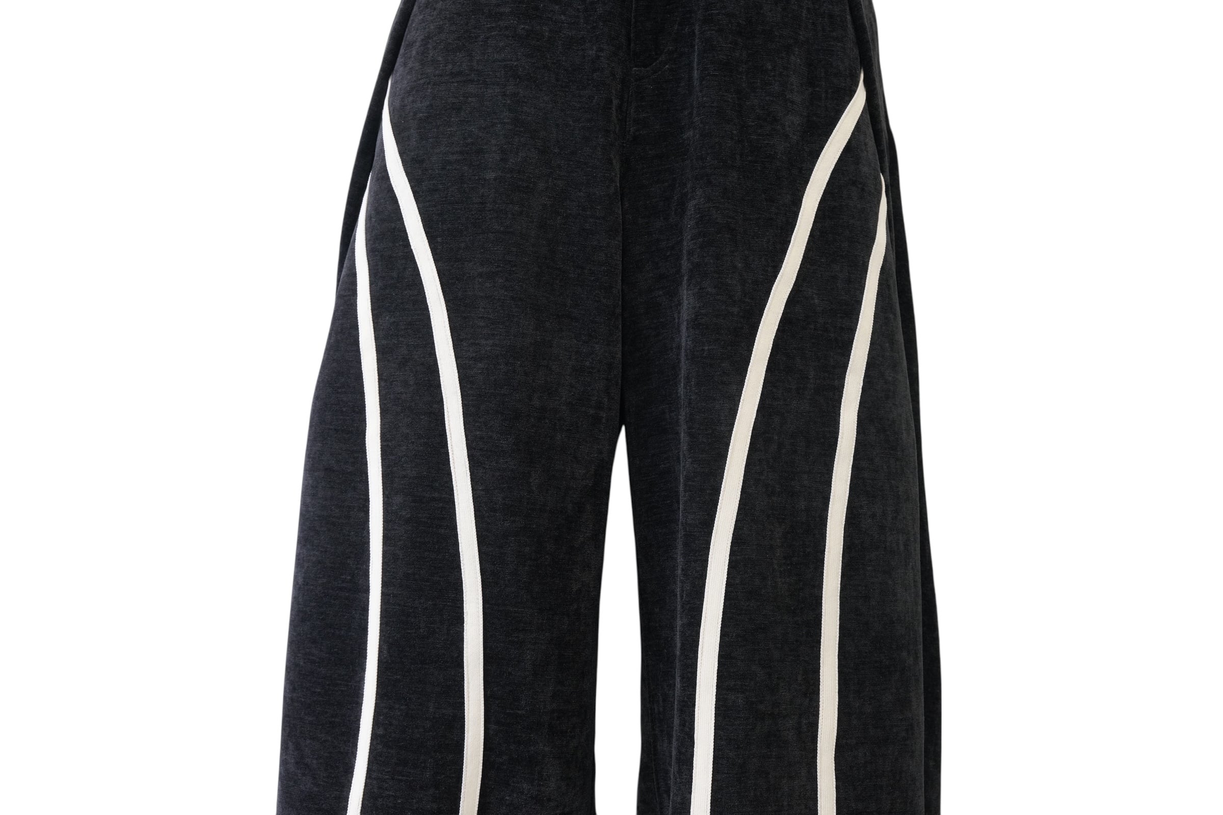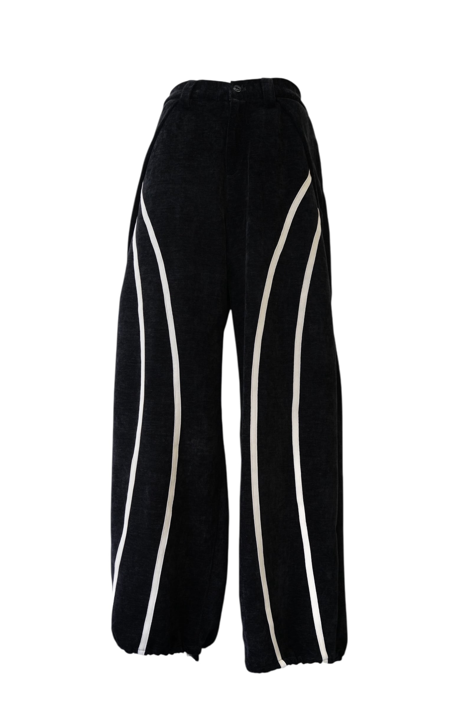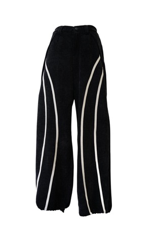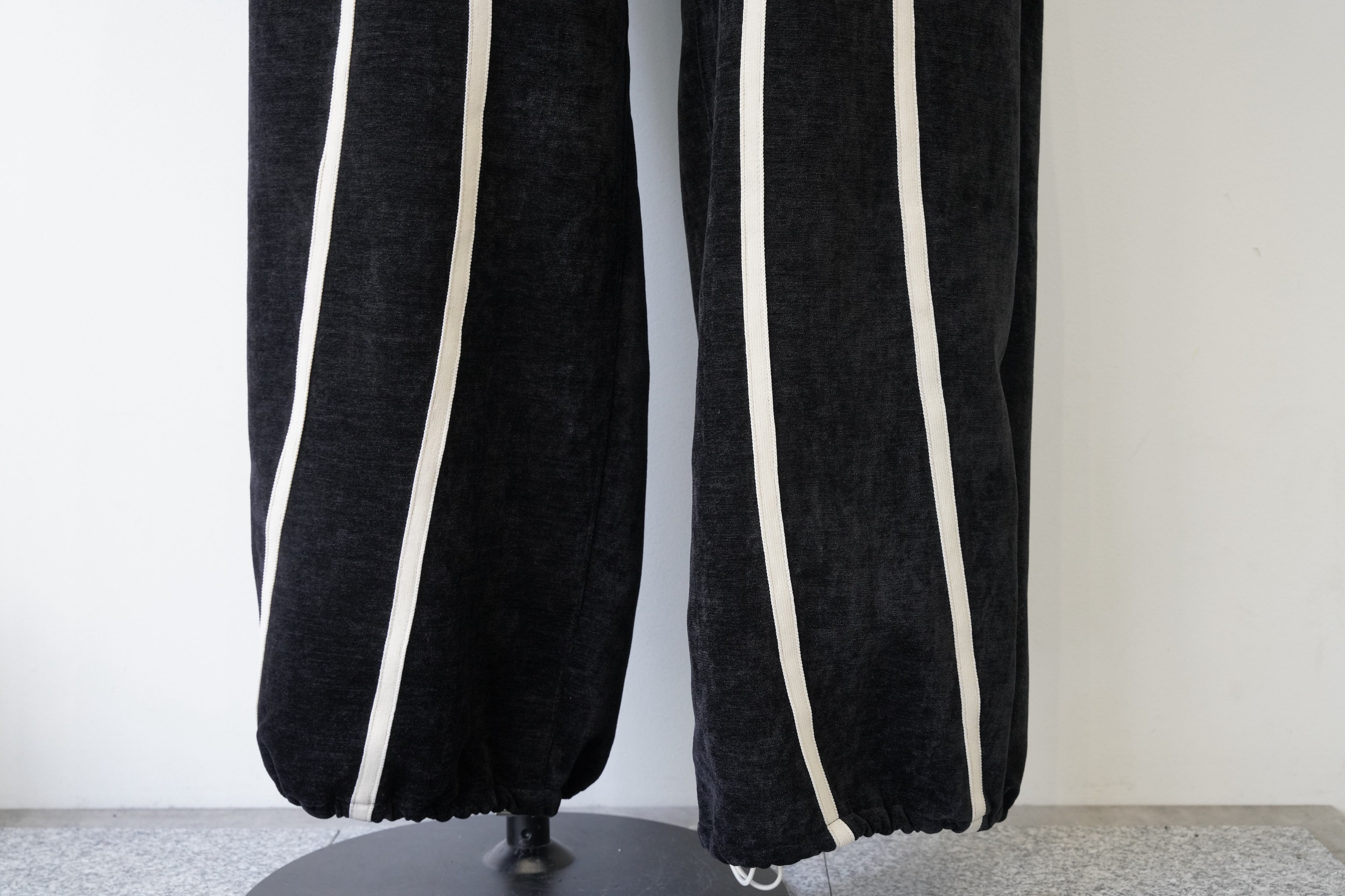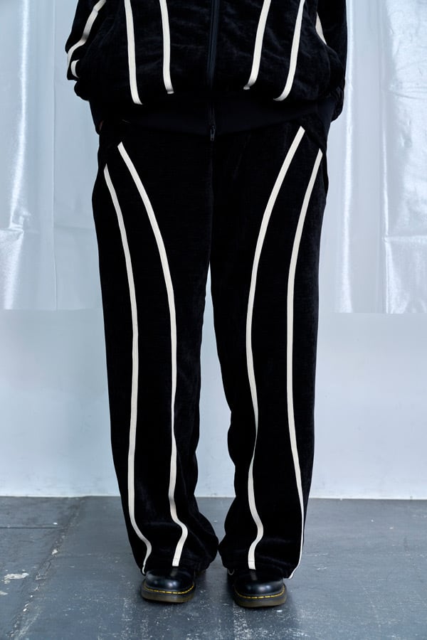 ブラックをベースに、フロントから裾にかけて流れるように配置されたホワイトラインが印象的なワイドパンツ。