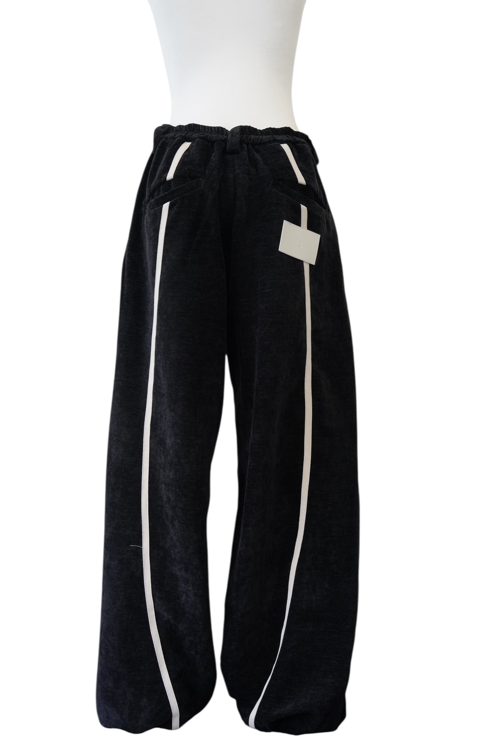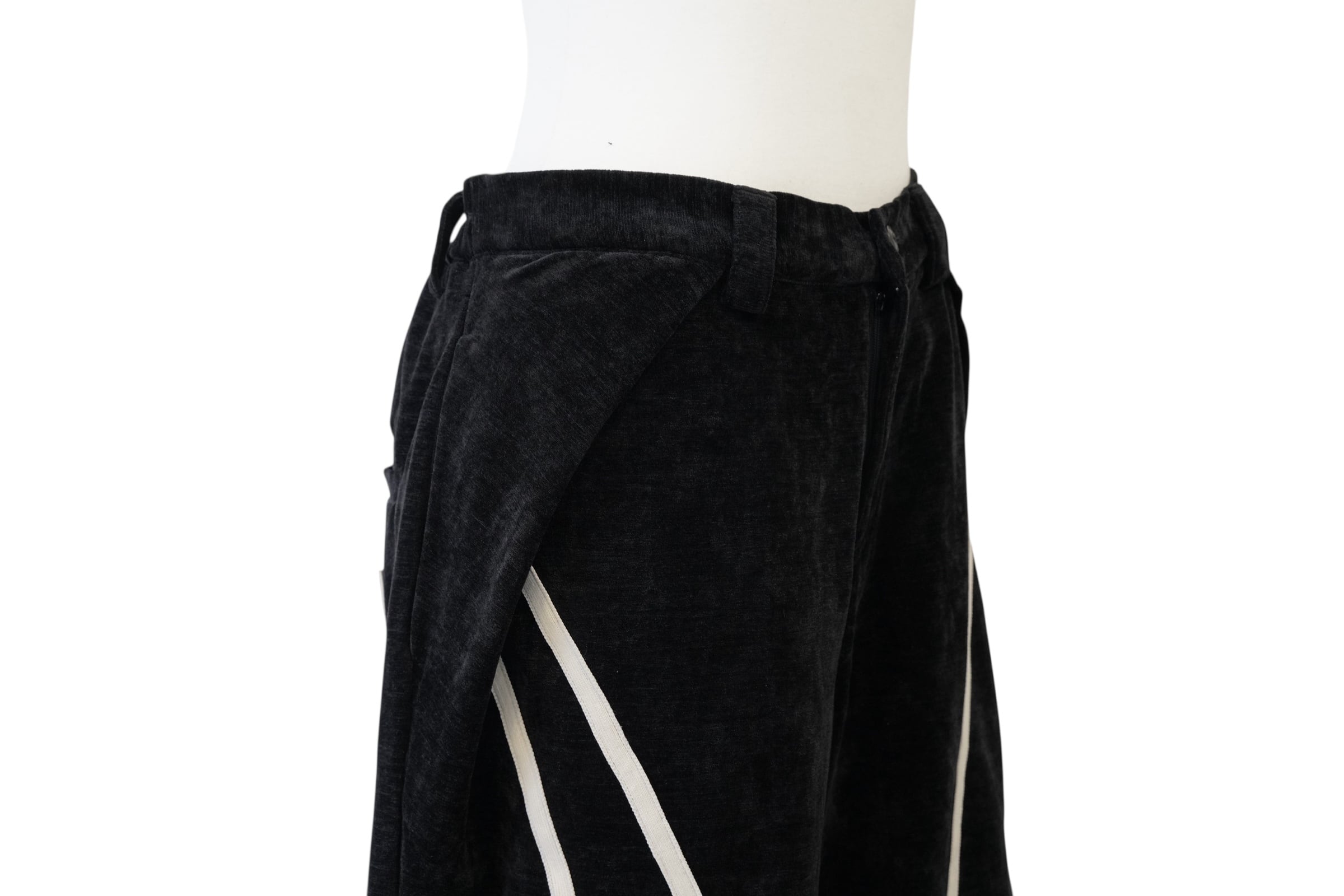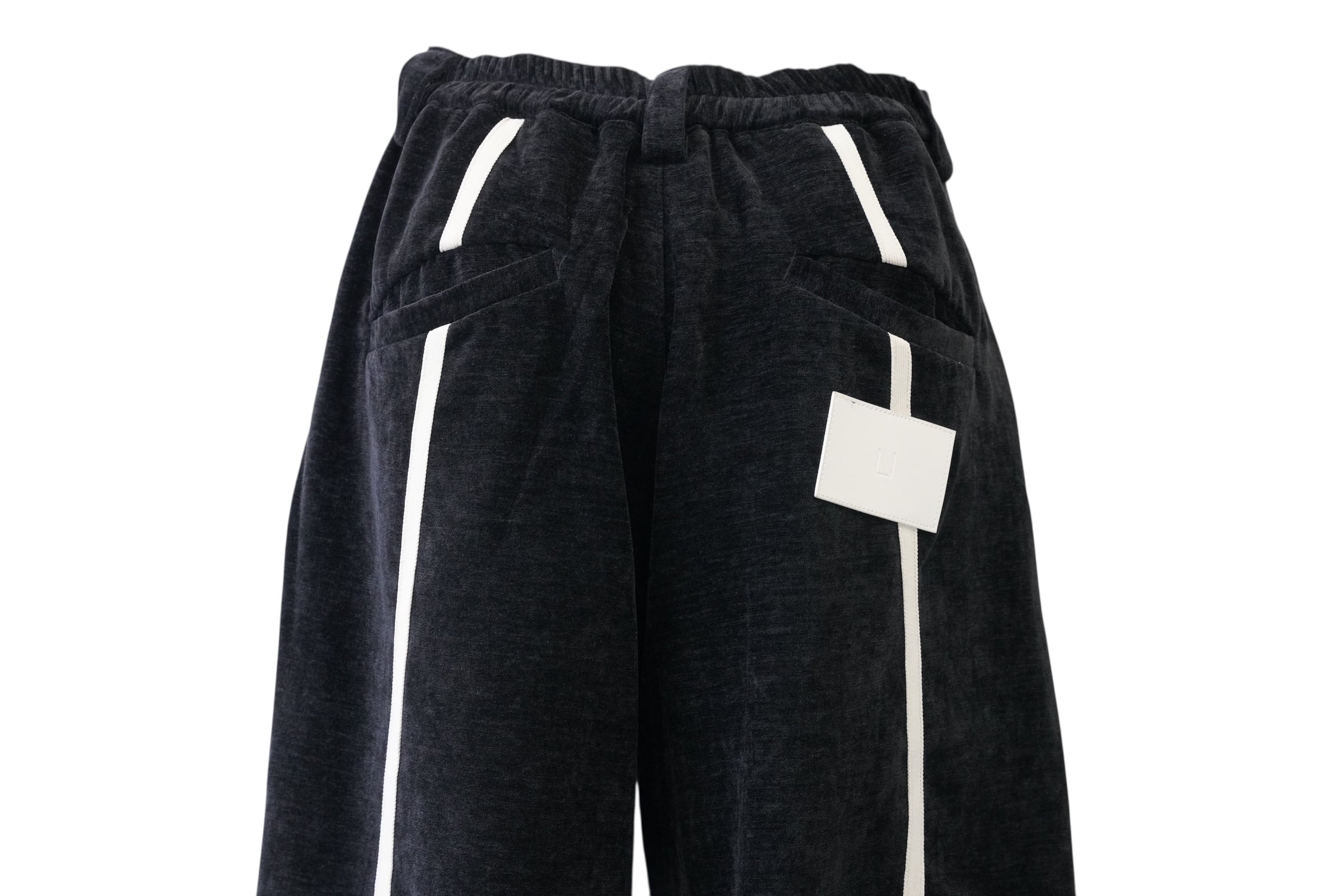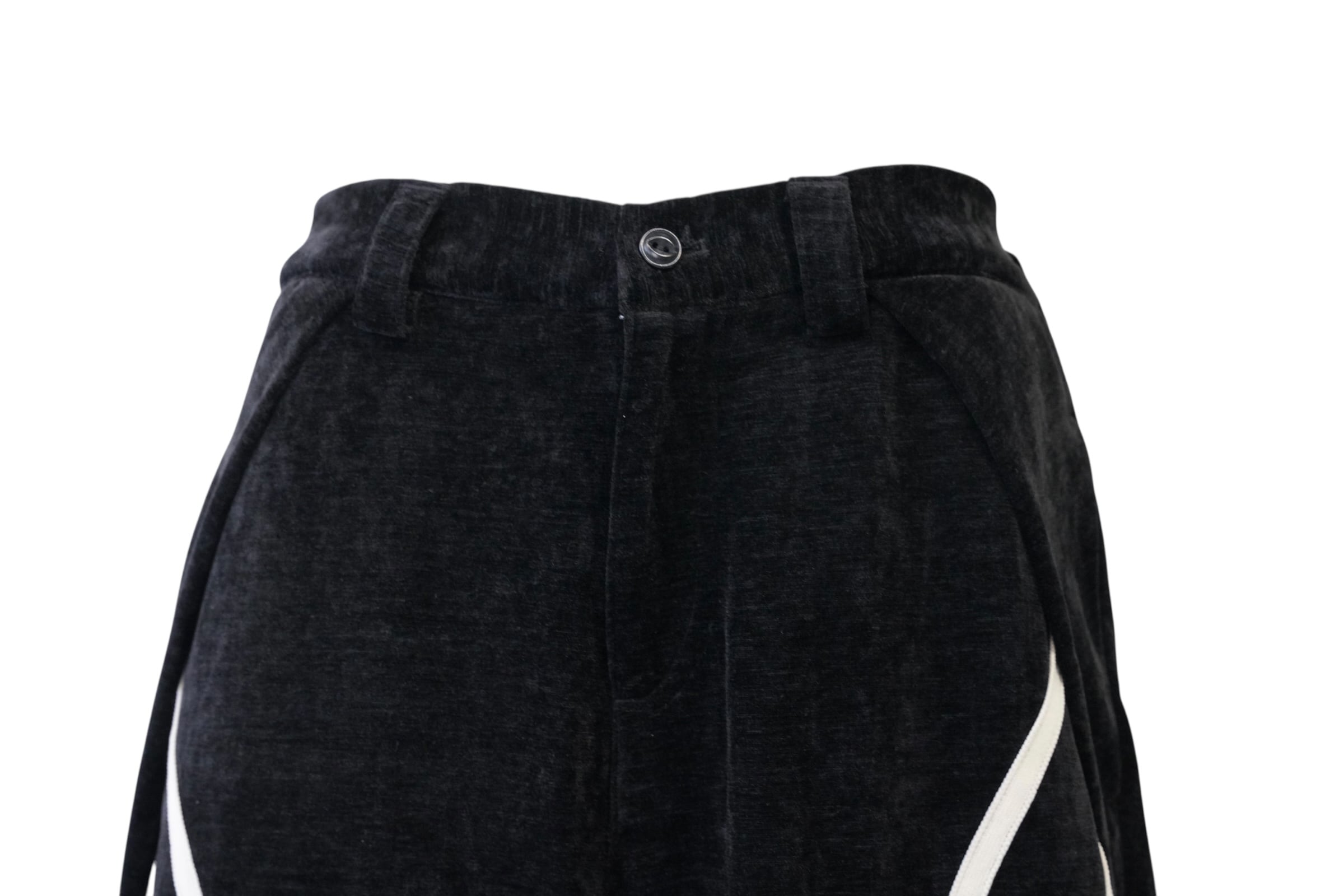 ブラックをベースに、フロントから裾にかけて流れるように配置されたホワイトラインが印象的なワイドパンツ。