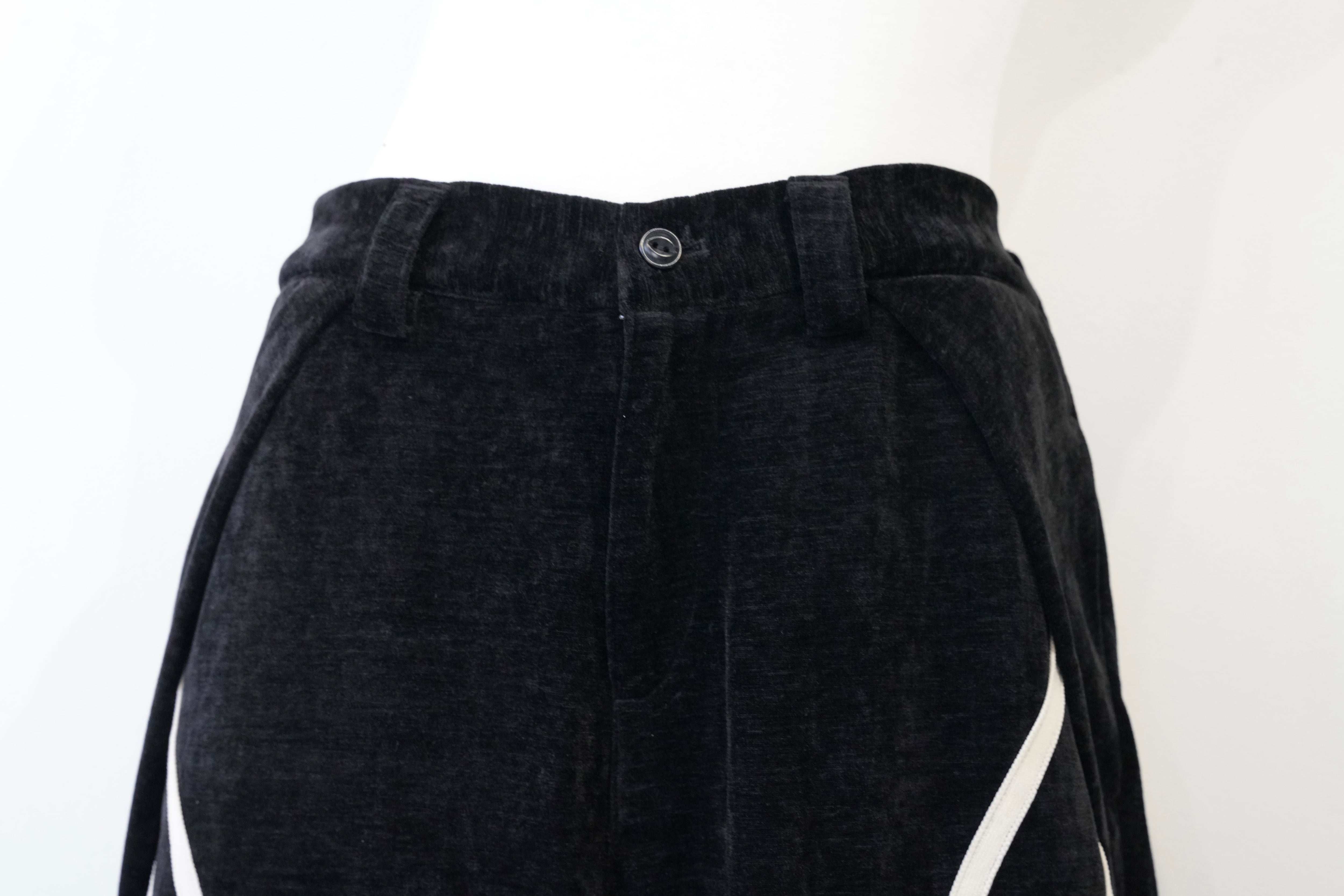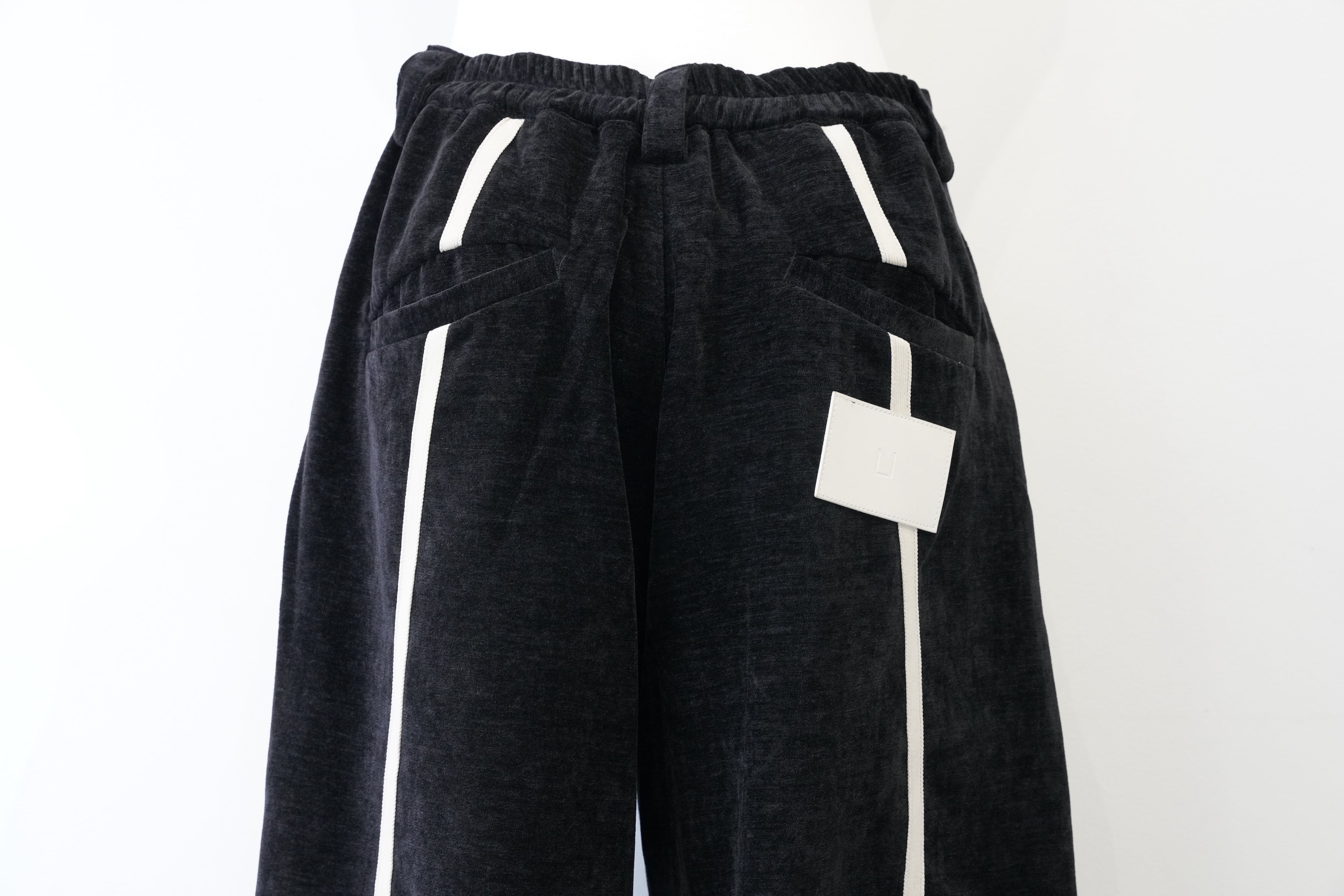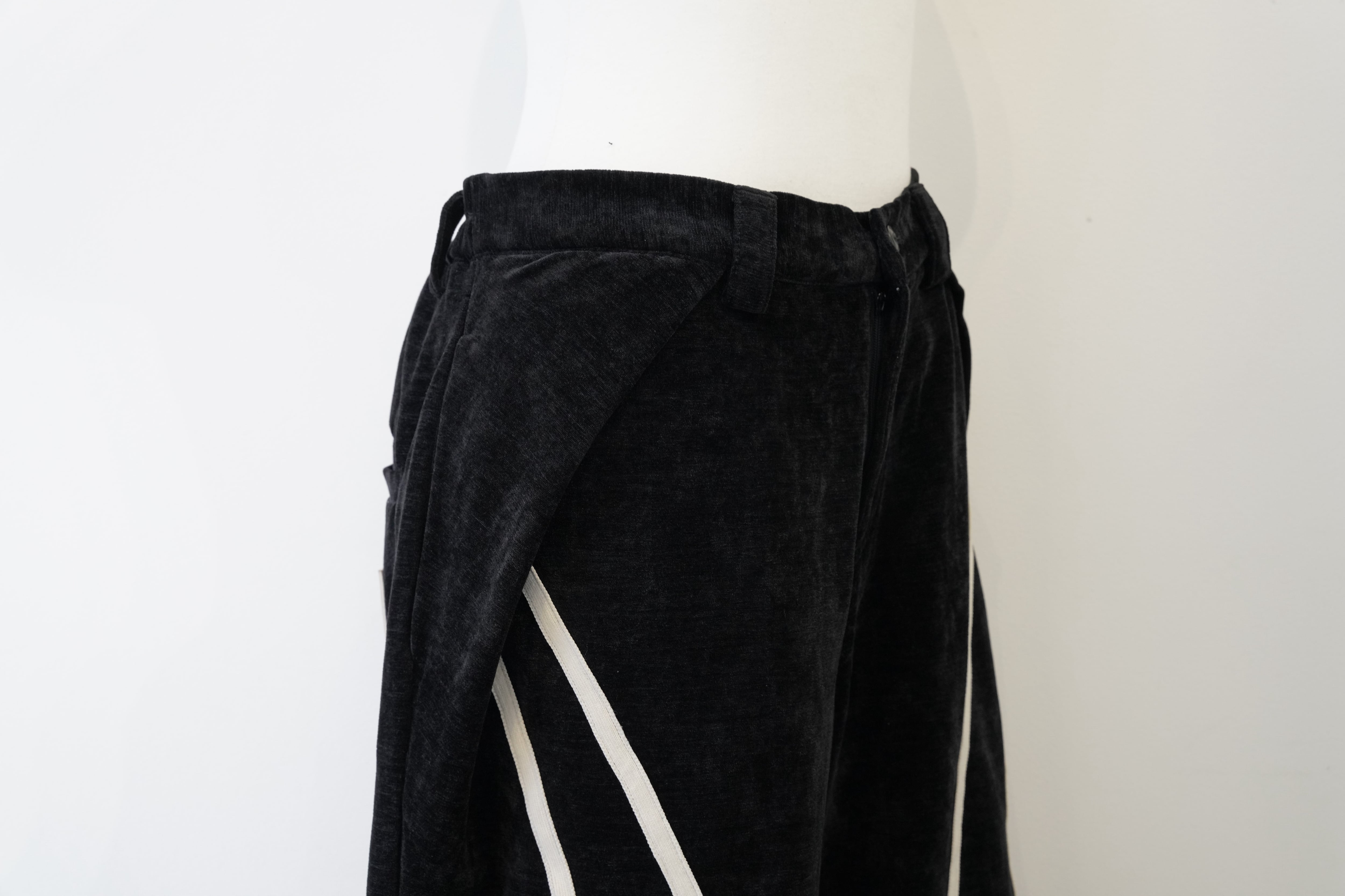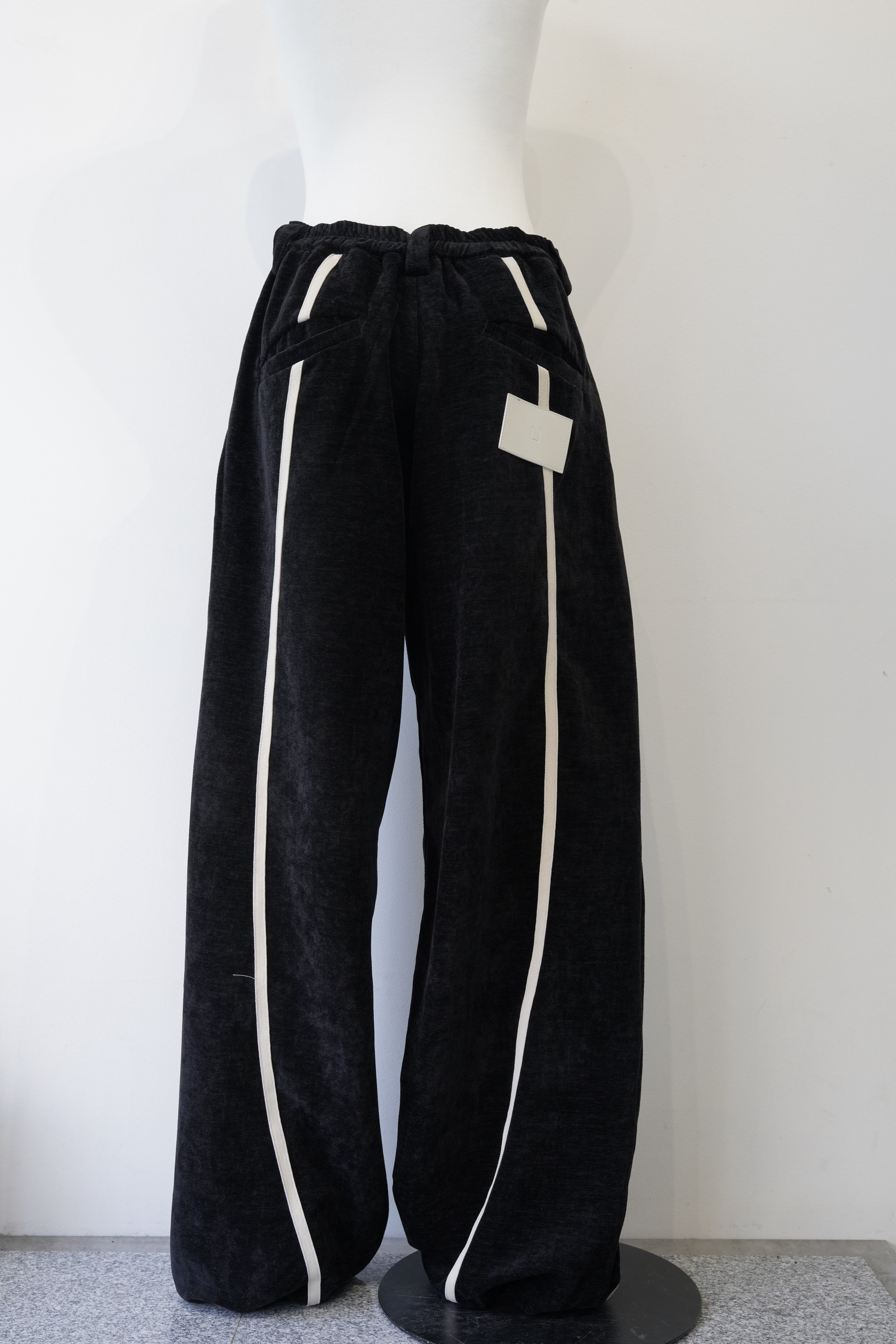 ブラックをベースに、フロントから裾にかけて流れるように配置されたホワイトラインが印象的なワイドパンツ。
