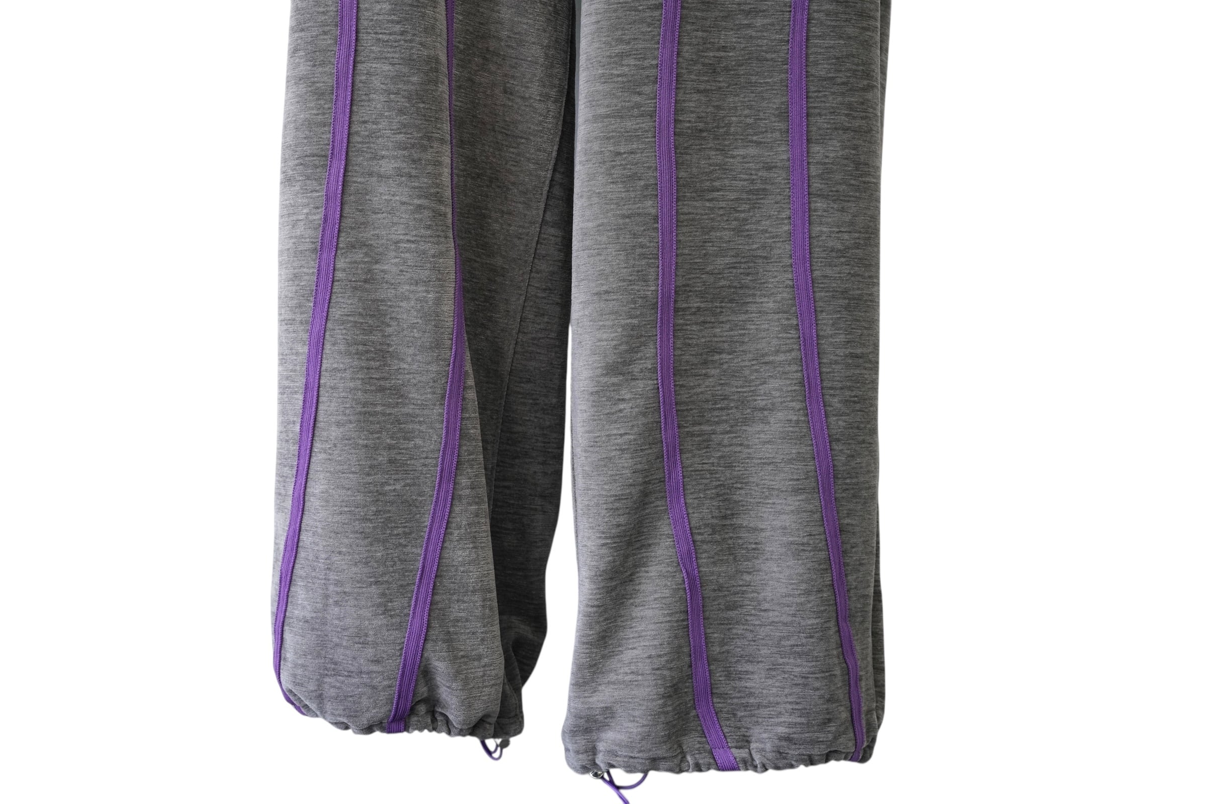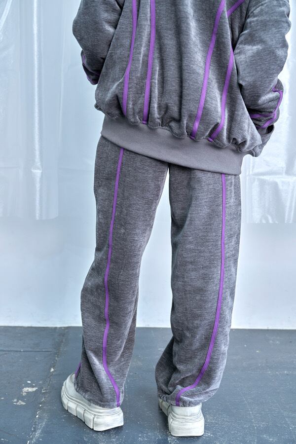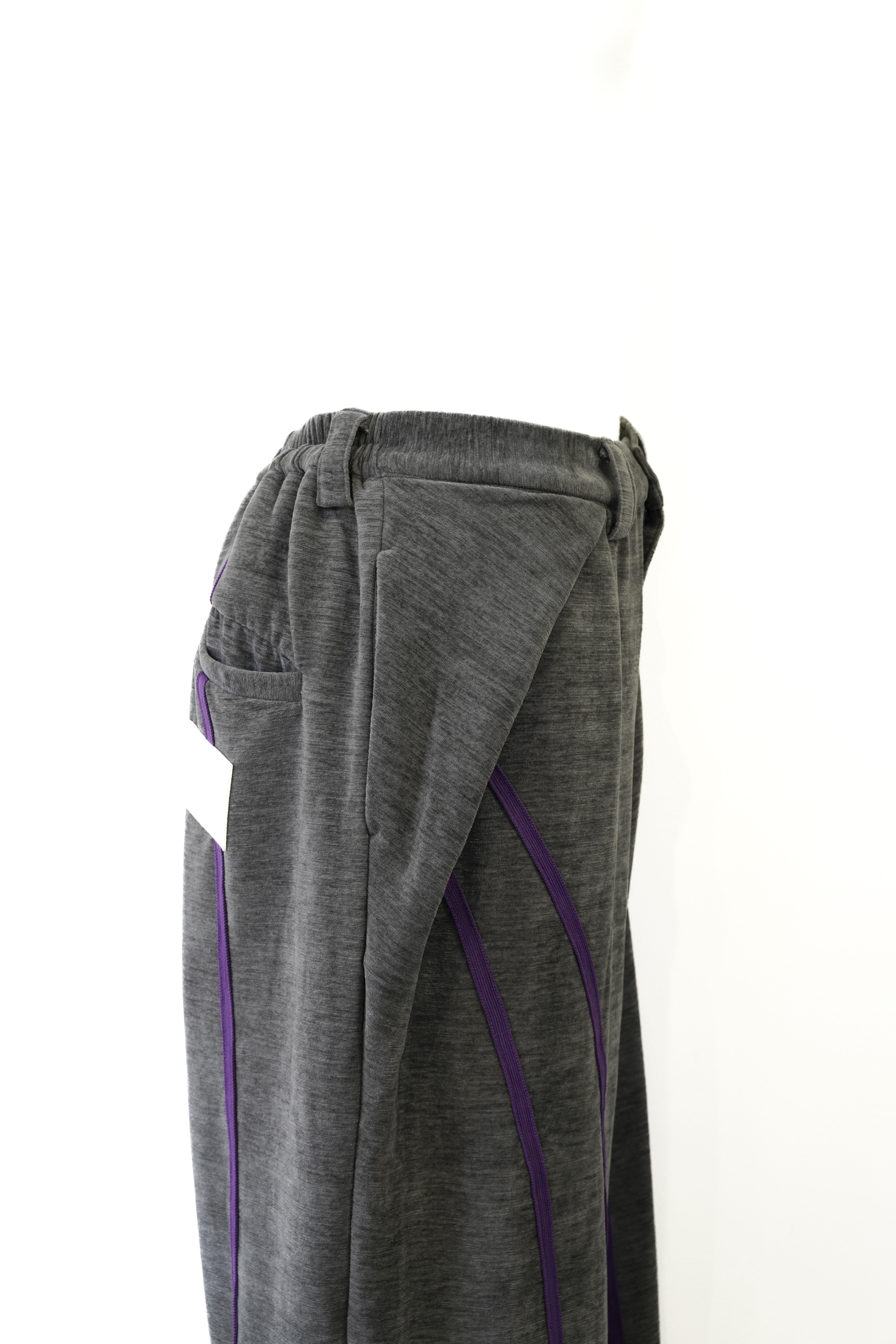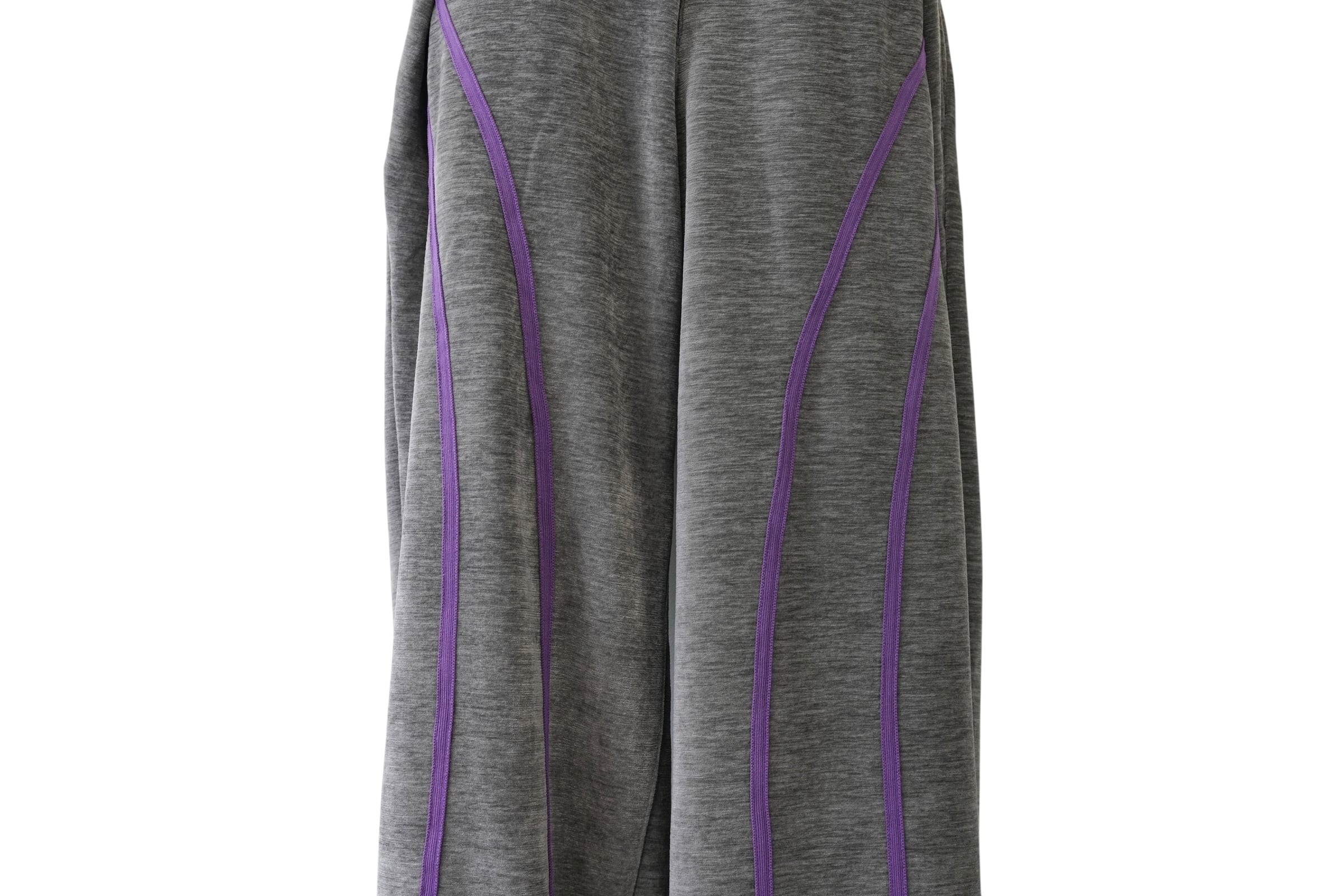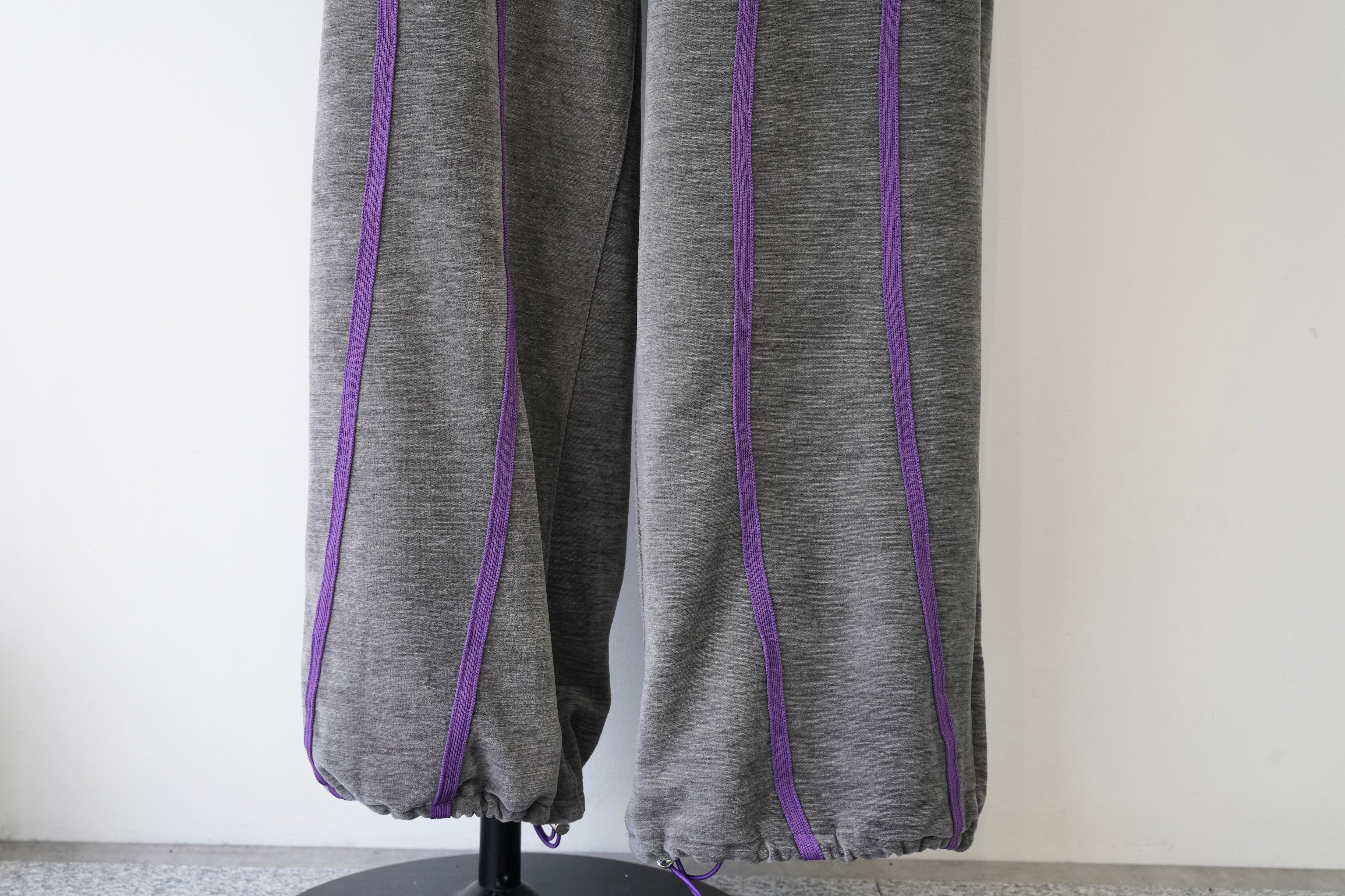 メランジグレーをベースに、縦に流れるパープルのラインが印象的なワイドジャージパンツ。
