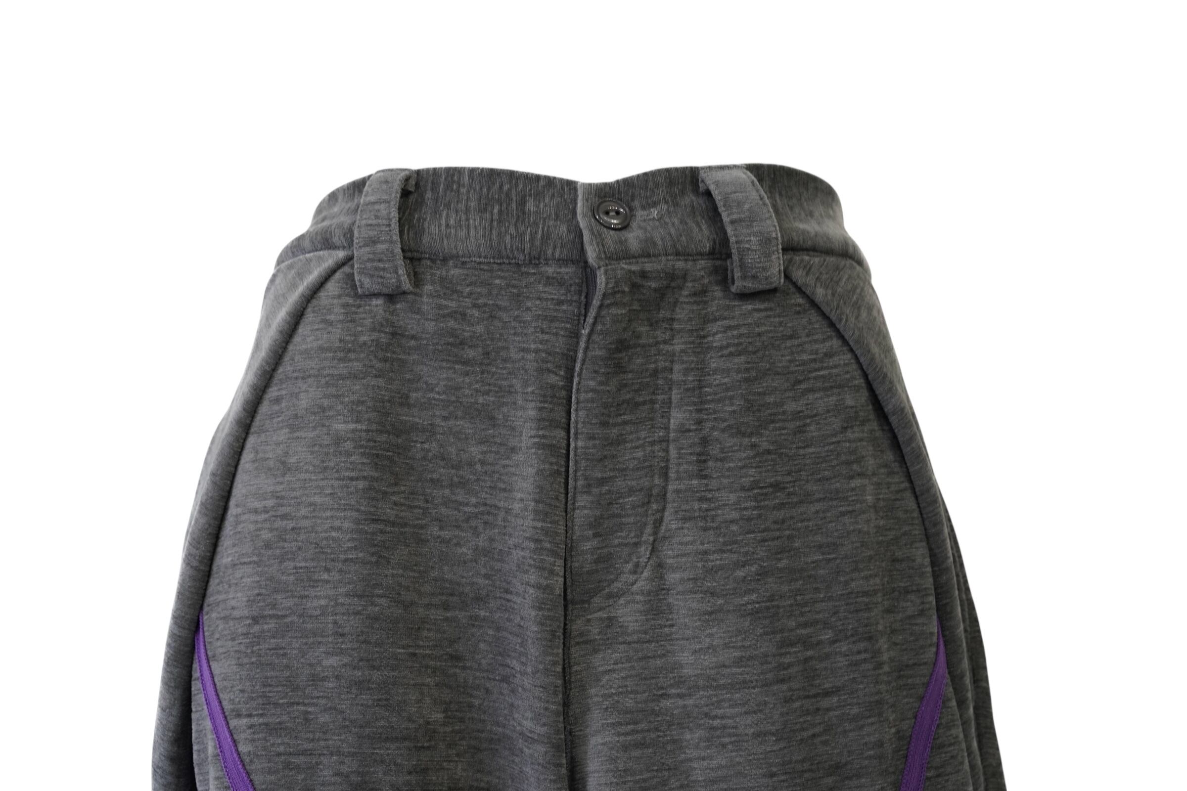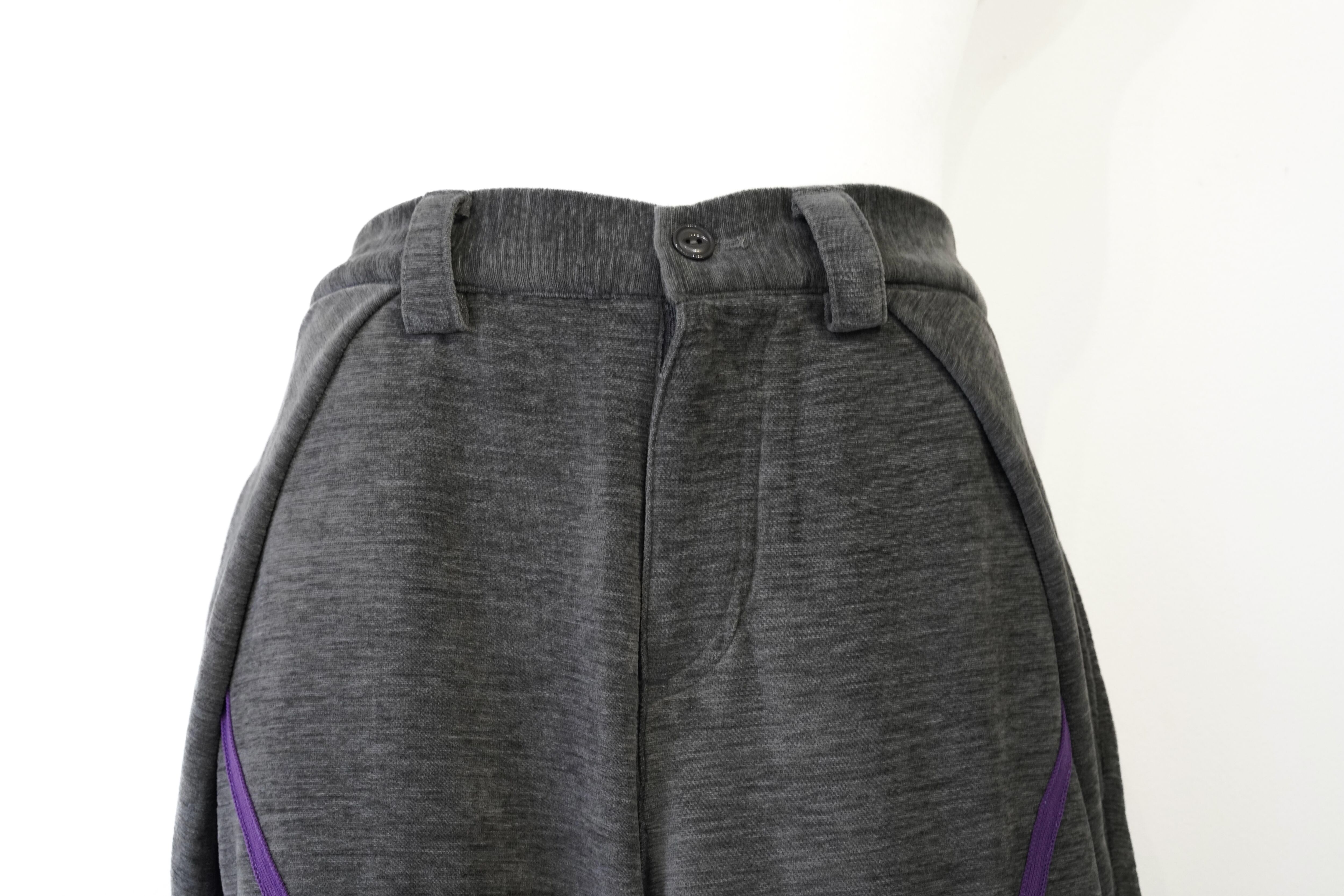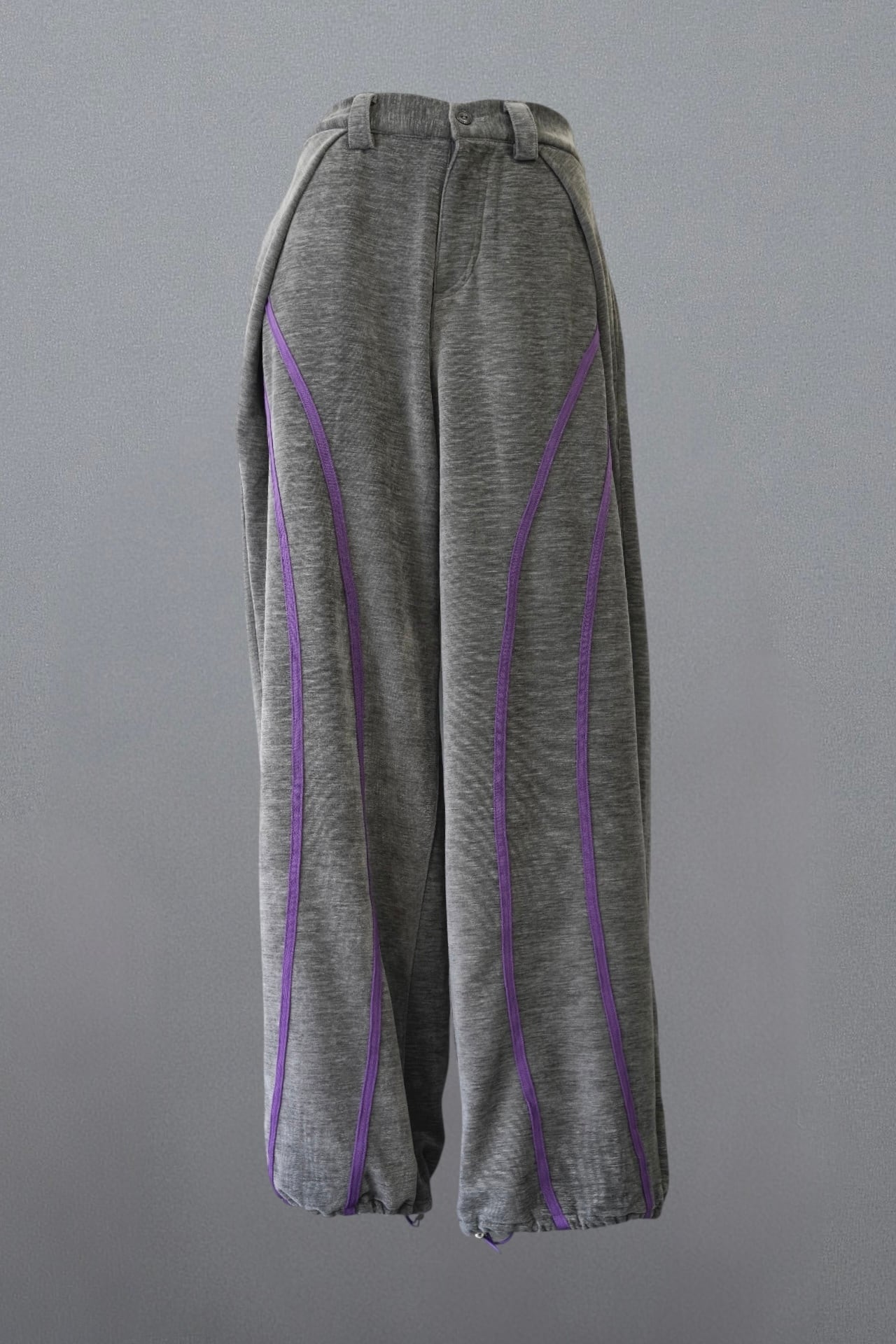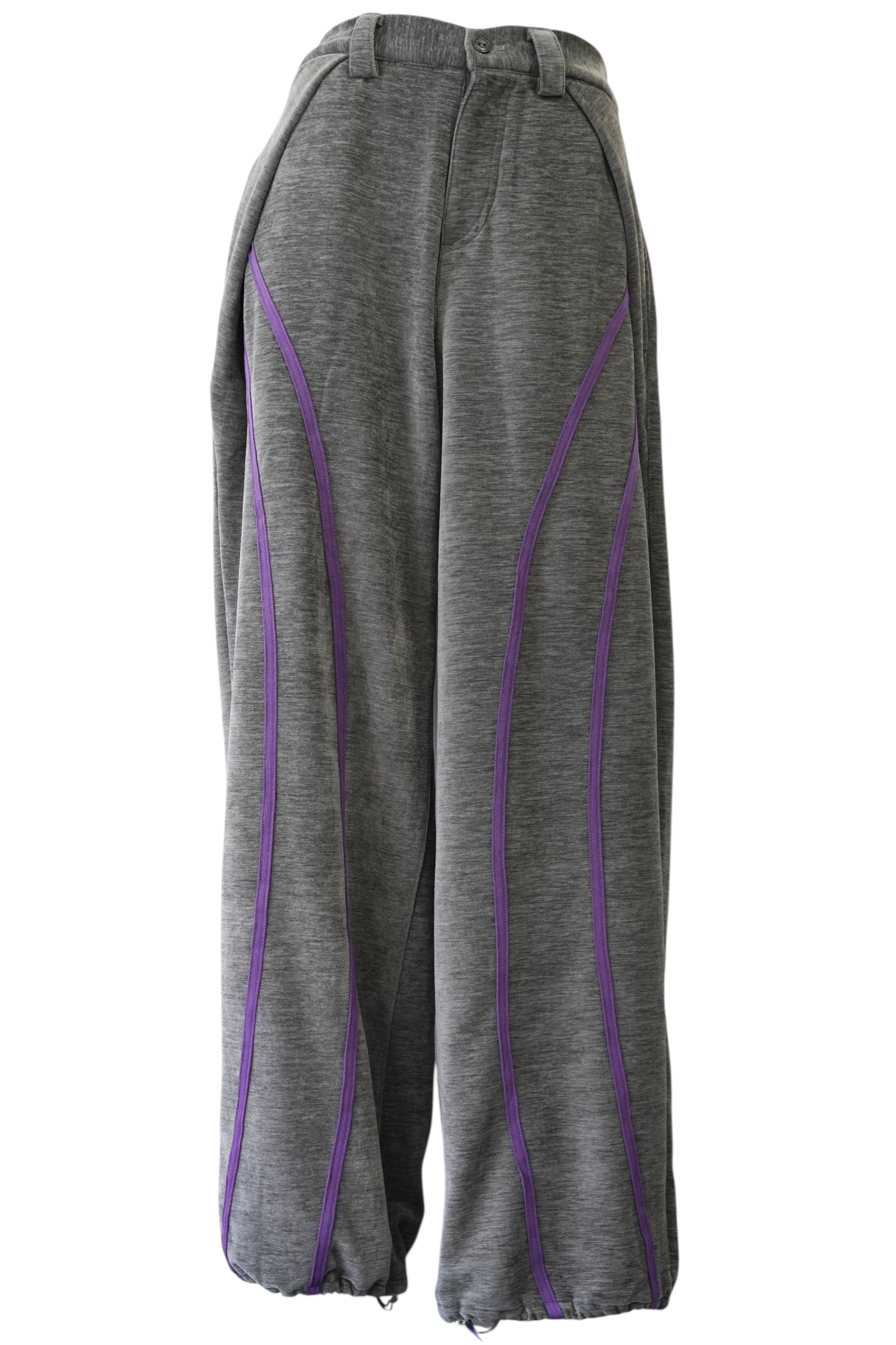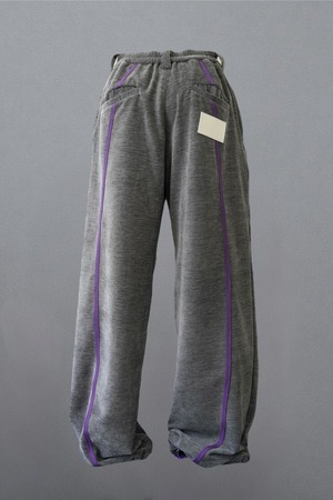 メランジグレーをベースに、縦に流れるパープルのラインが印象的なワイドジャージパンツ。
