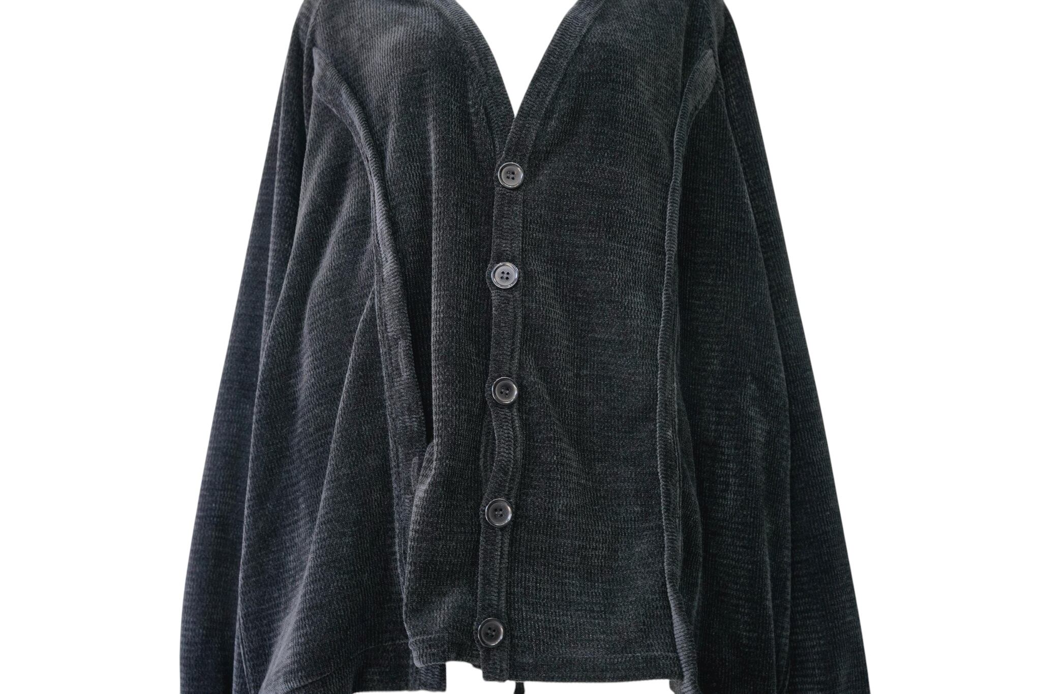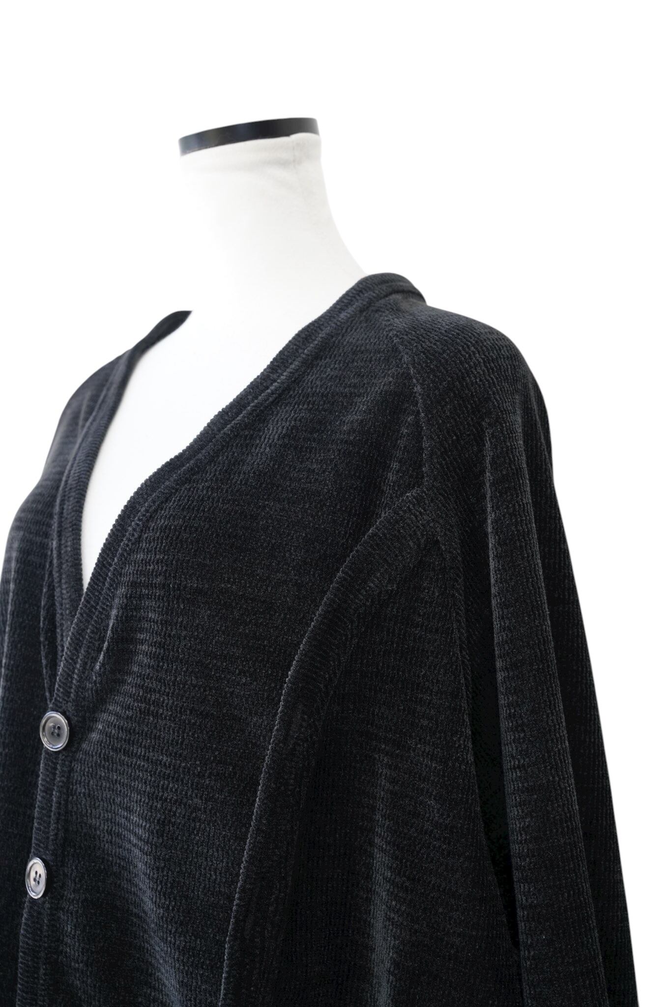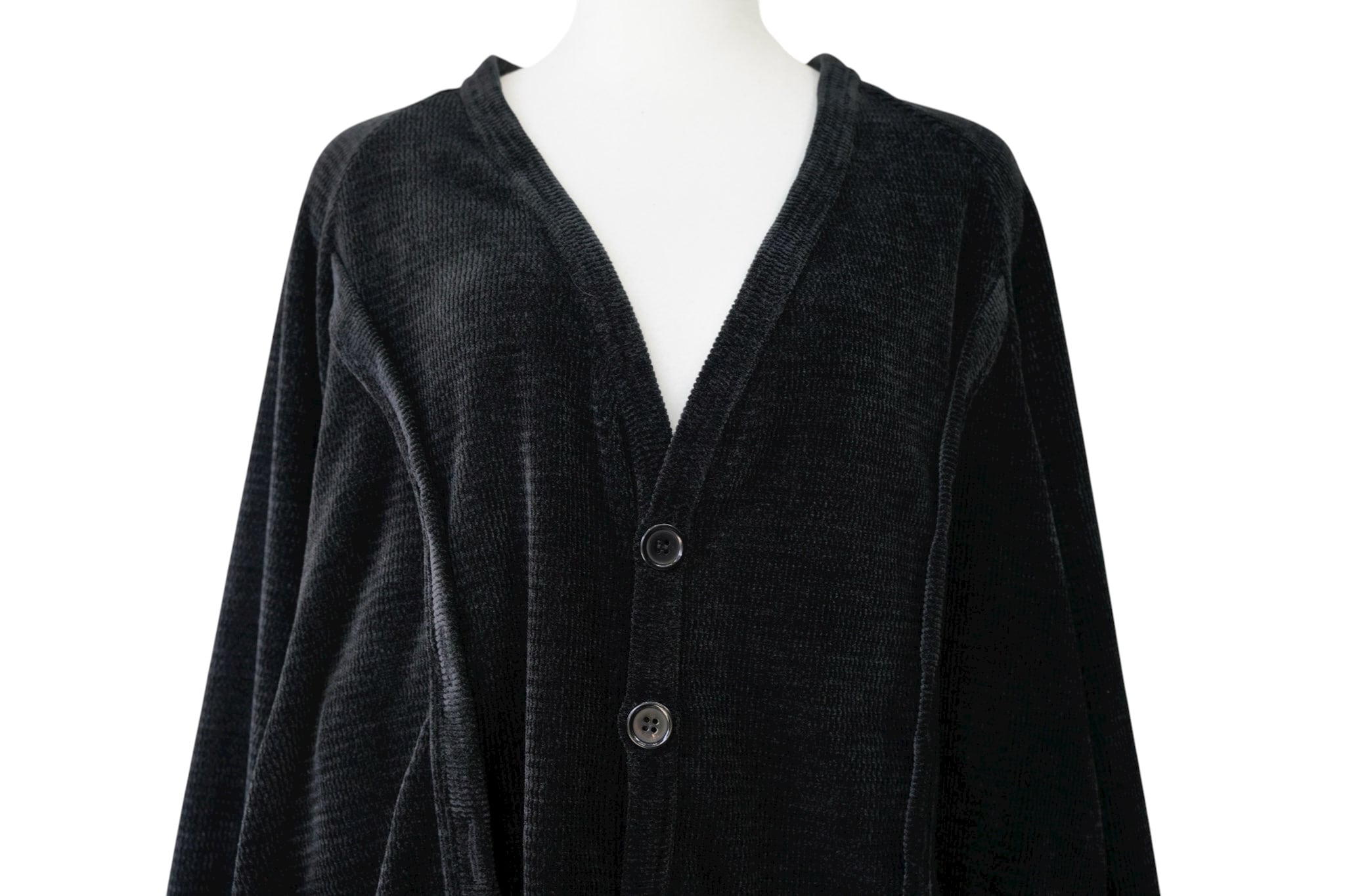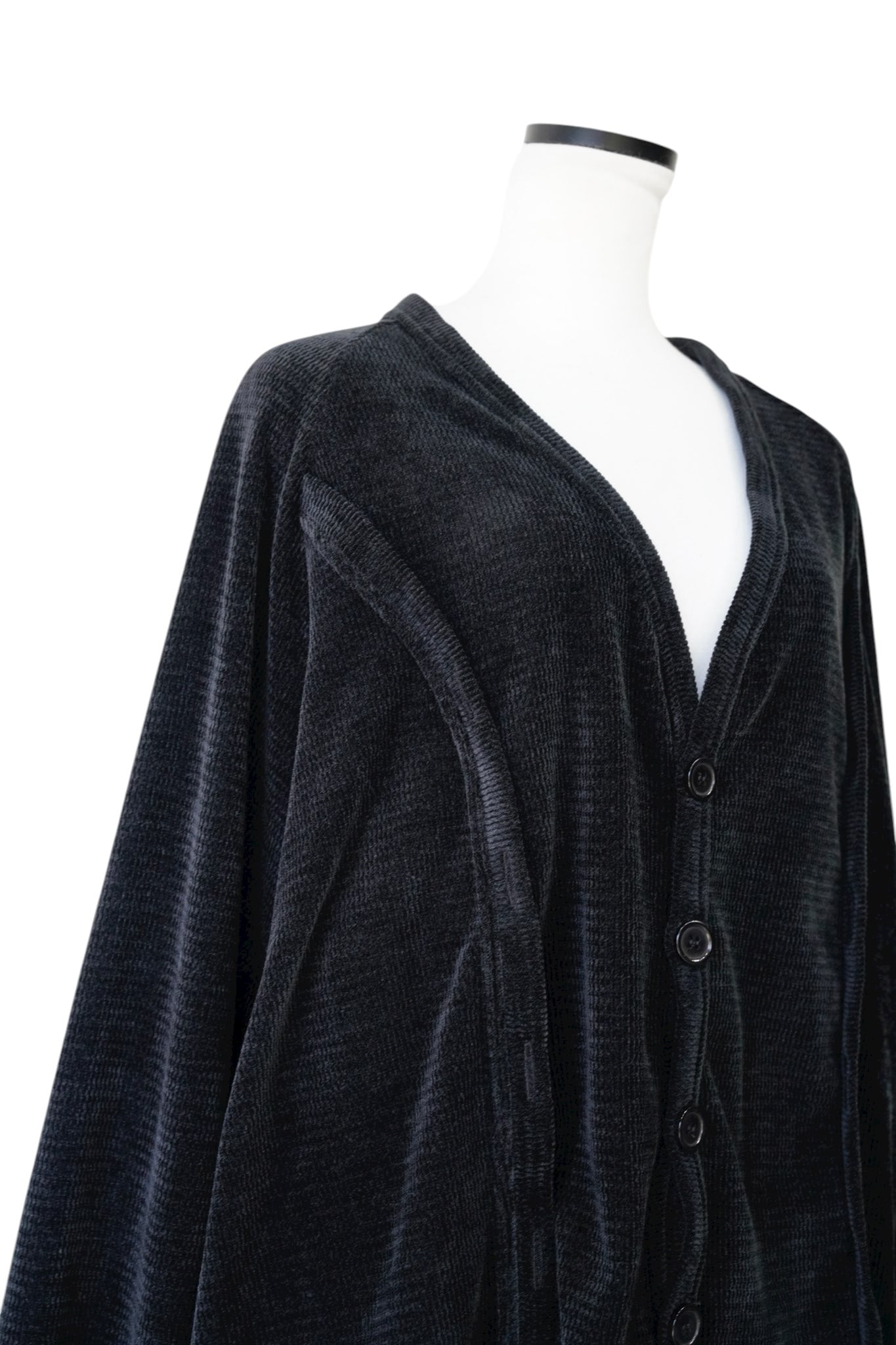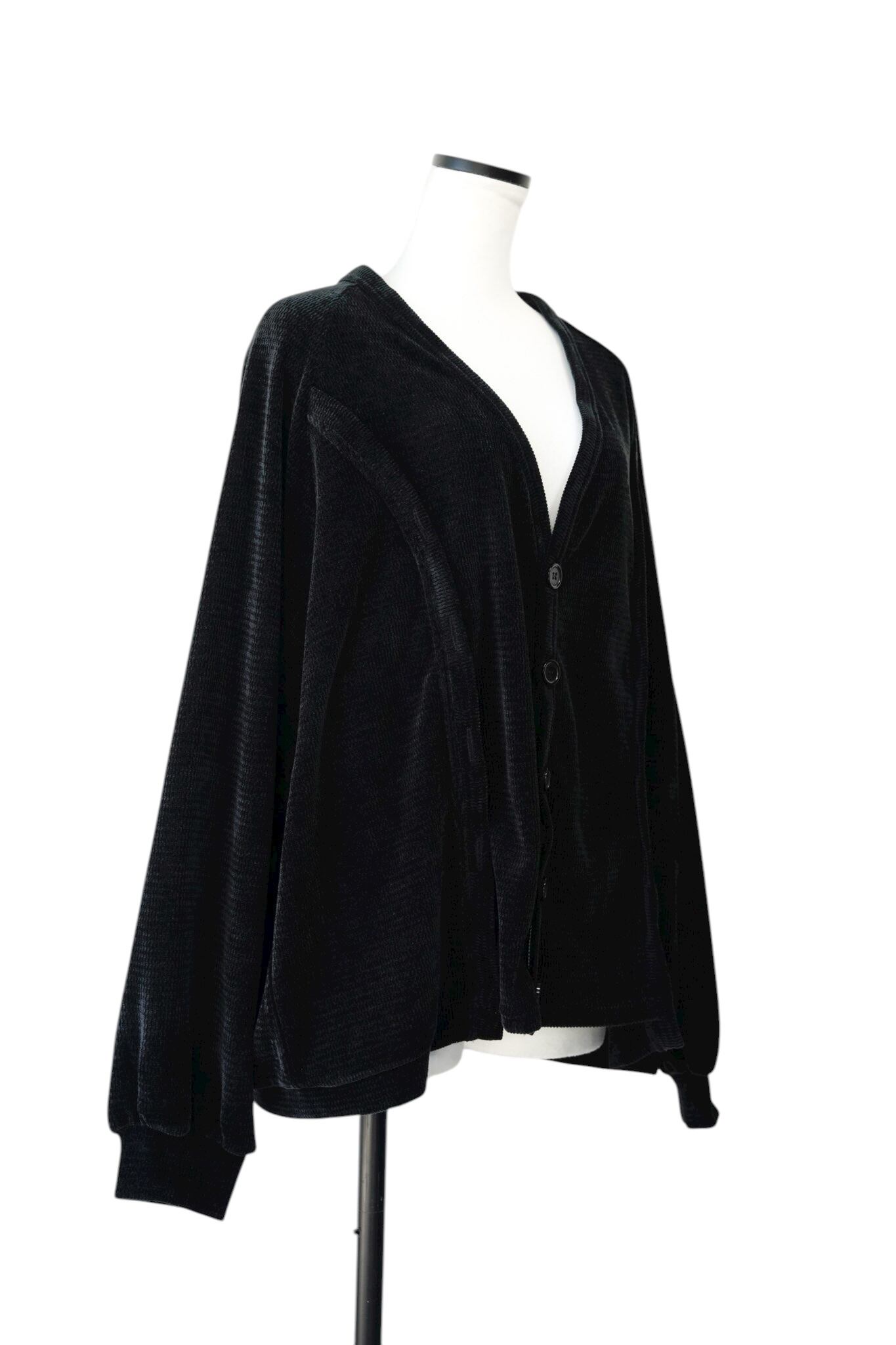 オーバーサイズシルエットでリラックス感を演出するスイッチングデザインカーディガン。