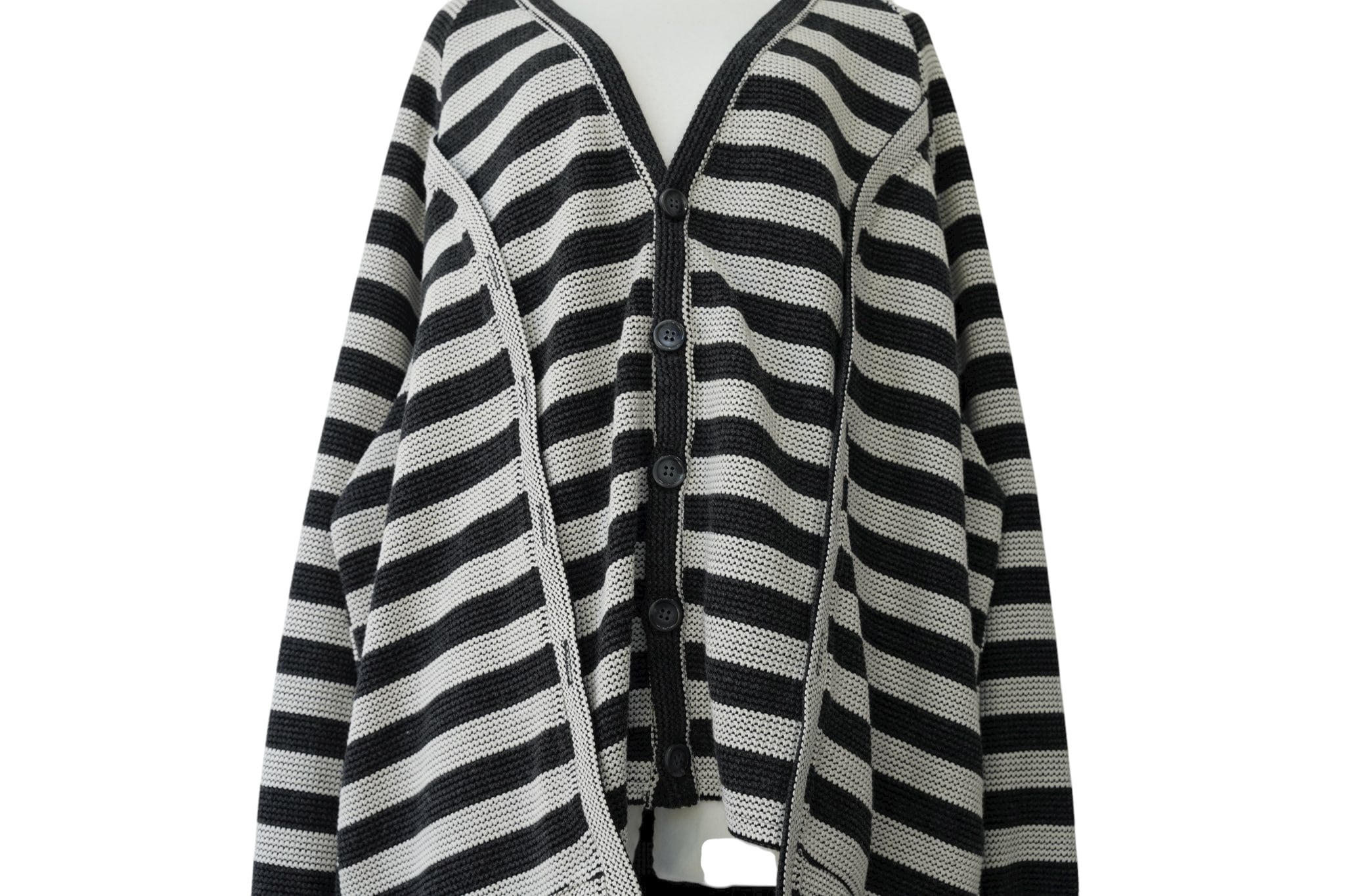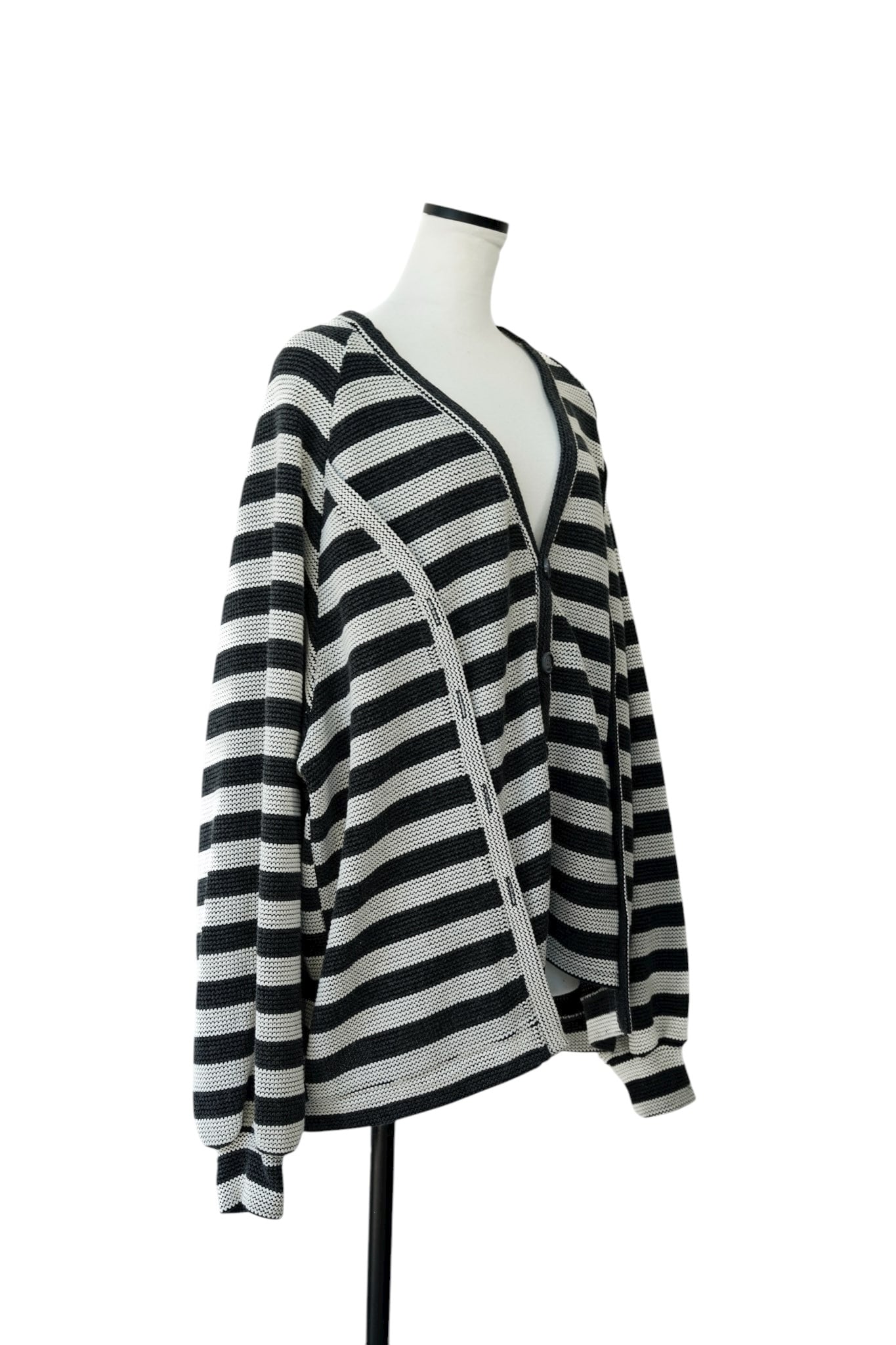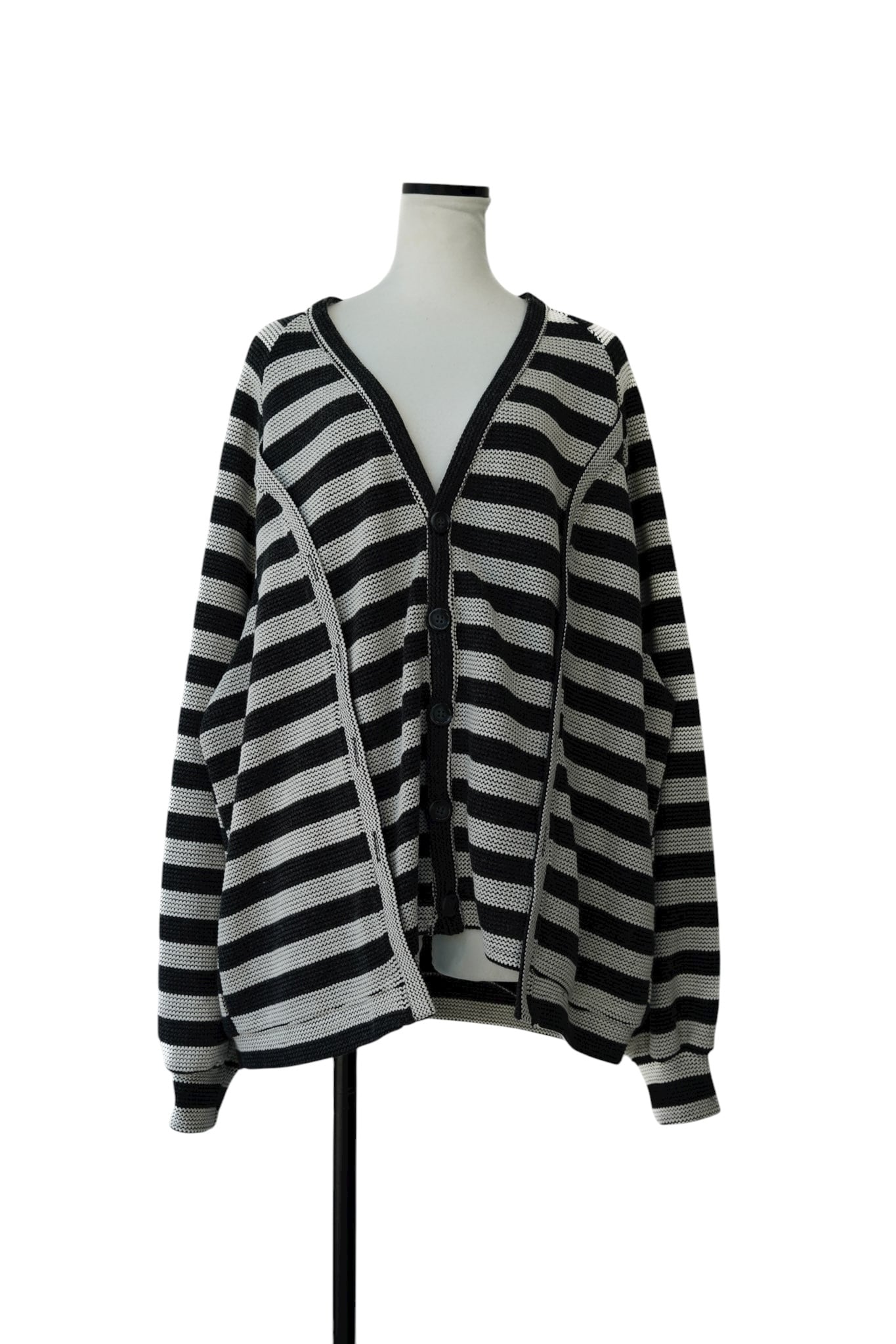オーバーサイズシルエットでリラックス感を演出するスイッチングデザインカーディガン。