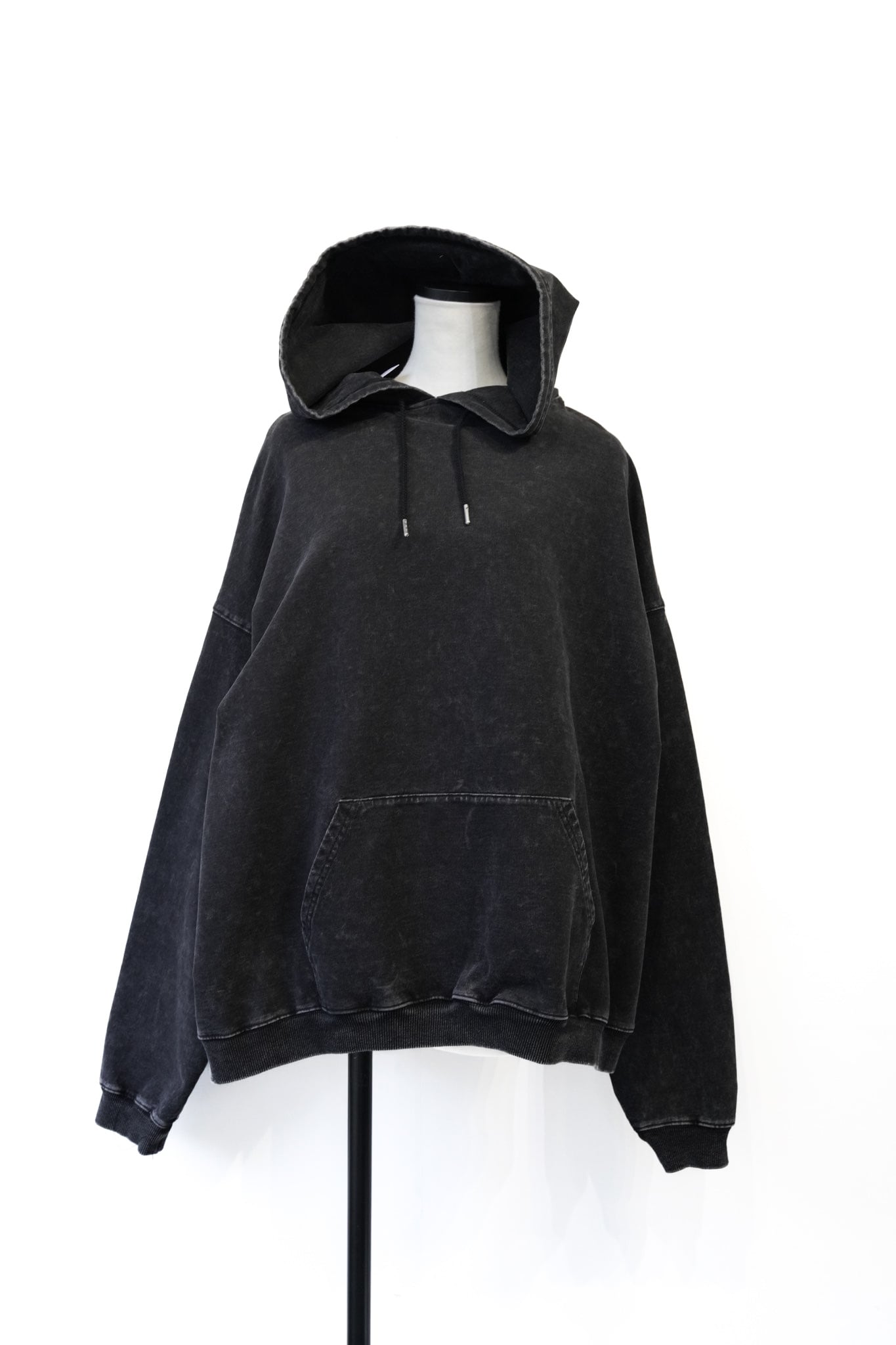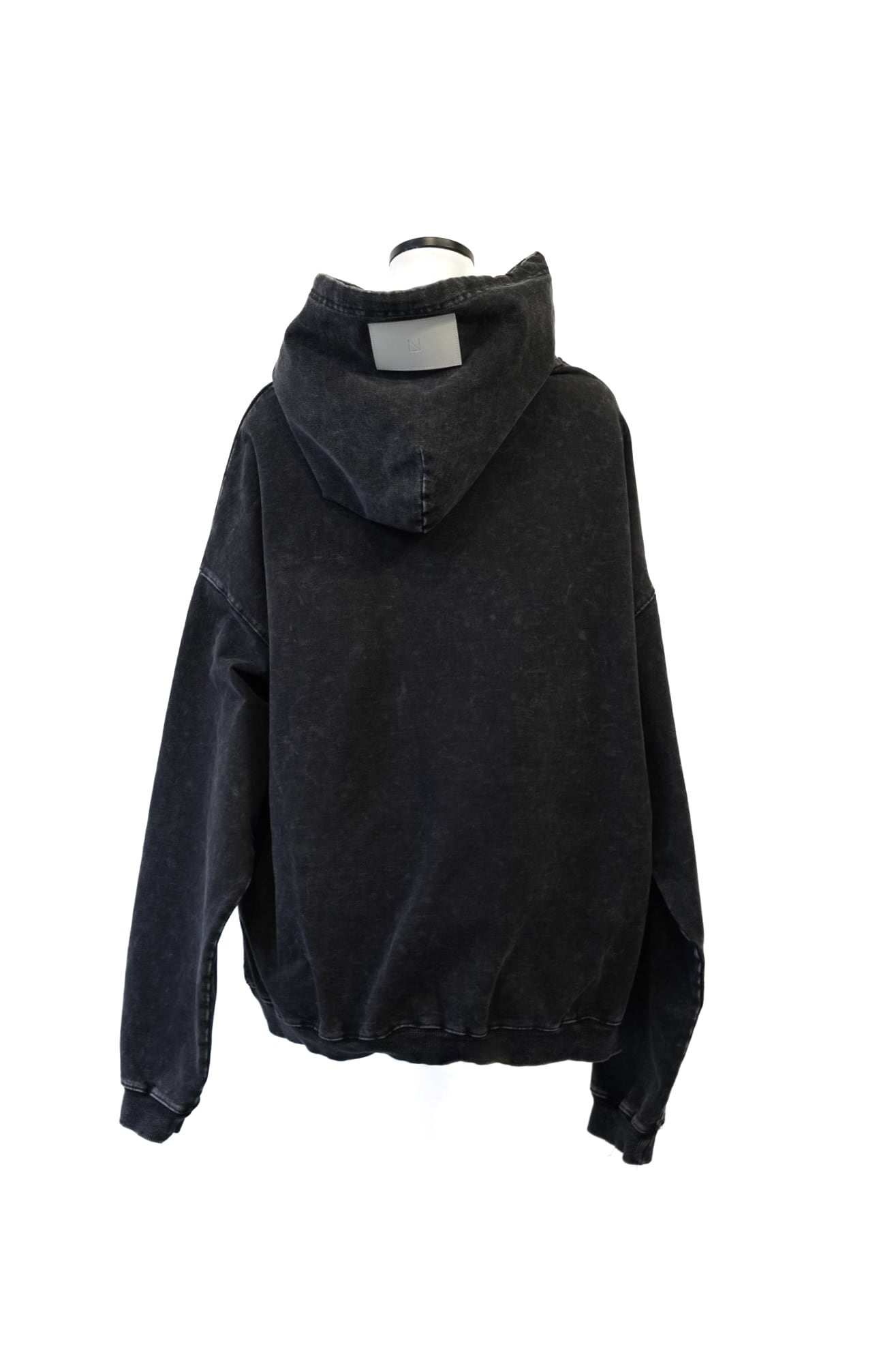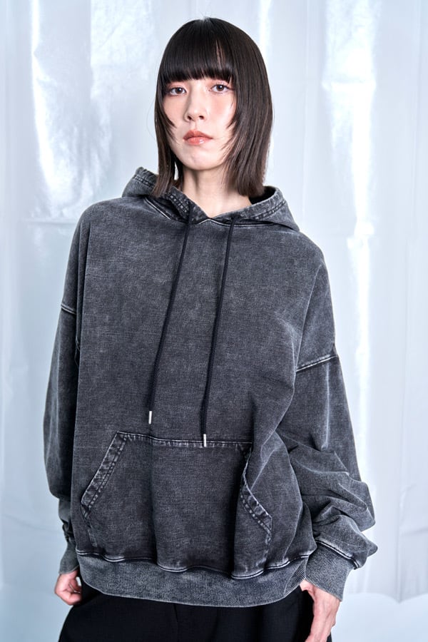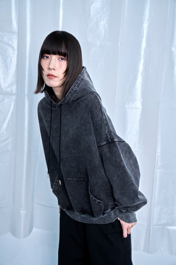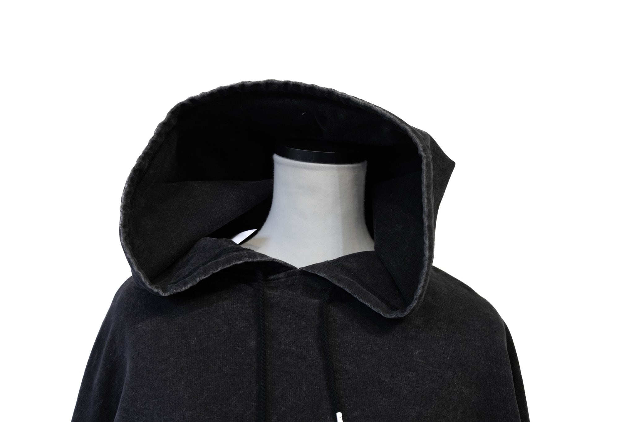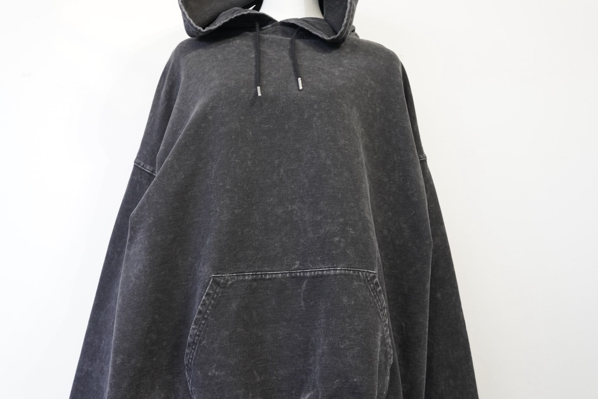 ヴィンテージウォッシュ加工で仕上げた、深みのあるブラックフーディー。