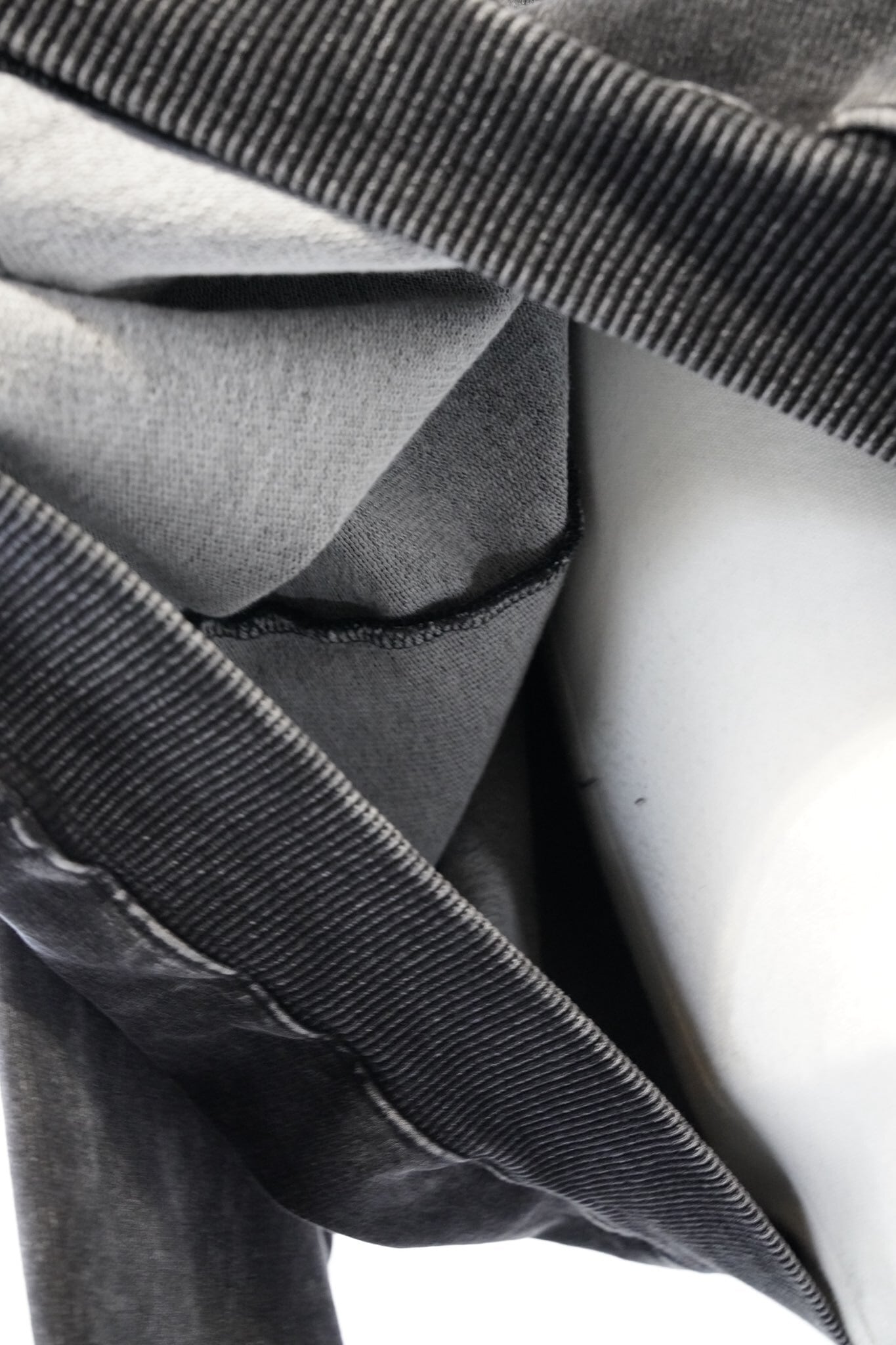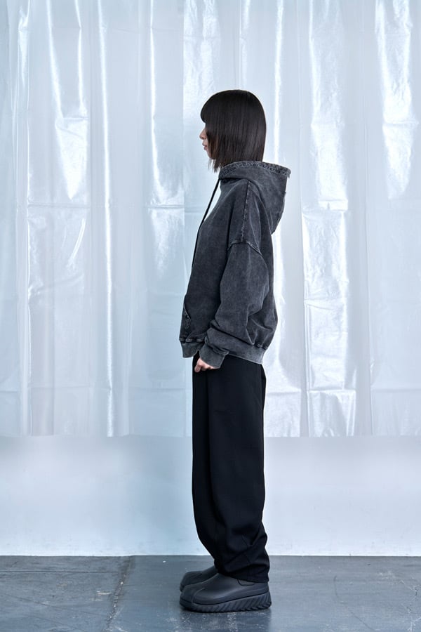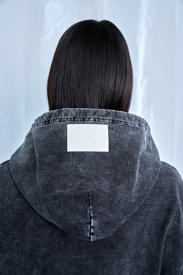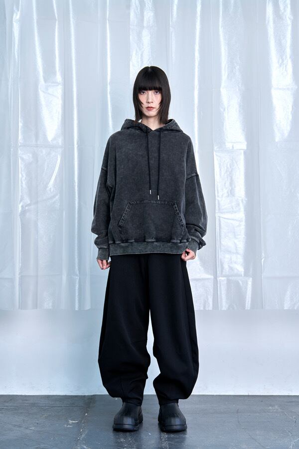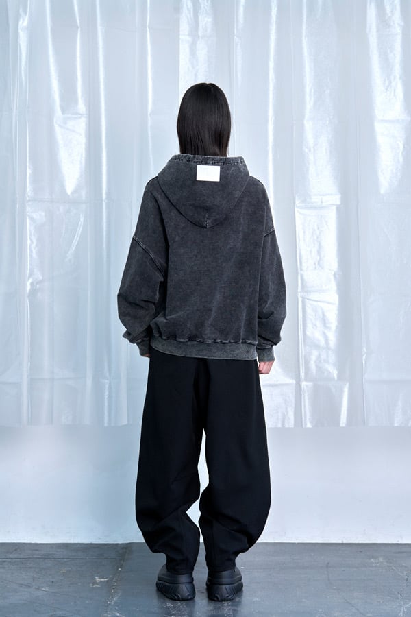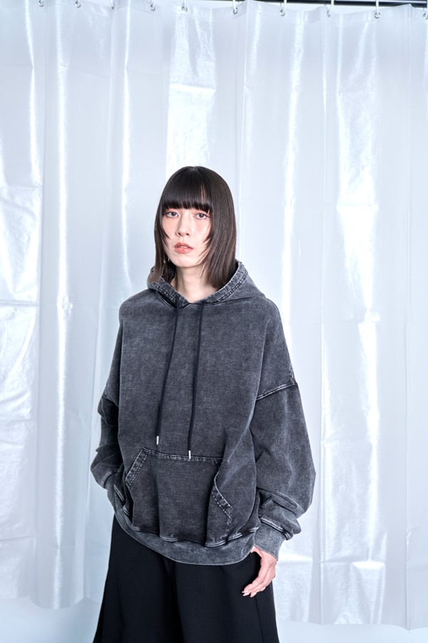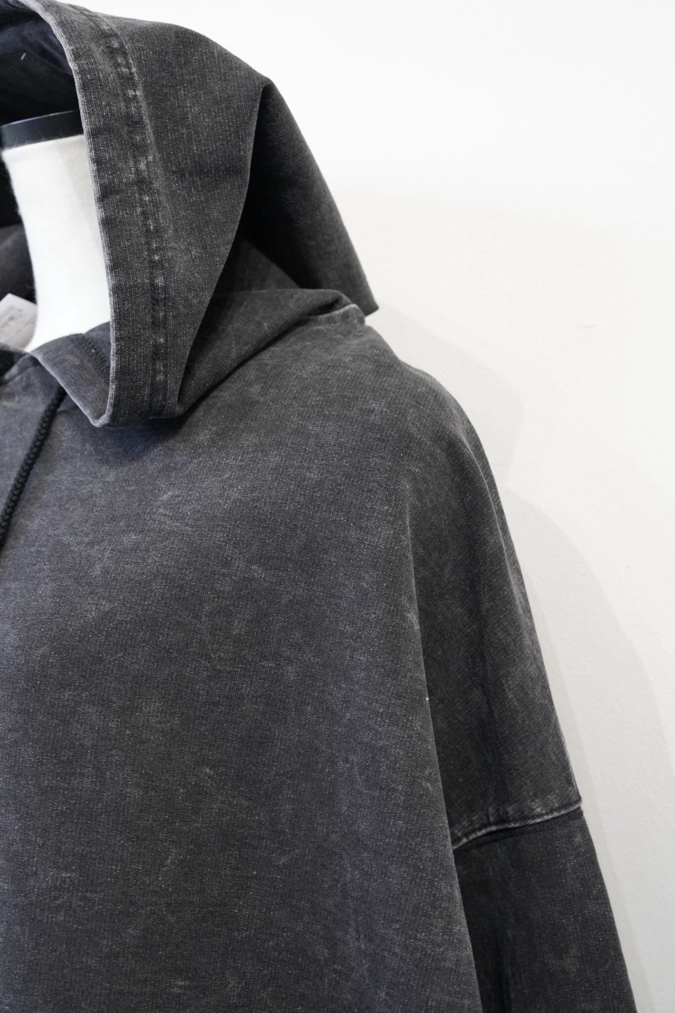 ヴィンテージウォッシュ加工で仕上げた、深みのあるブラックフーディー。