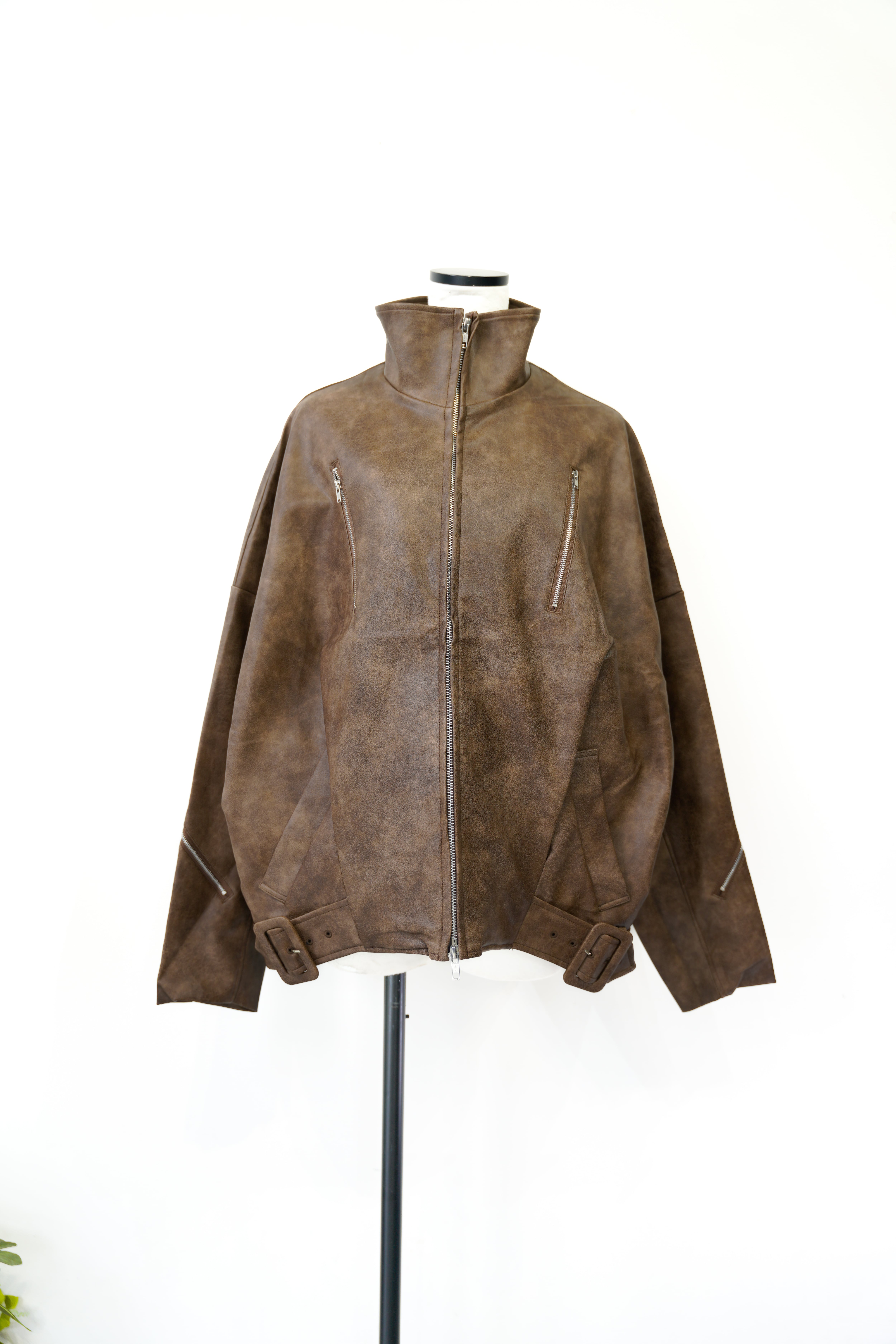 深みのあるパープルカラーが印象的な合皮ライダース。