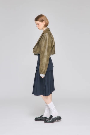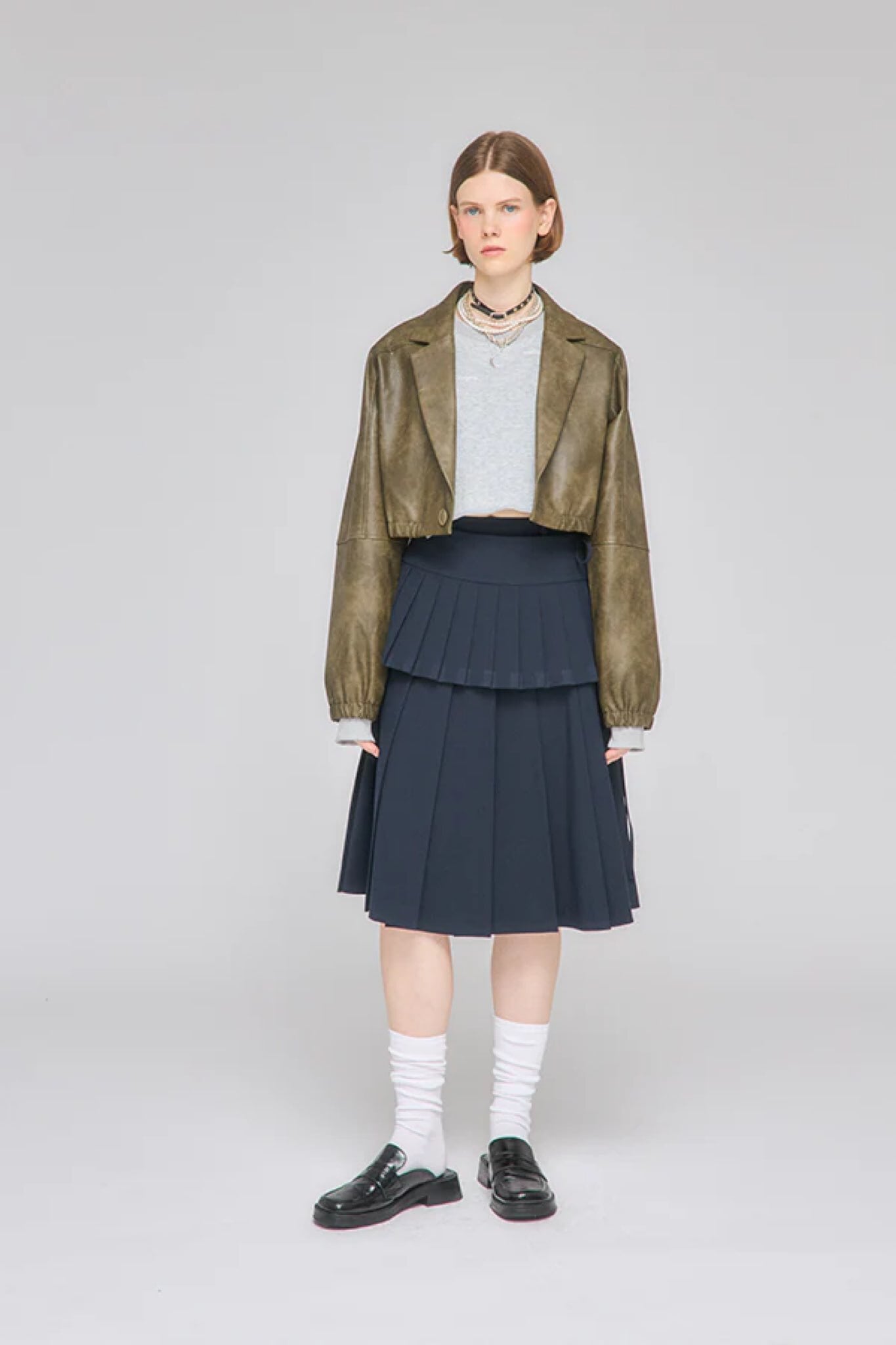 立体的なプリーツと異素材スカートをレイヤードしたようなデザインが印象的なミドル丈スカート。