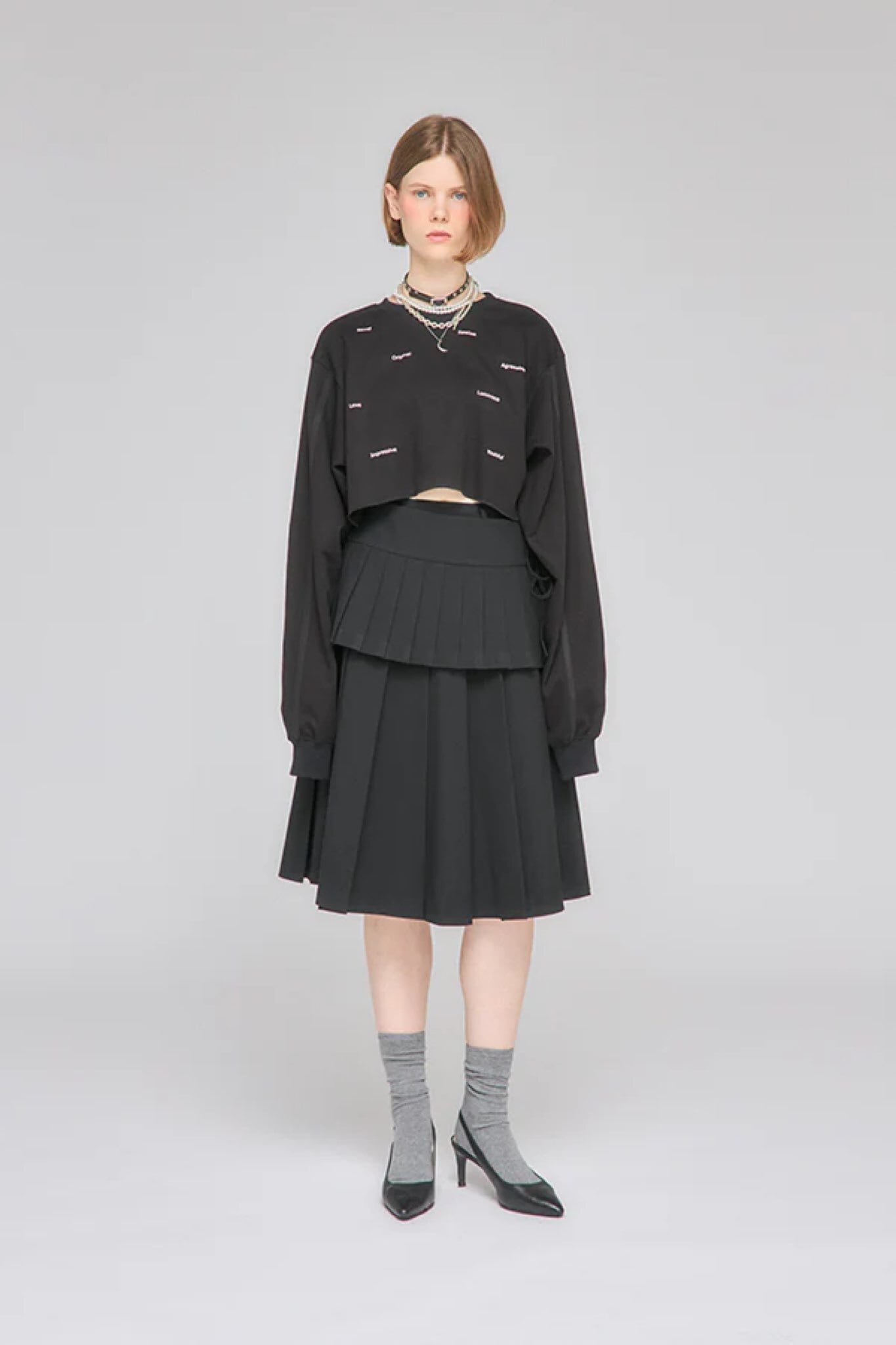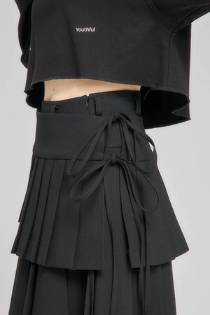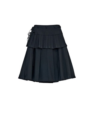 立体的なプリーツと異素材スカートをレイヤードしたようなデザインが印象的なミドル丈スカート。