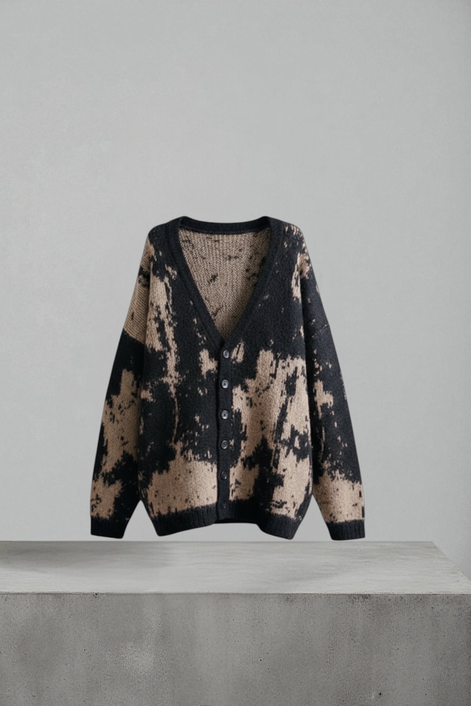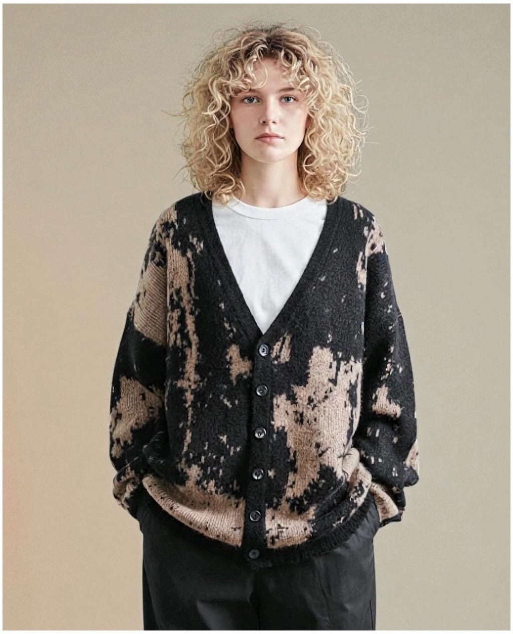 淡いベージュに滲むようなブラックのコントラストが印象的な、ディストーション柄のニットカーディガン。