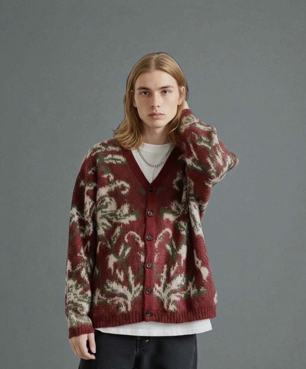クラシカルなボルドーに、オリーブグリーンとアイボリーのボタニカルパターンを掛け合わせたジャカードカーディガン。