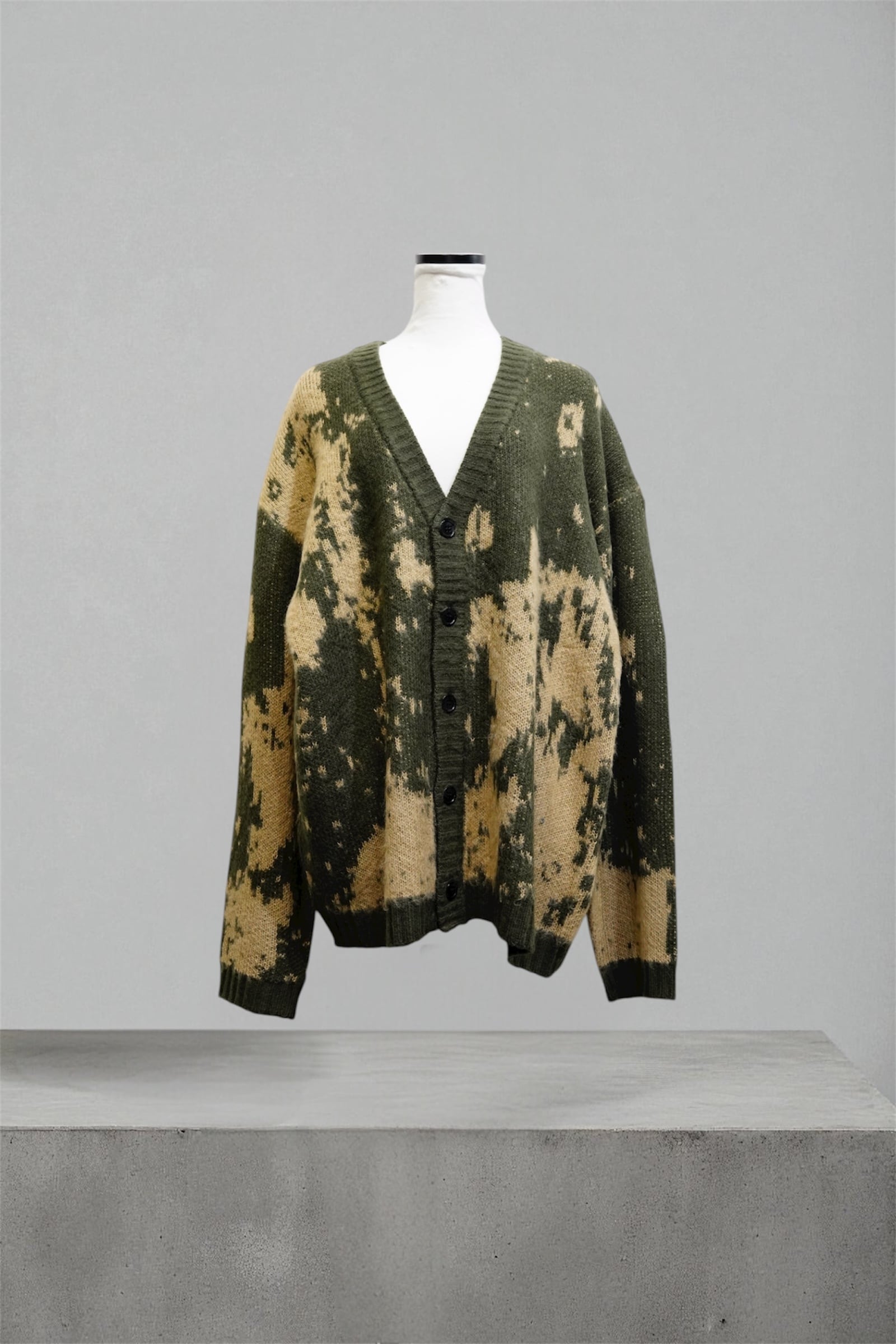 荒れた大地のような質感と色のにじみを抽象化した、ディストーションパターンのニットカーディガン。