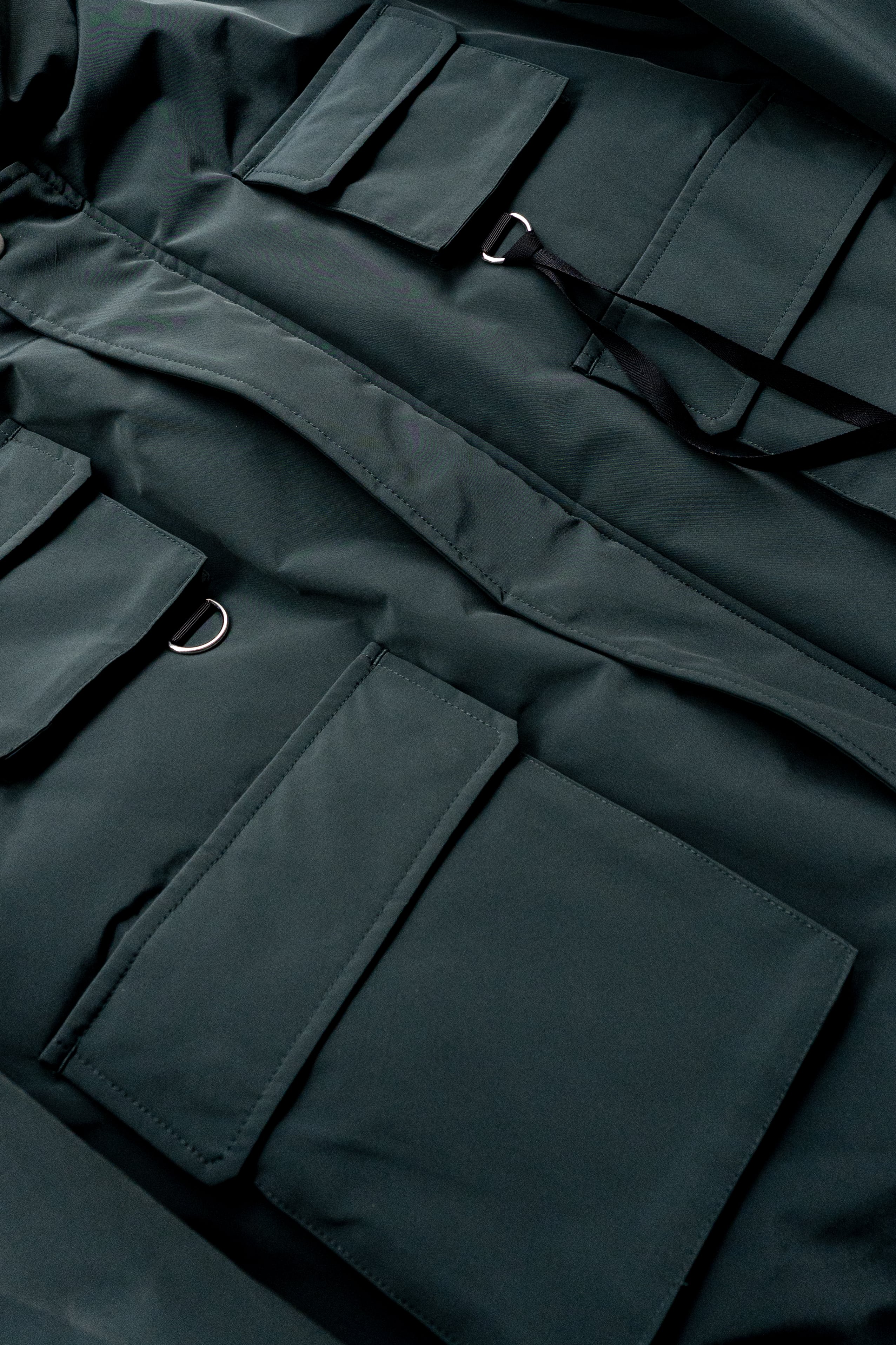 フロントに配した多数のフラップポケットとDカンが機能性を高めながら、シンプルになりすぎない立体的な表情を生み出しています。
