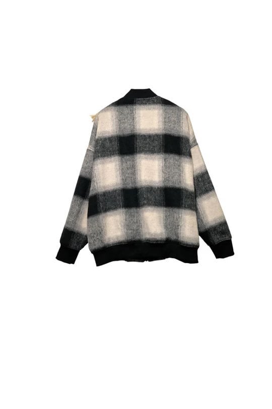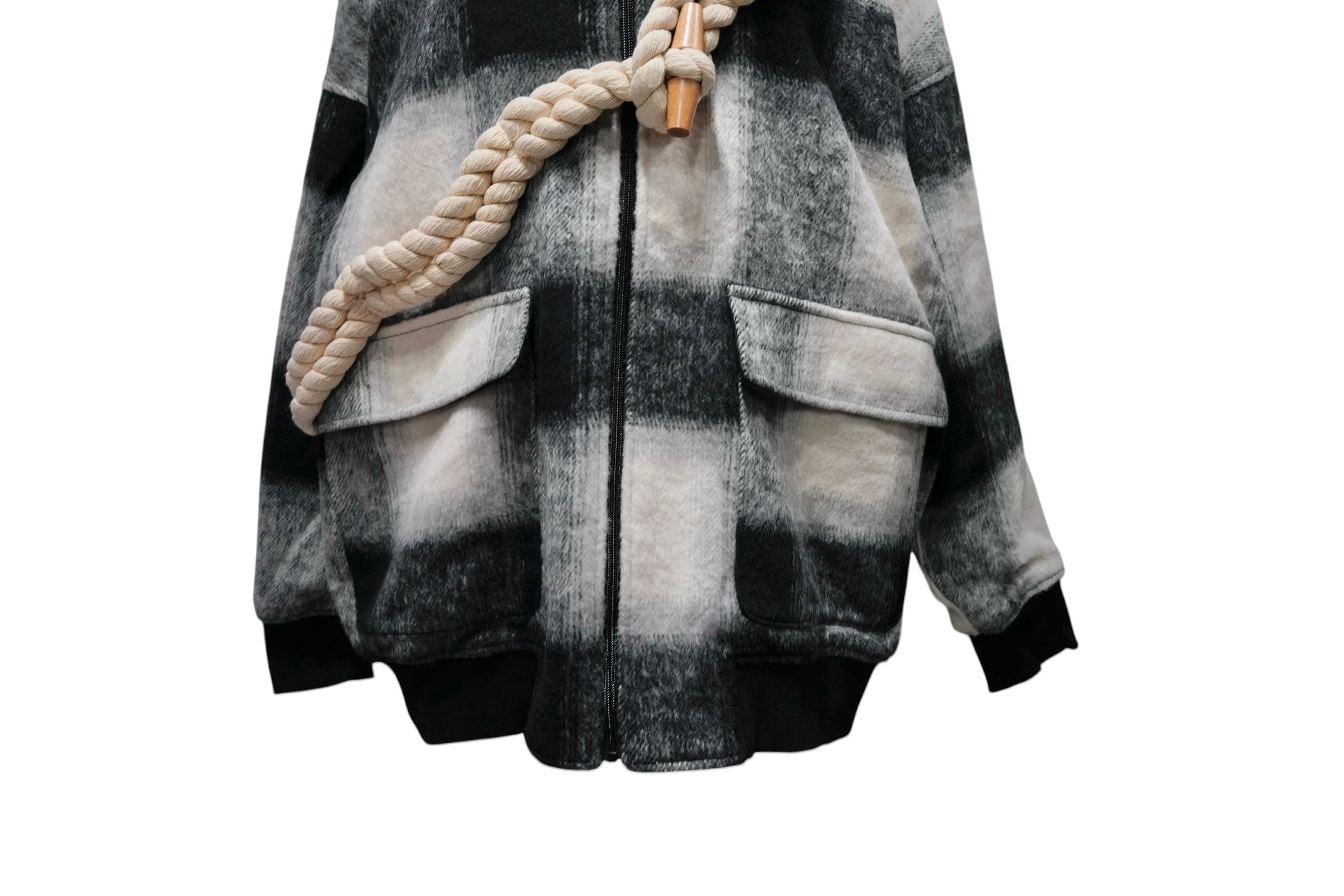ダッフルコートの太紐+トグルディテールを、無骨なMA-1に大胆ミックス。上品なシャギーの質感とオンブレチェックが絶妙に調和し、他にはない存在感を放つ一着です。