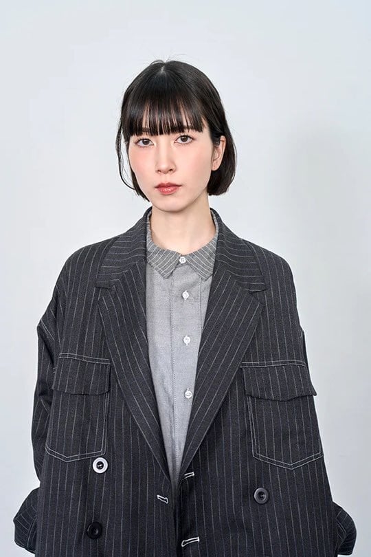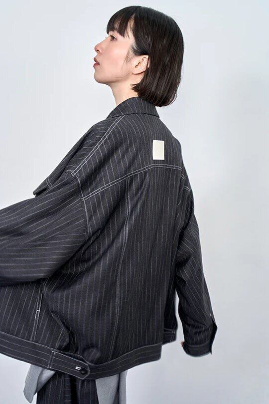 デニムライクなピンストライプ素材を使用したダブルジャケット。かっちりしすぎない