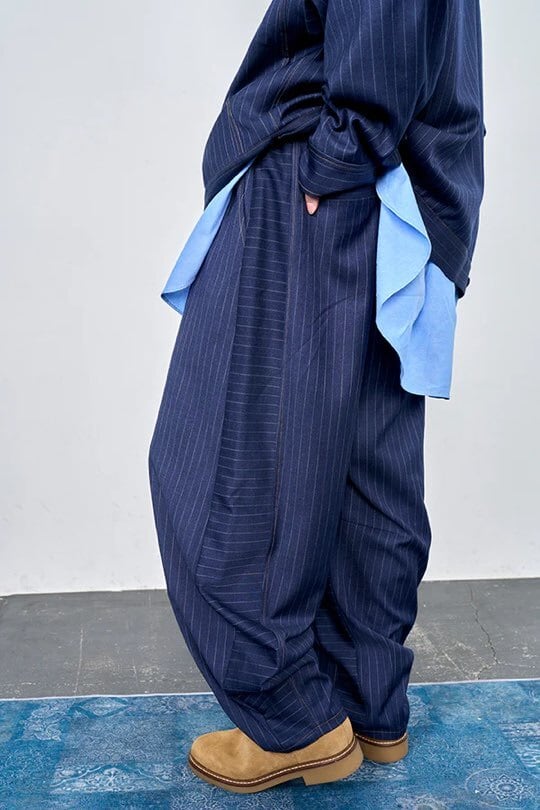 デニムライクなピンストライプ素材を使用したイージーバレルパンツ。 エアロ