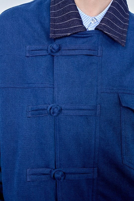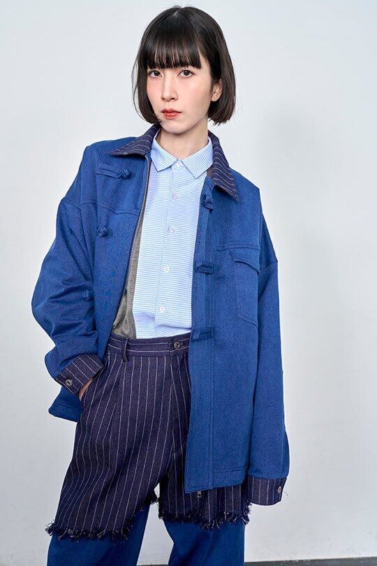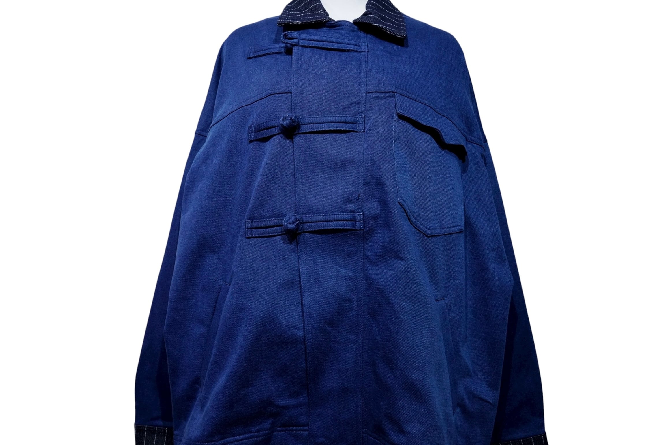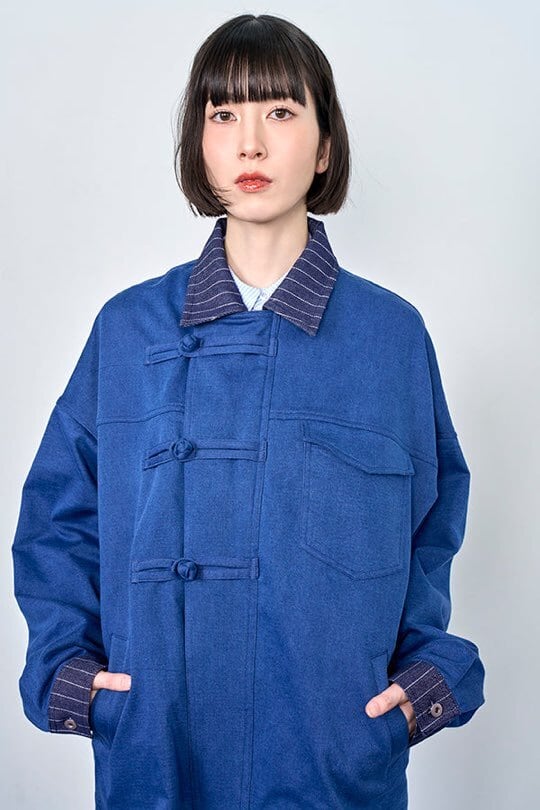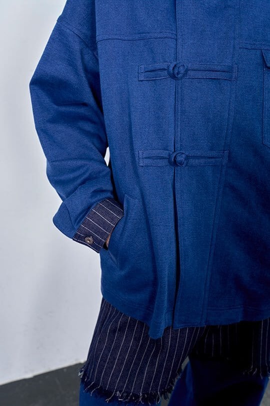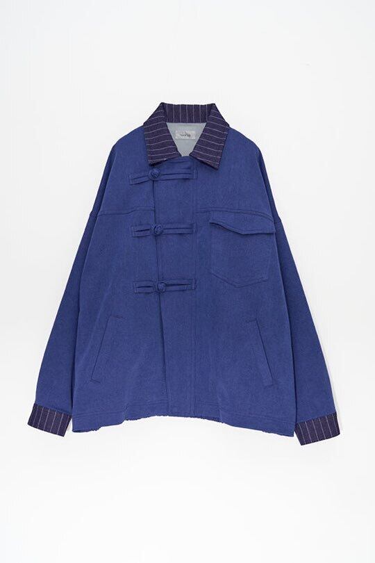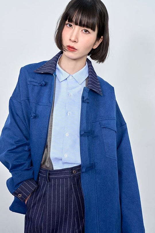 デニムタイプの肉厚スウェット素材を使用した、チャイナディテールのブルゾン。