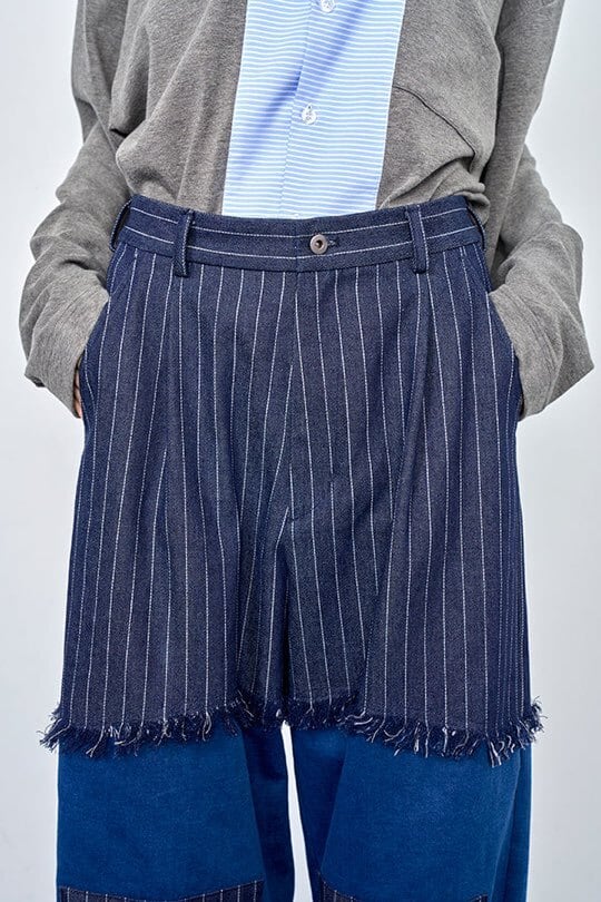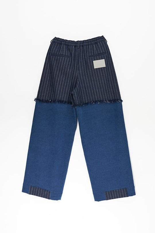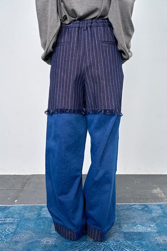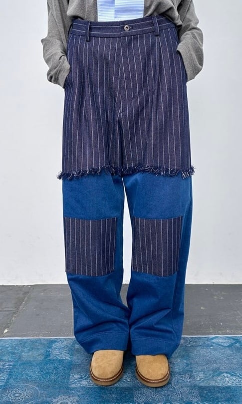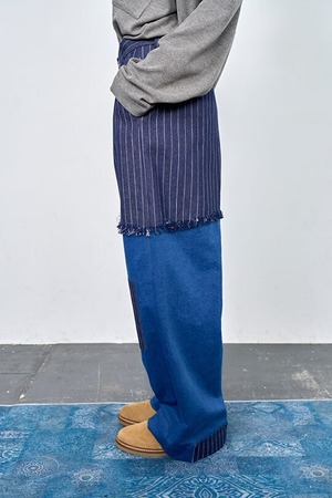 デニムタイプの肉厚スウェット素材をベースに、ストライプ別布を切り替えたデザインパンツ。
