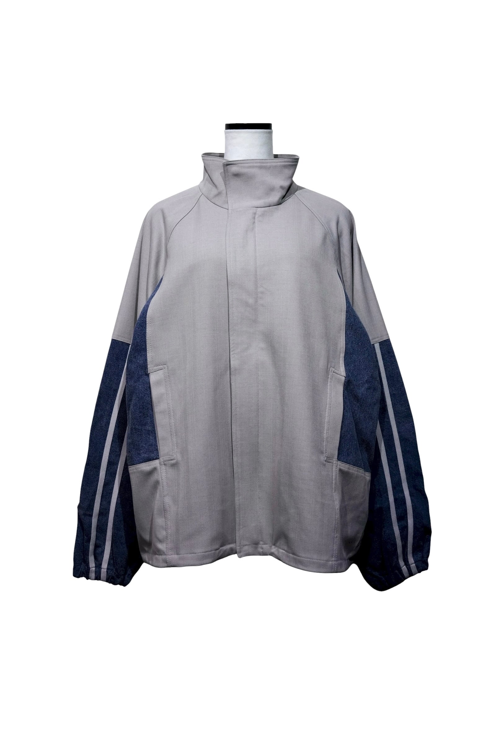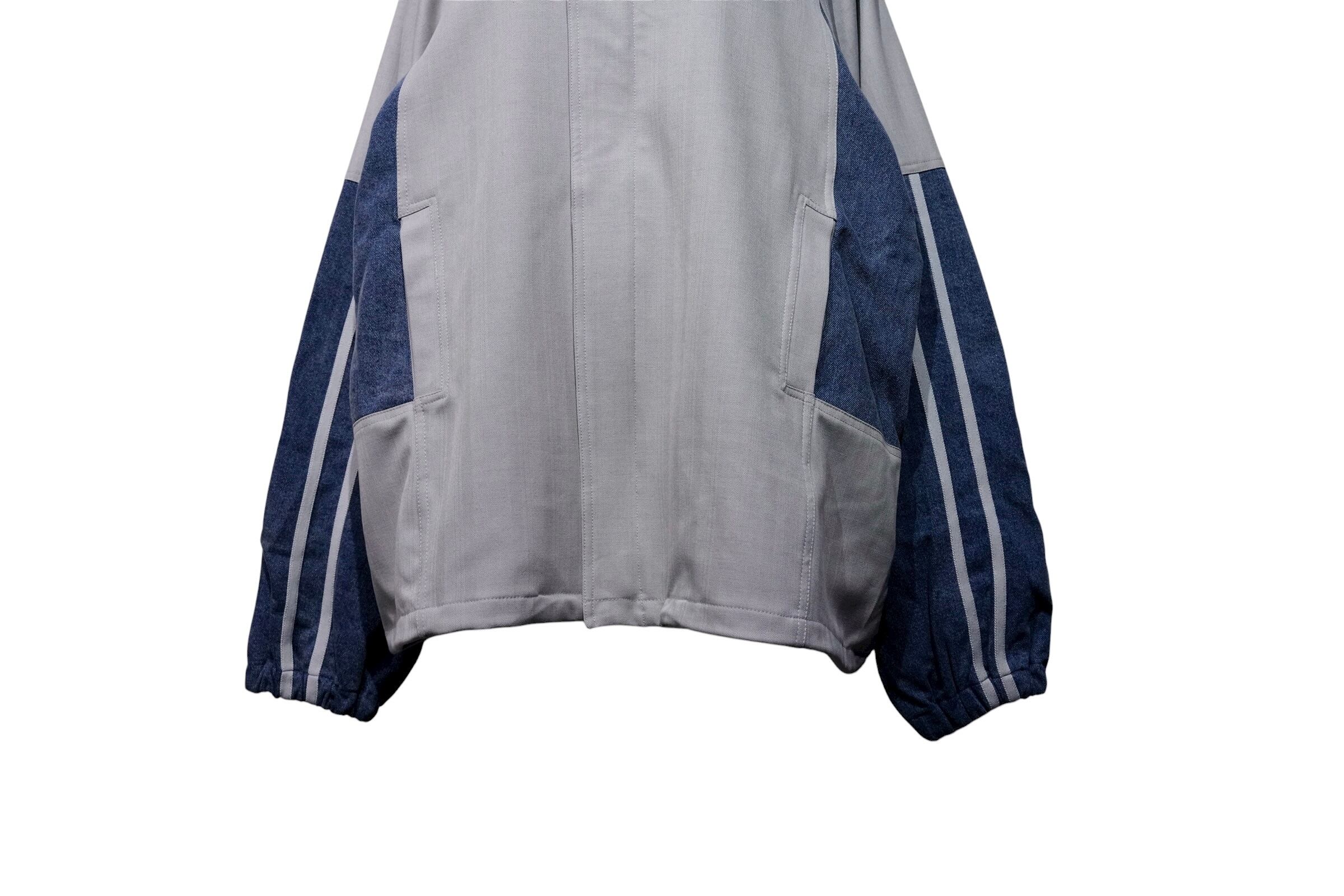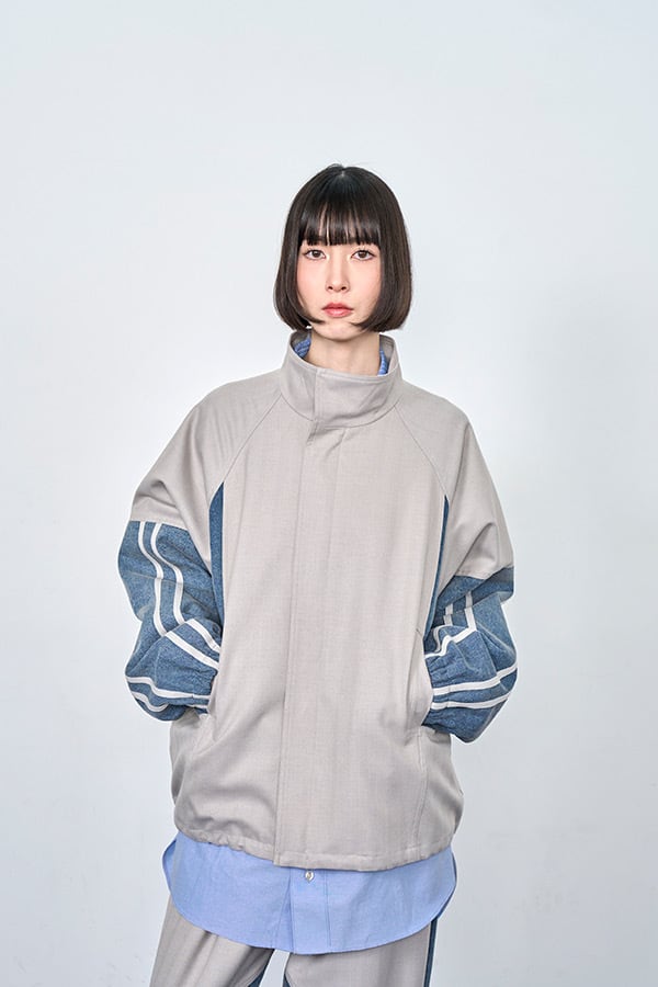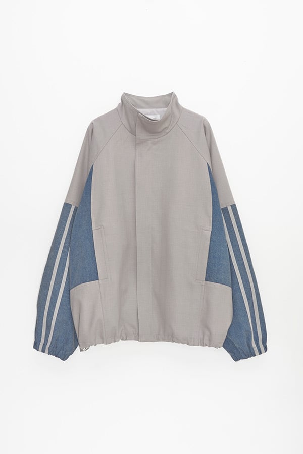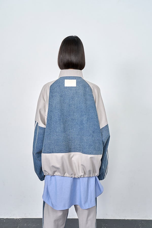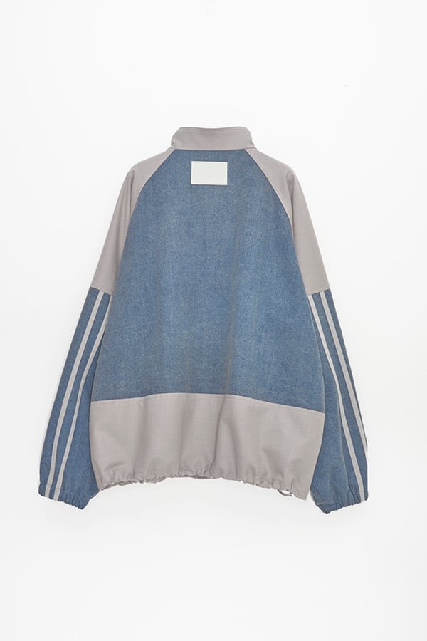 異素材を組み合わせたデニムコンビ仕様のトラックラインブルゾン。