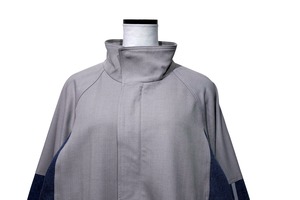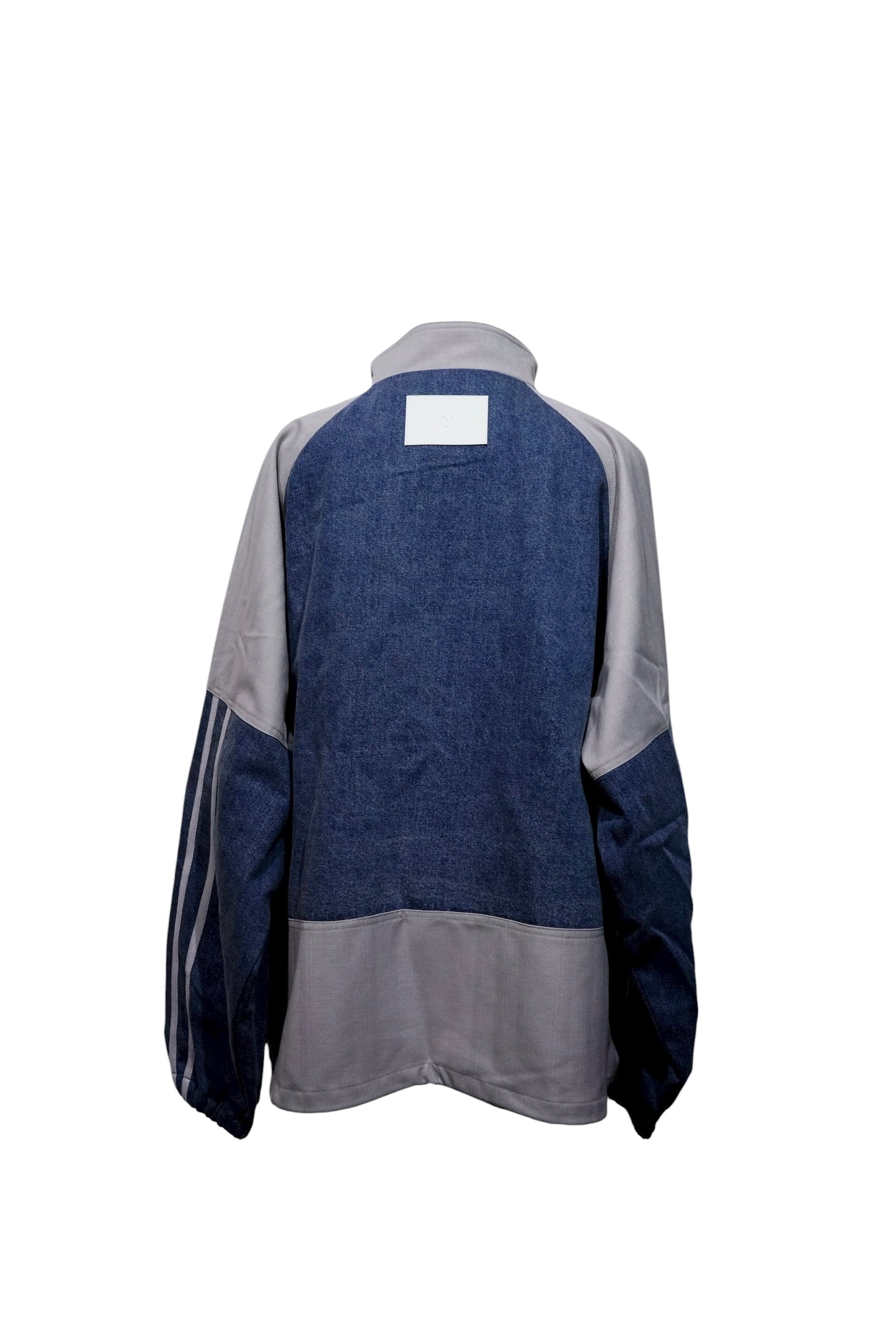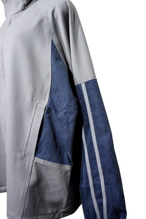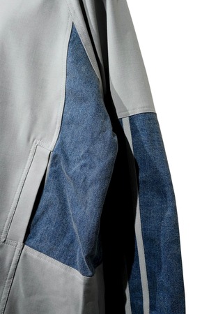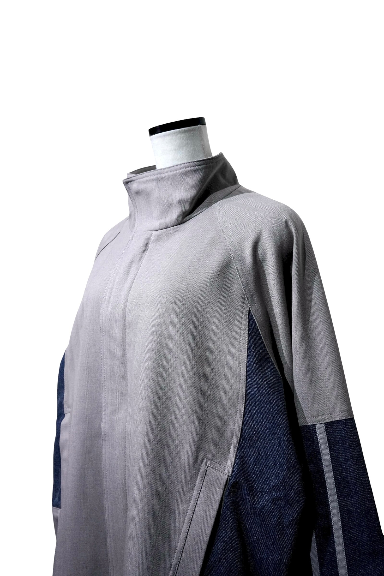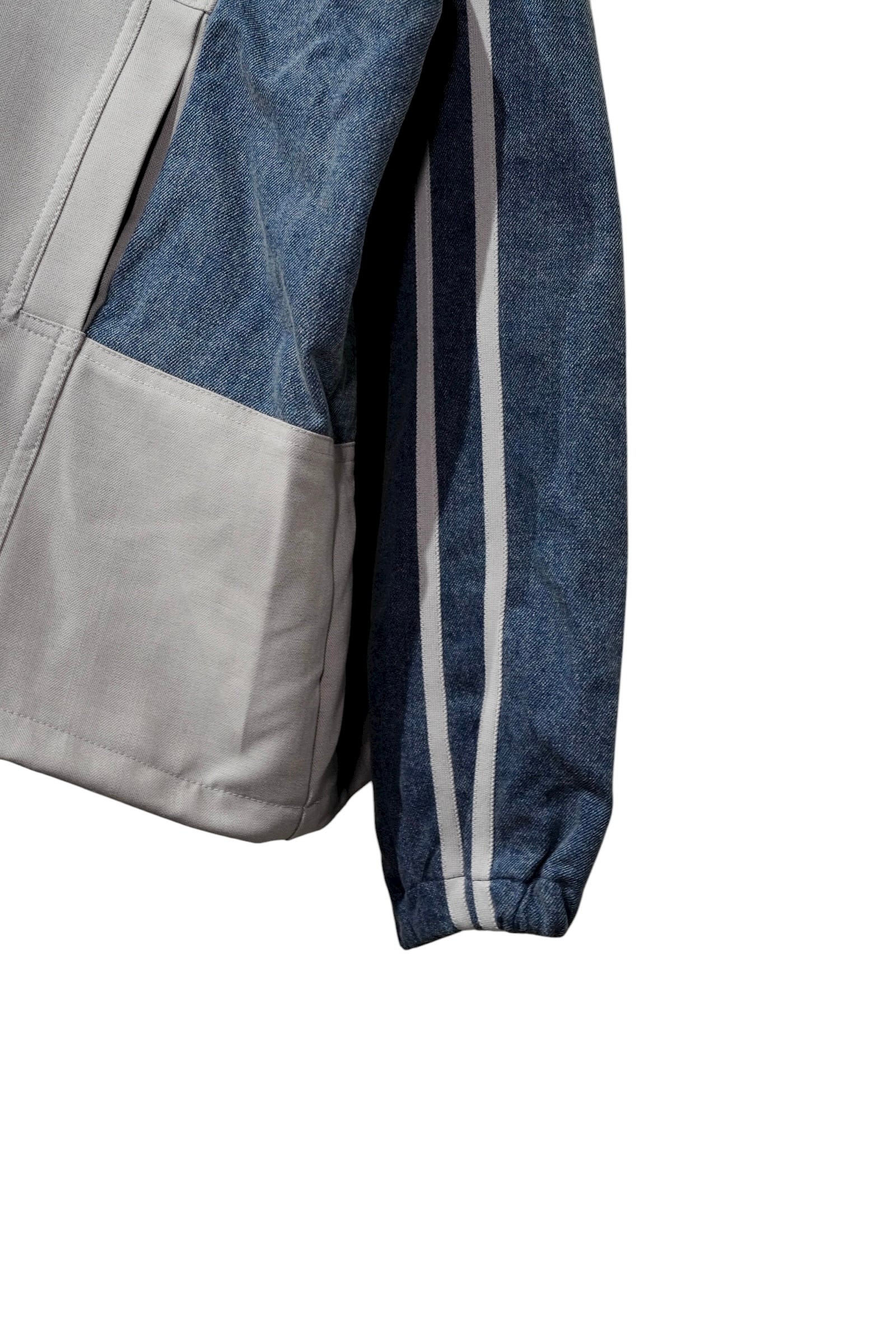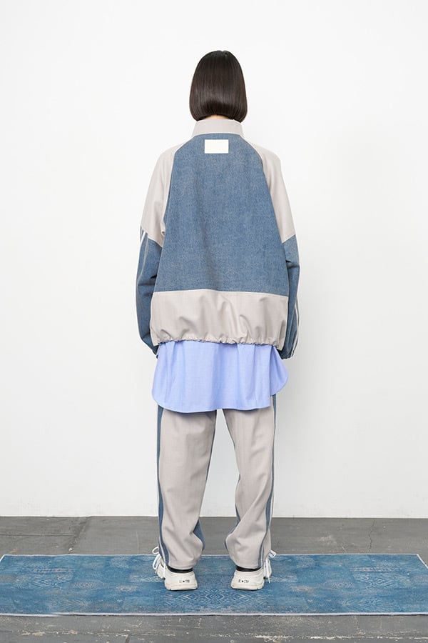 異素材を組み合わせたデニムコンビ仕様のトラックラインブルゾン。