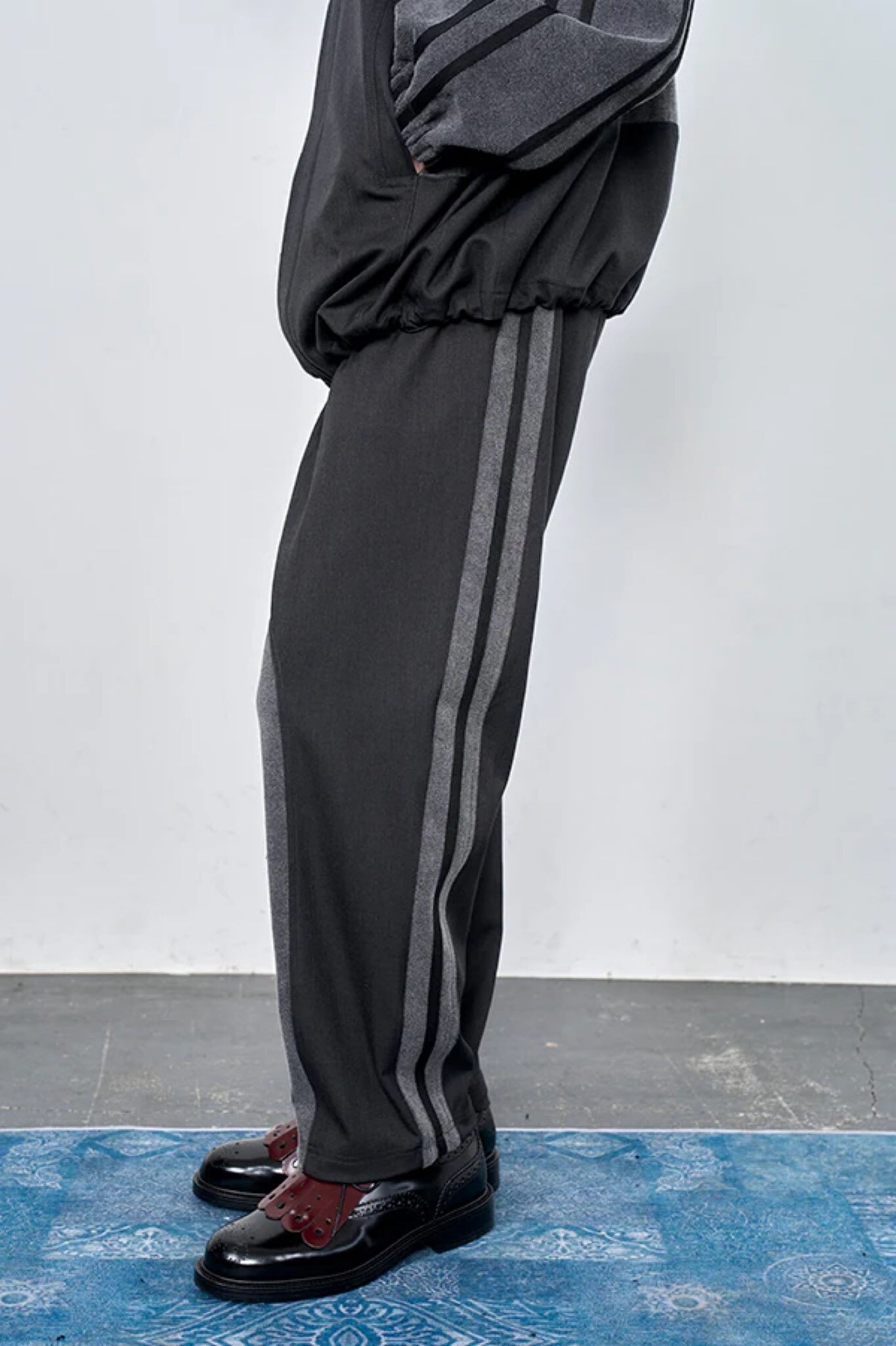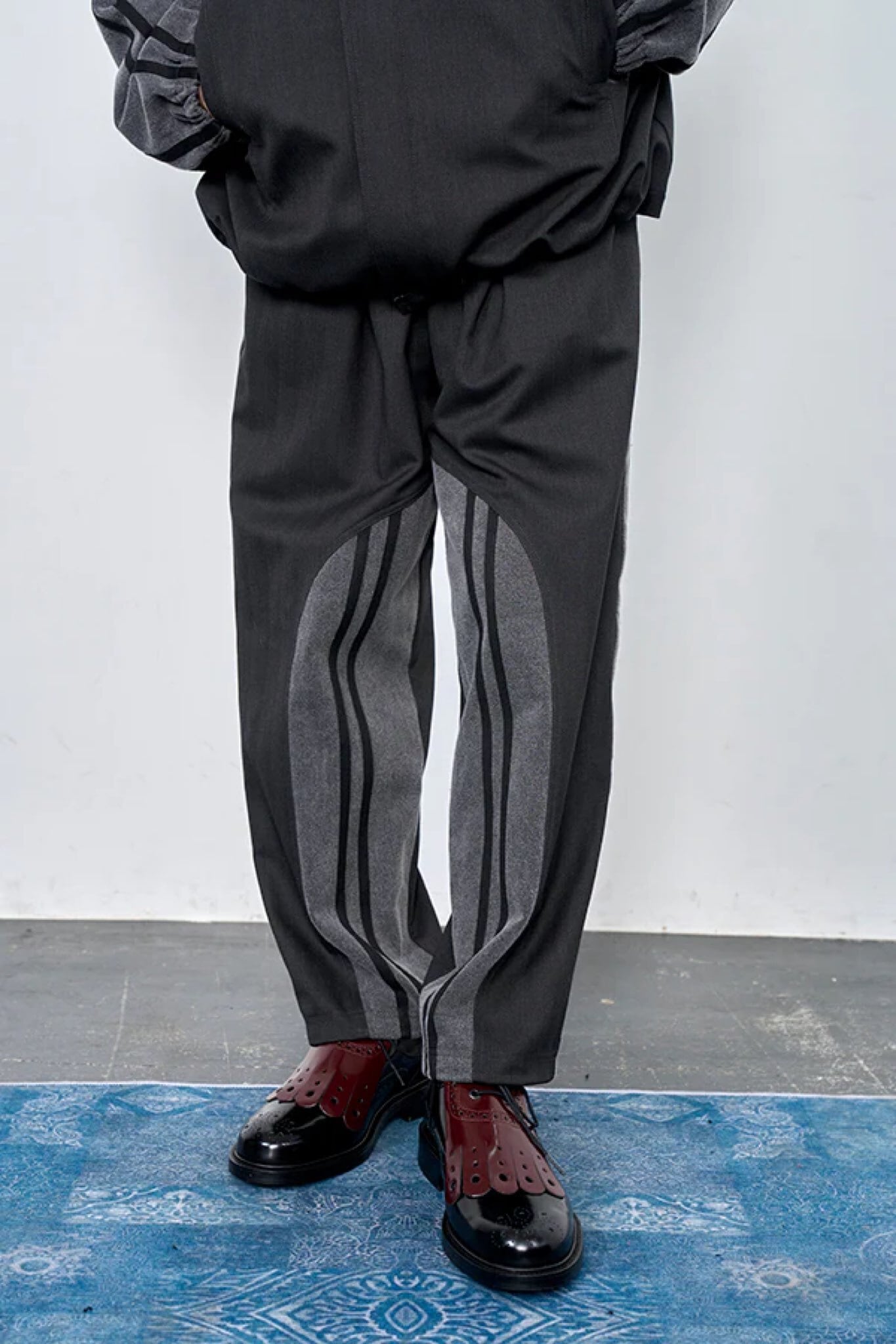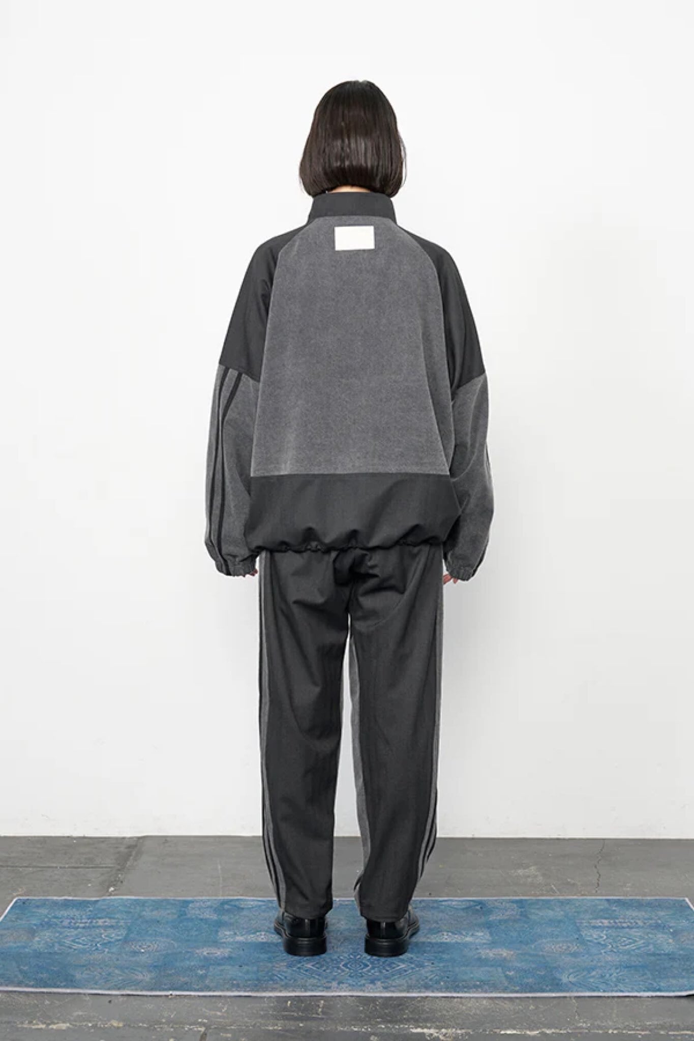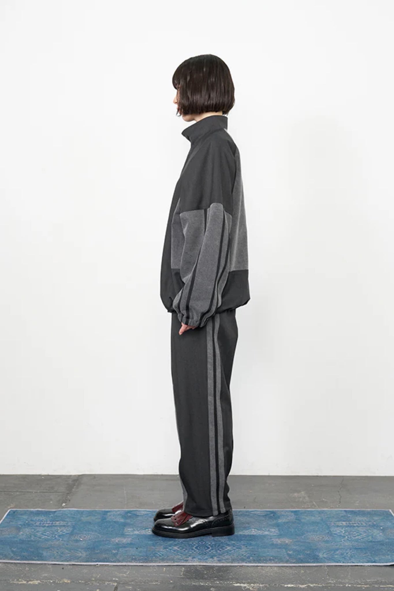 同素材のブルゾンと合わせたセットアップ着用もおすすめ。