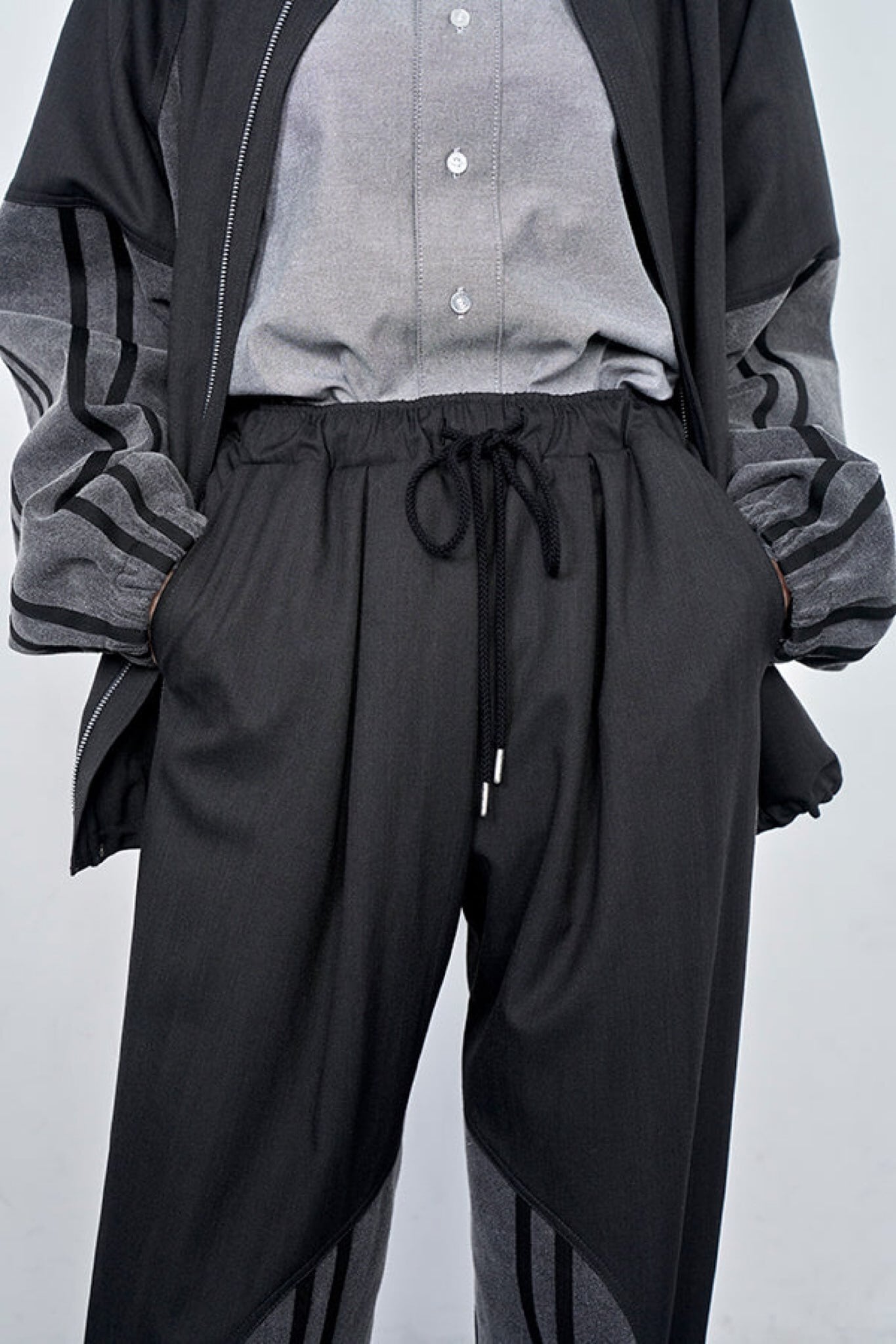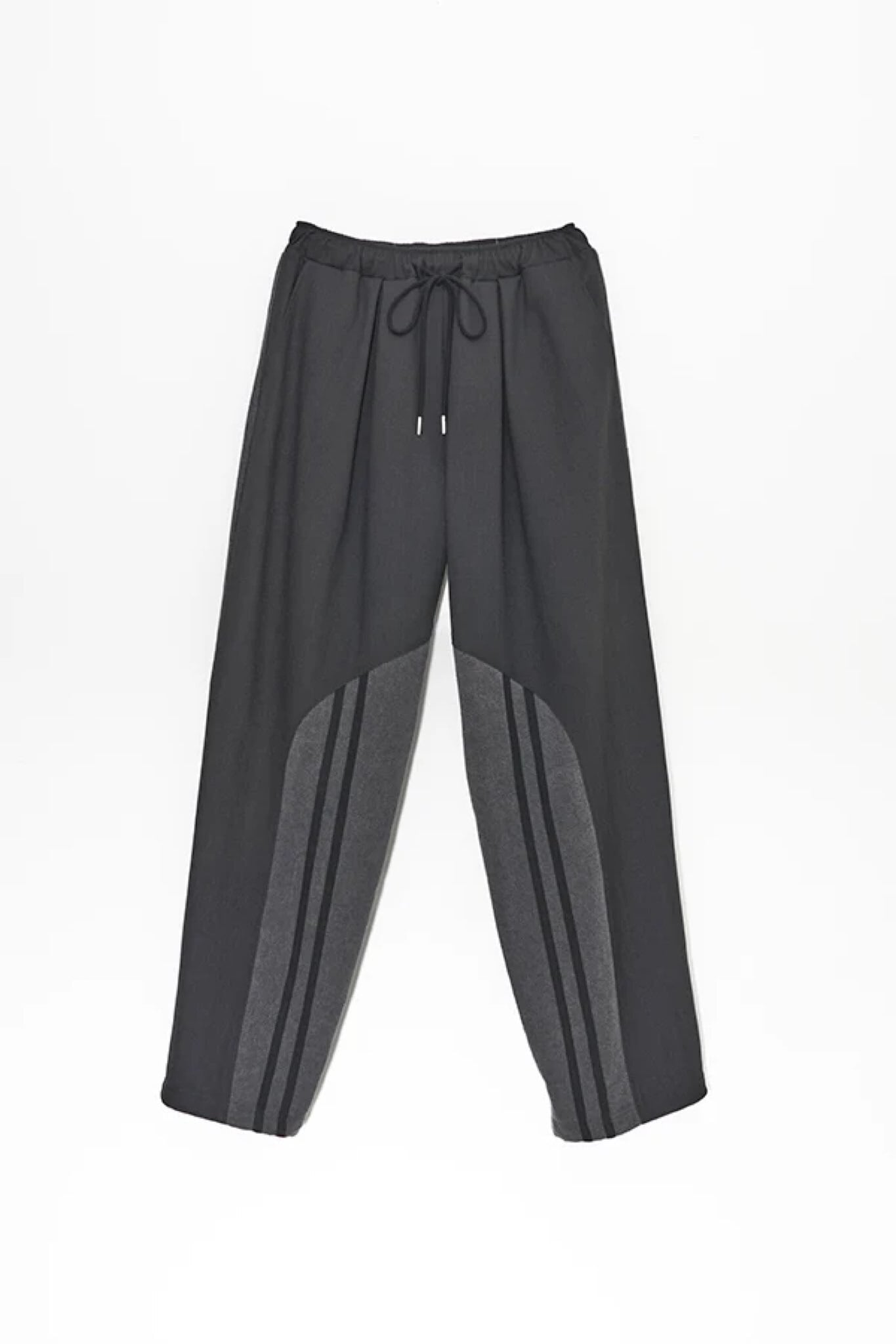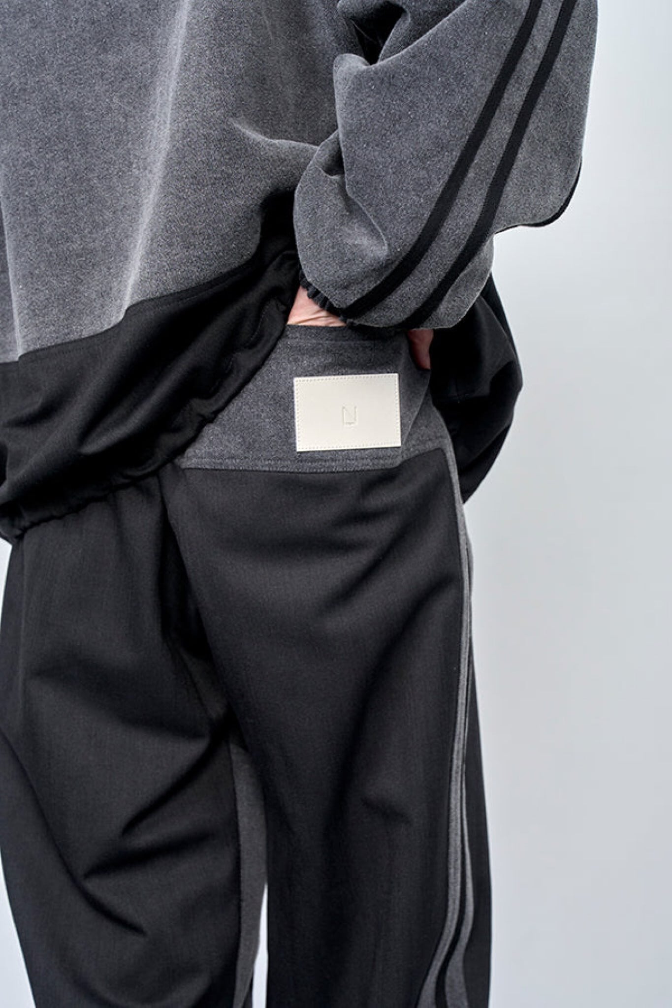 異素材を組み合わせたデニムコンビ仕様のトラックラインパンツ。