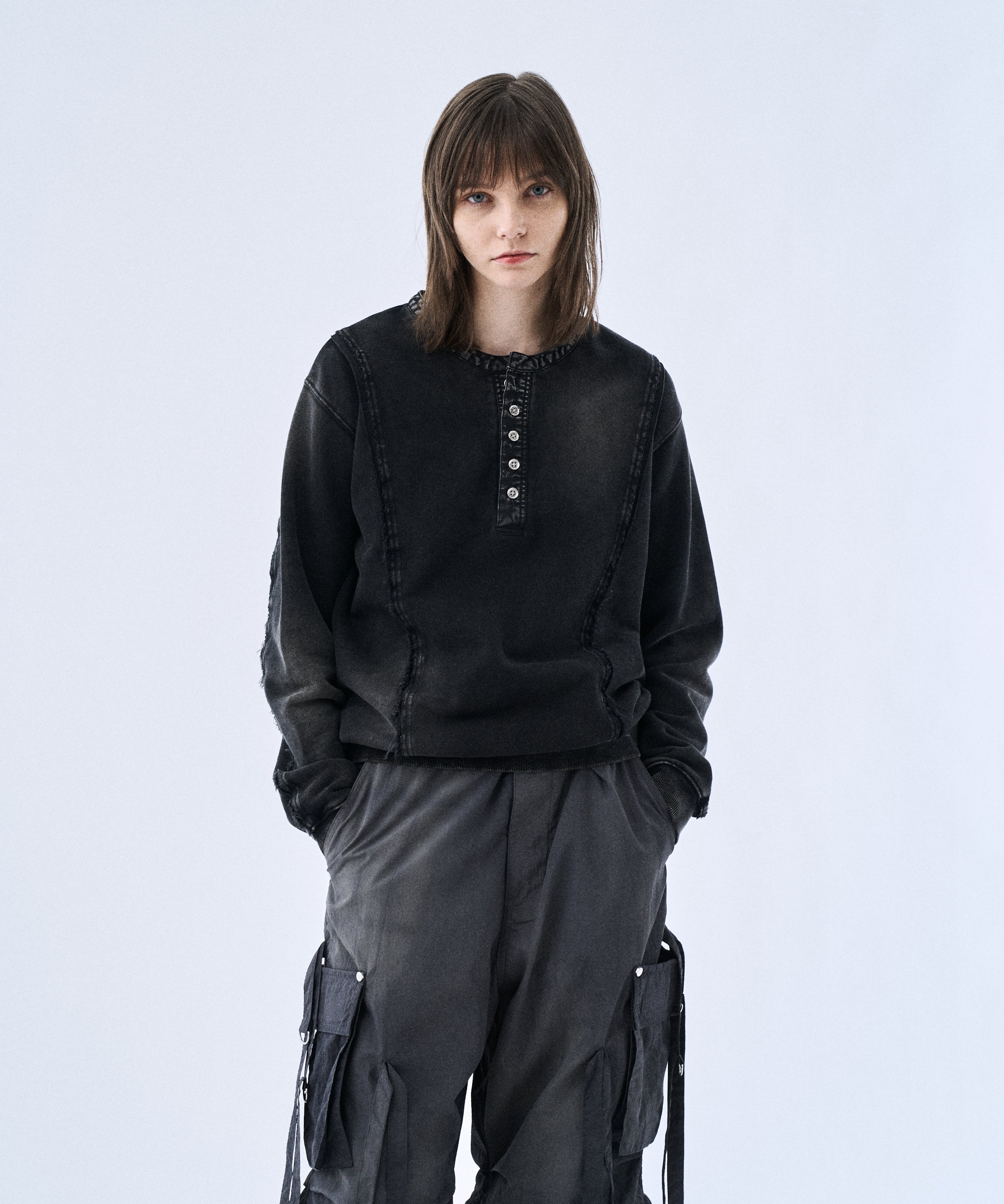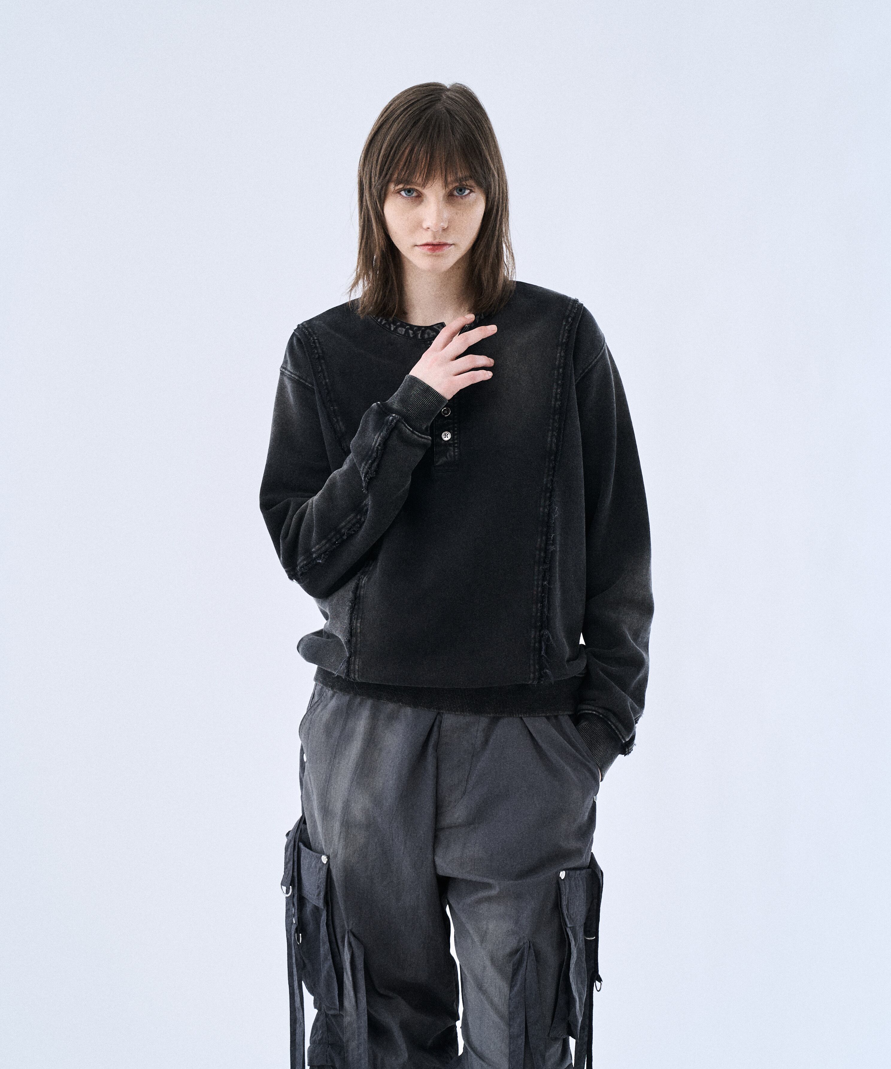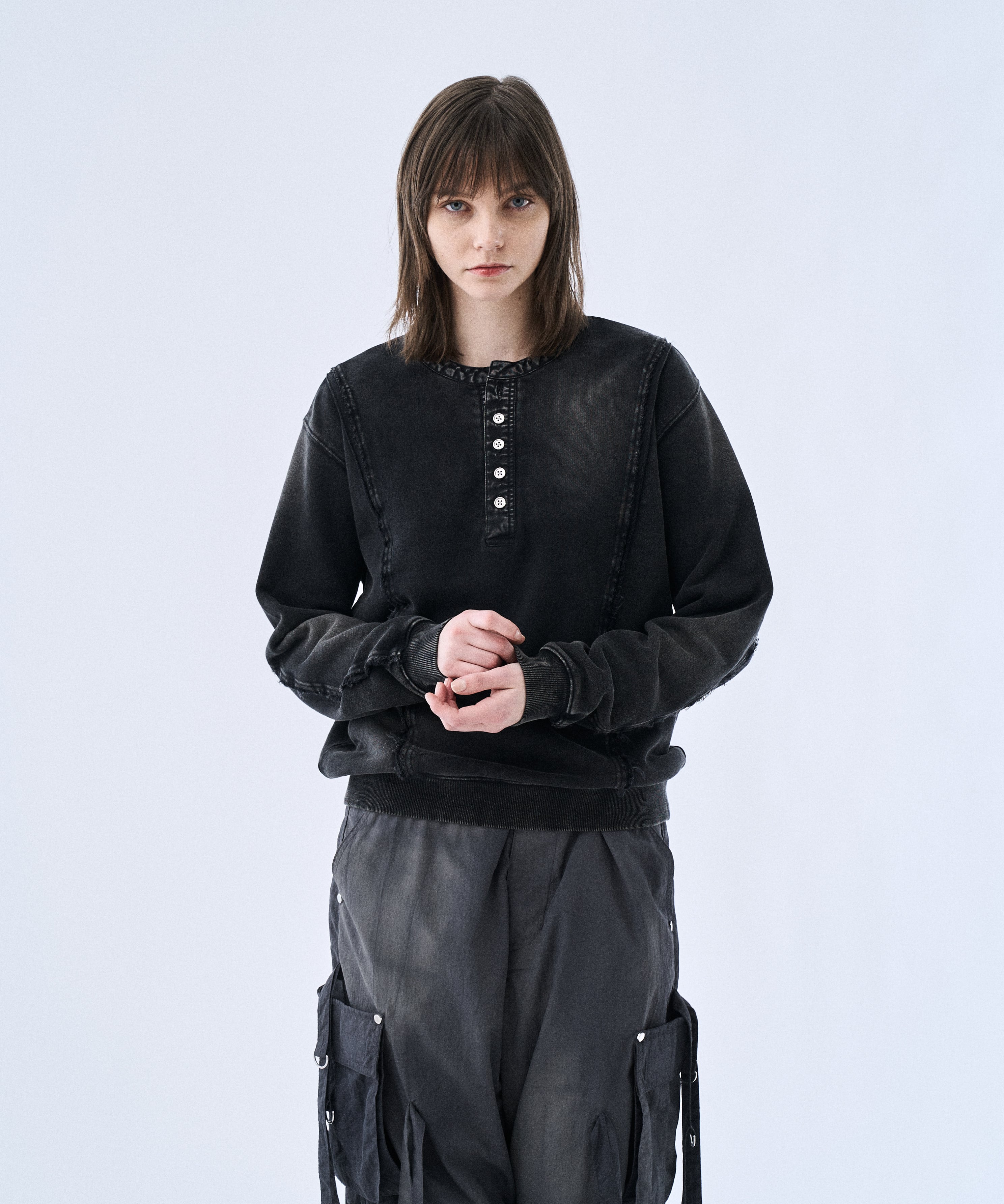 ヴィンテージライクなフェード感と、ヘンリーネックのメタルボタンがアクセントになる「Metal button henly sweat」。スウェットのラフさに、首元のボタンディテールで程よい品を足した一枚です。切替ラインのデザインが立体感を生み、1枚で着てもサマになるバランスに。シャツやタートルをインナーに入れてレイヤードしても良く、秋冬〜春先までロングシーズン活躍します。カラーは深みのあるNavyと、引き締まるBlackの2色展開。